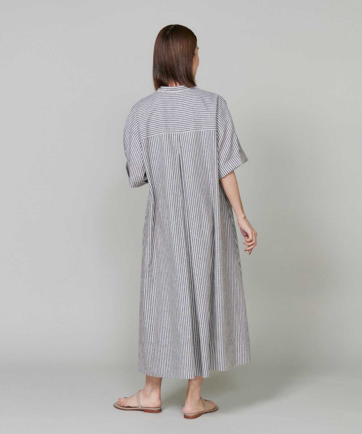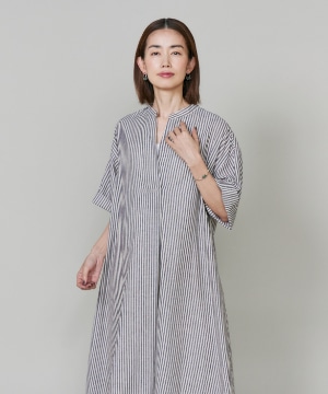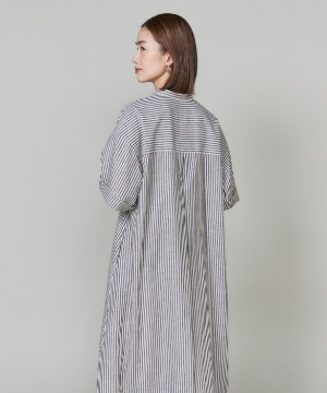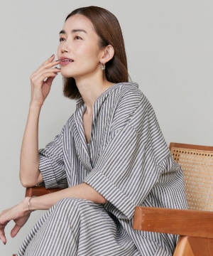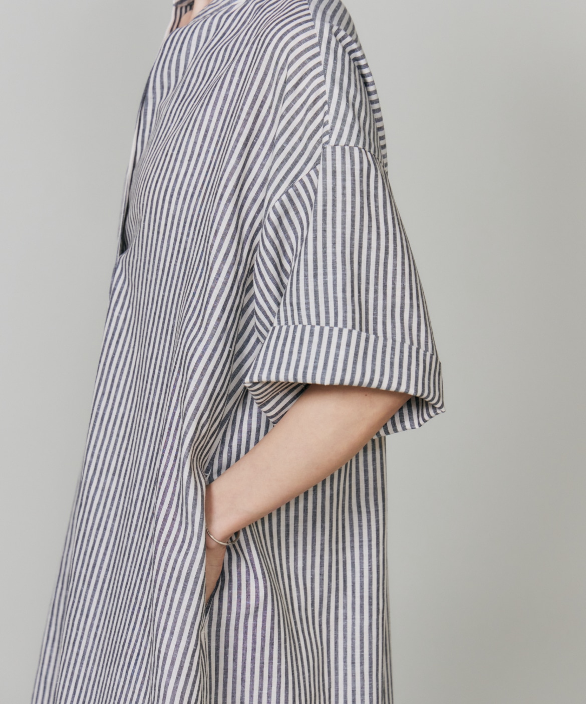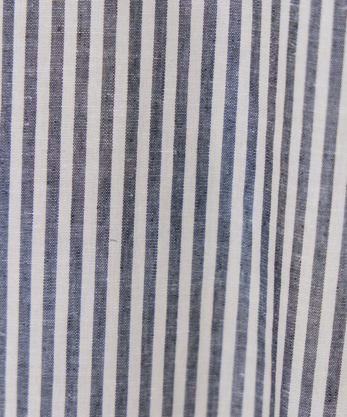 ポリエステルとヘンプの混紡糸を使用したストライプ素材。ヘンプ特有のドライなタッチを残しつつ、タンブラー加工を施すことでソフトに仕上げています。ナチュラルな表面感がありながら、程良いしなやかさと落ち感をあわせ持ち、心地良く着用できる素材です。存在感のある爽やかなストライプがポイント。