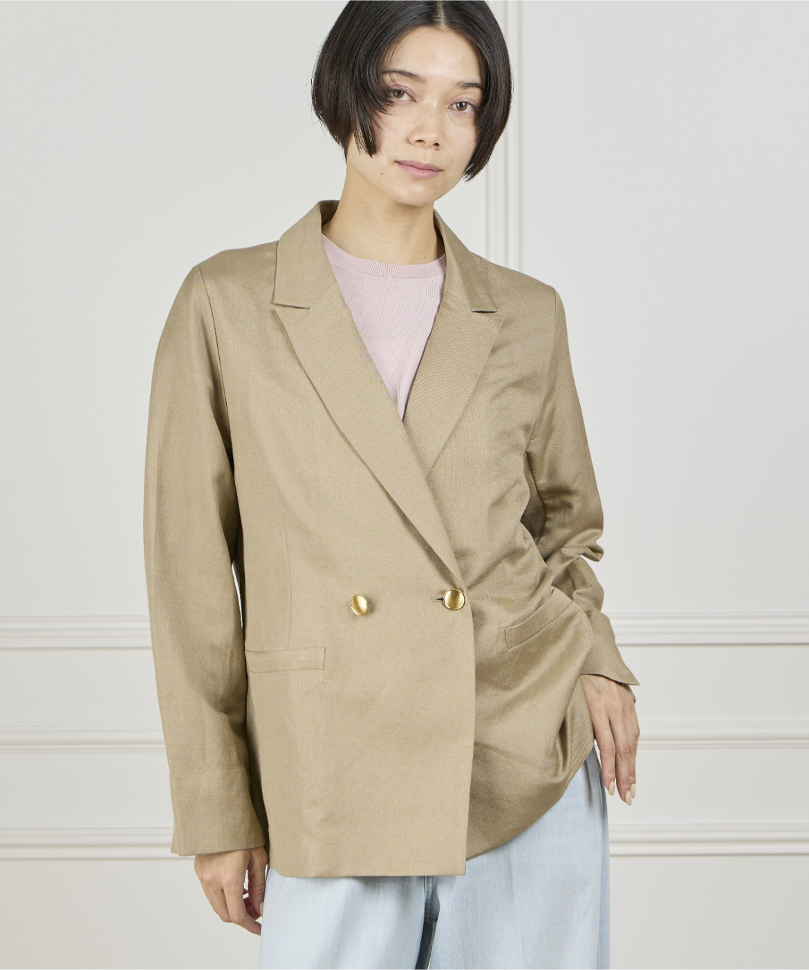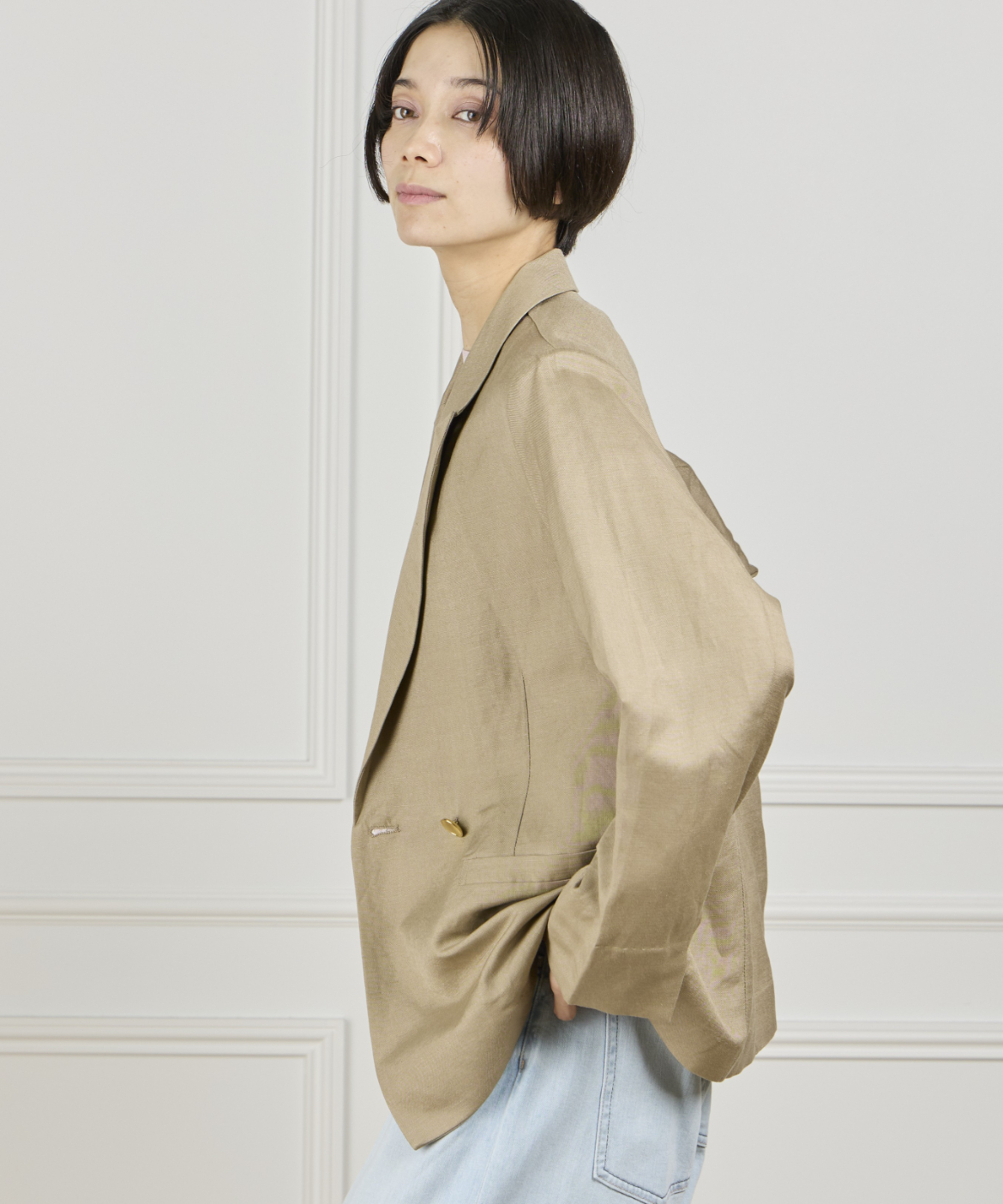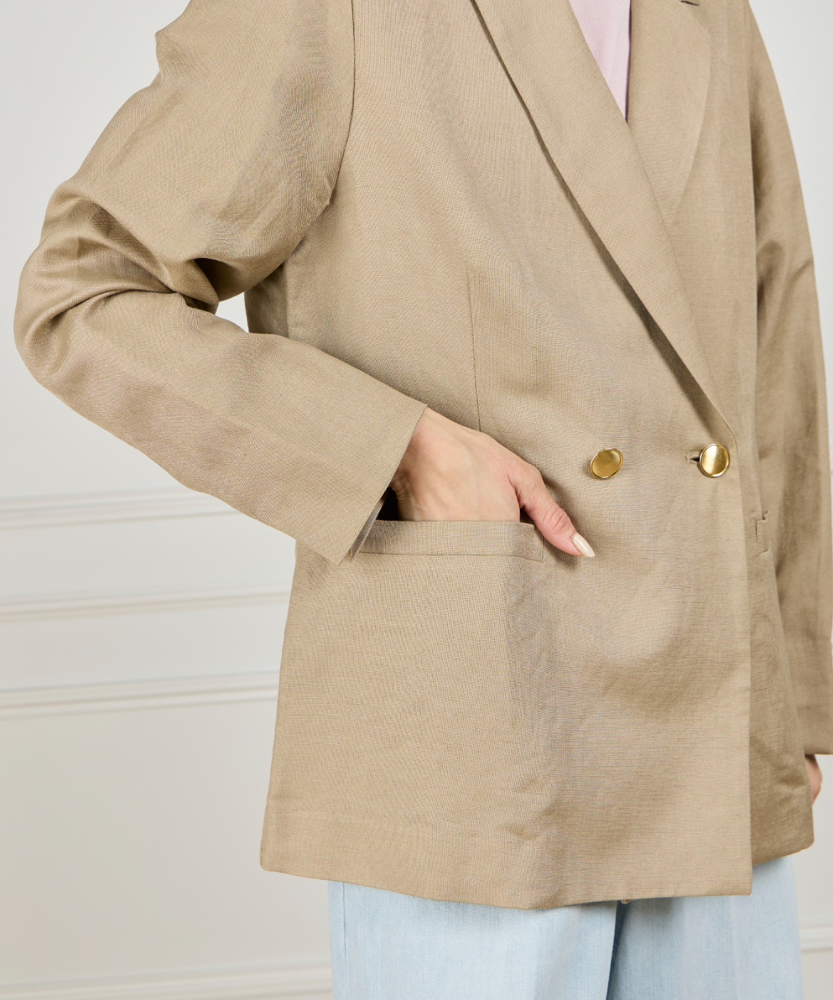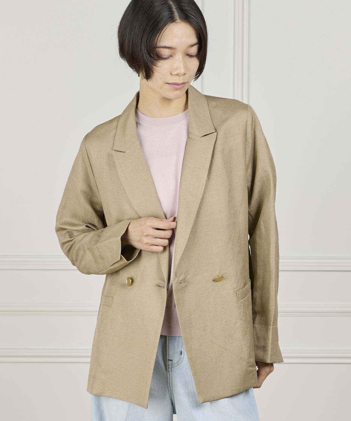 洗練された抜け感を演出する、軽やかな麻調素材のダブルジャケット