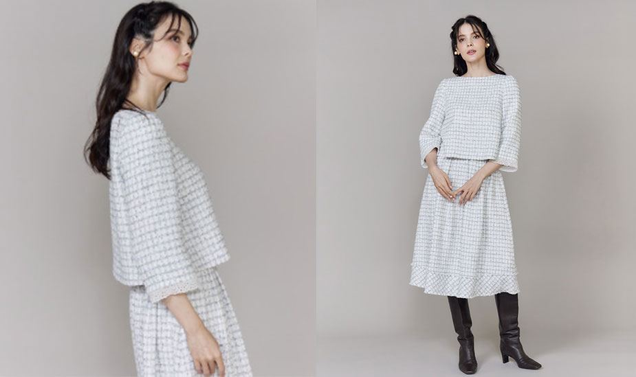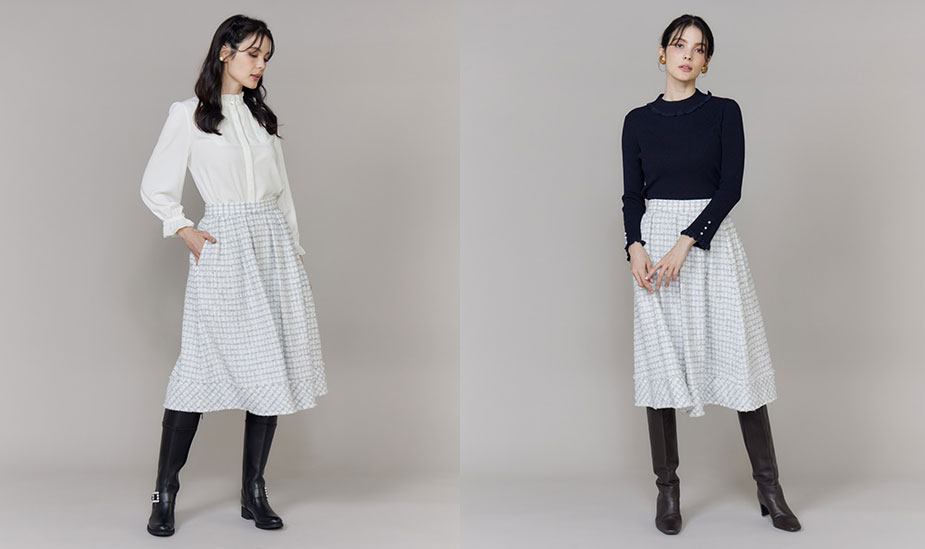 ブラウスと同素材で作成したツイードスカートは、お腹周りをすっきり見せるタックに綺麗なフレアシルエットが女性らしい一着。裾の切り替えをバイヤスにしたデザインが目を惹きます。