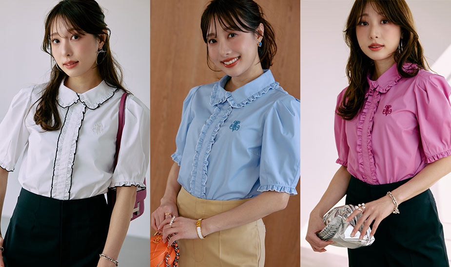 襟や前立て、袖口にあしらった小ぶりなフリルとメローがさりげない表情を添え、甘さを抑えながらも華やかで上品な印象に仕上げたブラウス。夏の日差しに映える華やかなチェリーピンクはWEB・POPUP限定カラーになります。