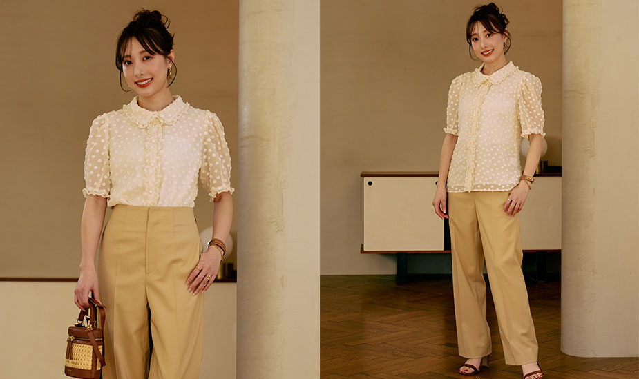 程よい透け感に立体的なドットジャガードを重ねたシアーブラウスは、軽やかさと今らしさを兼ね備えた一枚。身頃には裏地を重ね、袖は透け感を活かすことで抜け感のある表情に仕上げました。柔らかなクリーム寄りのオフホワイトが顔まわりを優しく明るく見せてくれます。