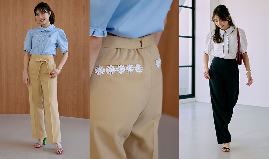 美しいシルエットを追求したハイウエストのストレートラインで、スタイルアップ効果も期待できます。取り外し可能なサッシュベルト付きで、リボンを結べばウエストにメリハリが生まれ、女性らしい着こなしに。きちんと感がありながらも、季節感あふれる軽やかなコーディネートを楽しめます。