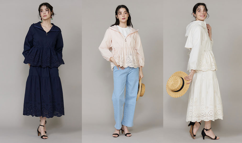 華やかなボーラーレースに細やかなアイレット刺繍を施した特別感のあるラッシュガードシリーズです。