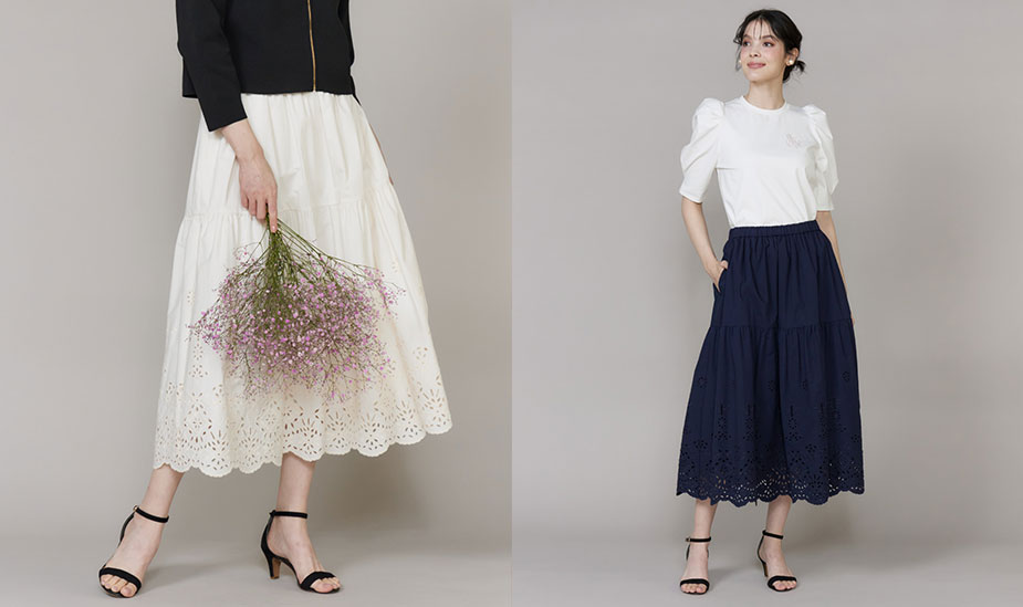 生地を贅沢に使用したティアードスカートは、裾をスカラップデザインにすることで軽やかで華やかな印象に仕上げました。ブルゾンとセットアップのコーディネートがおすすめです。