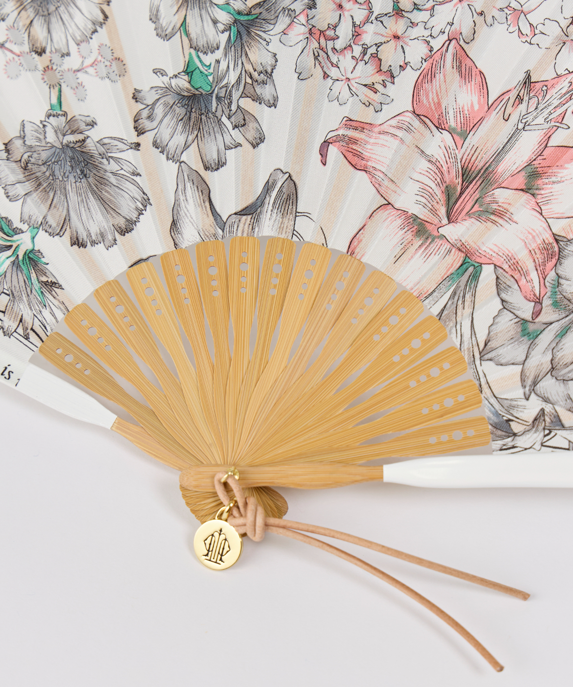manipuriの扇子は、素材をシルク100%にアップデートし、より上質な仕上がりとなりました。プリントとロゴの刻印入りで、風が集まりやすくなるようにバンブーのフレームがセンターが高くなった扇型のデザインになっております。職人が一本づつ仕上げた扇子で、上品なゴールドのチャームと革紐がポイントです。