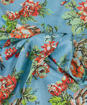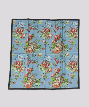 このスカーフは、柔らかく厚手のシルクで作られています。プリントは、Tapis Noirのアンティーク生地アーカイブから厳選された、18世紀後半のフランスの生地です。生地は非常に柔らかく、美しいマットな質感です。Tapis Noirのツイルスカーフはすべて両面にプリントが施されているため、折り方に関係なく、プリントが鮮明で印象的に見えます。縁は手作業で巻き縫いされており、時間のかかる工程ですが、スカーフに非常に美しい裾を与えています。