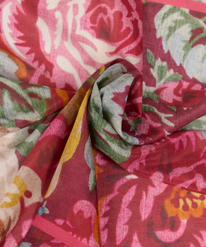 このスカーフは、柔らかなコットンとシルクをブレンドした軽やかな素材で仕立てられています。プリントは、1910年代のスペインのテキスタイル見本帳をもとに、サルバドール・ダリの従妹であり、著名なインテリアデザイナーでもあったモンセラ氏のファブリック帳から着想を得て、Tapis Noirのアンティーク生地アーカイブより厳選。縁は手作業で丁寧に巻き込み縫製しており、時間と手間をかけることで、スカーフに美しい裾の表情を生み出しています。