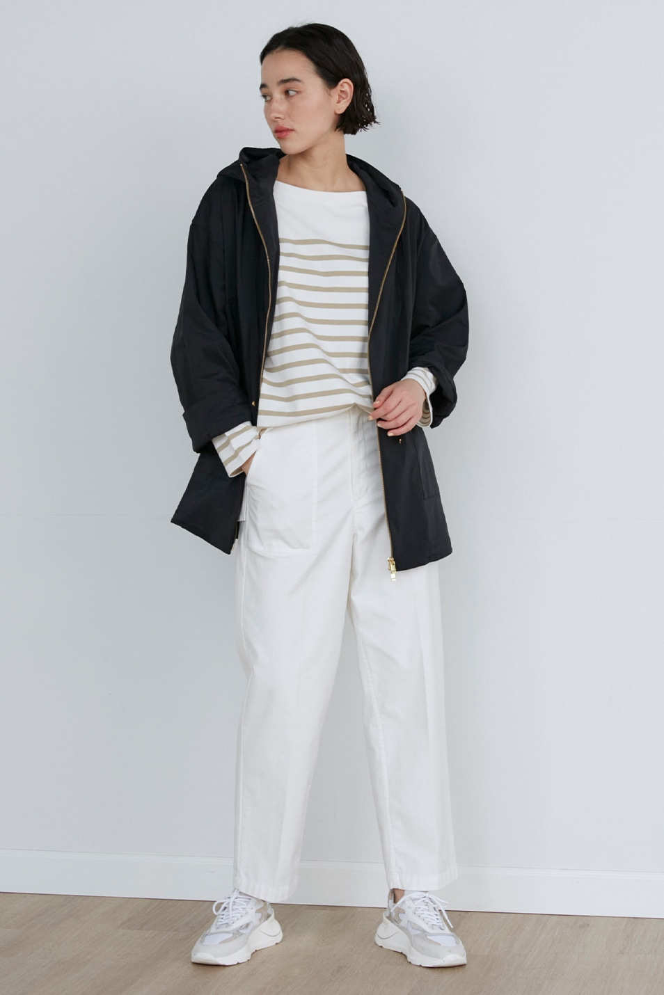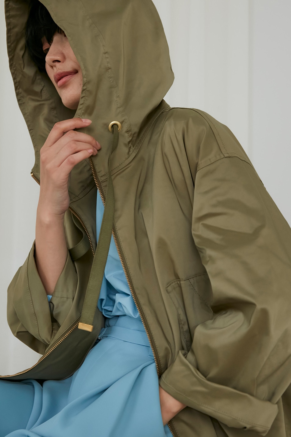 ラブコールにお答えし、昨年即完のライトコートをNEWカラーでリピート!スタンドカラーとウエストのドローストリングデザインがミリタリー&モードな雰囲気で、あえての長め着丈でエレガントさも匂わせて。撥水加工(ダントツ撥水TM)された素材と襟の中に忍ばせたフードがちょっとした雨風もよけてくれるから、季節の変わり目に万能さを発揮します。