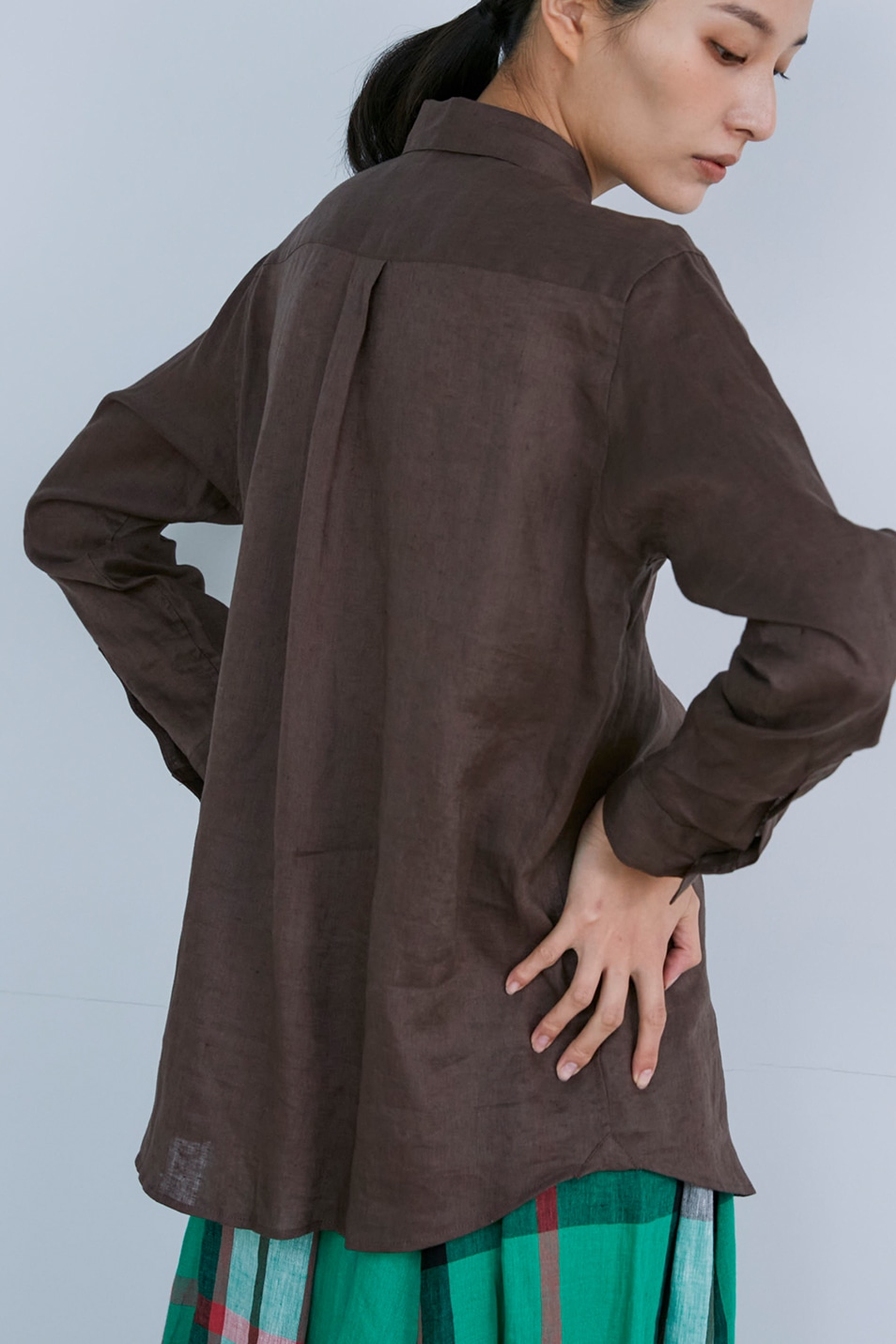 モダンなダークブラウンはカジュアルな中に上品さを秘めたカラー。リネンならではの表情感が深い色味を軽やかに昇華し、大人シックなシーズンスタイルを完成させます。背中のタックがふわりと風を取りこむから、羽織りとしての使い方もおすすめ。