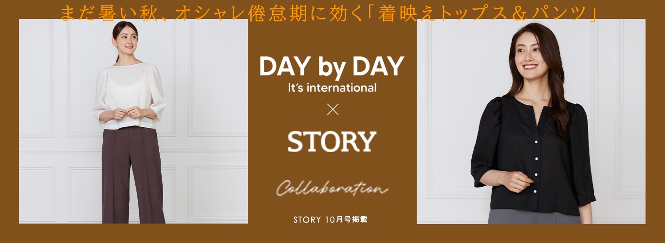 大人の「ひとクセ」ベーシック40代女性誌NO.1の売り上げを誇る「STORY」と上質な素材、最高の着心地を追求するブランド“DAY by DAY It's international”がコラボレーション。大人の「ひとクセ」ベーシックの第19弾は、まだ暑い秋、オシャレ倦怠期に効く「着映えトップス&パンツ」
