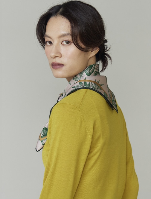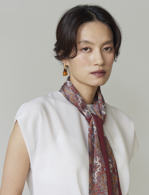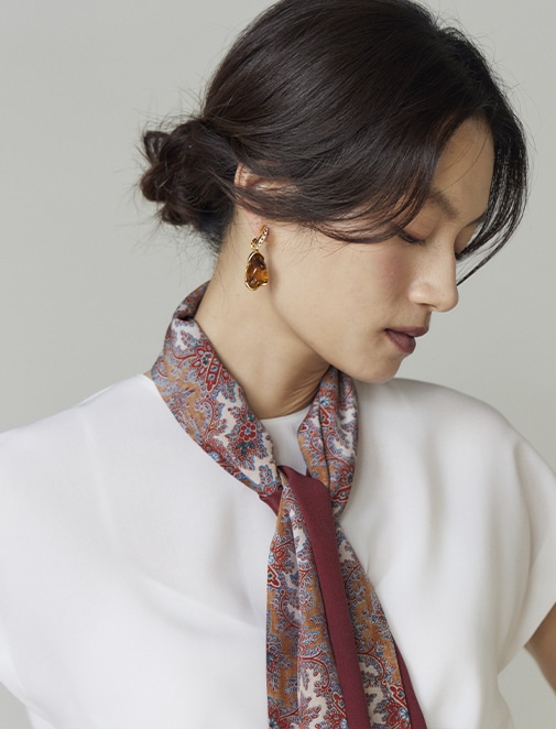 気軽に取り入れやすいナロースカーフ。首に巻いて正面に垂らすと、ネクタイのような存在感が。