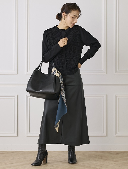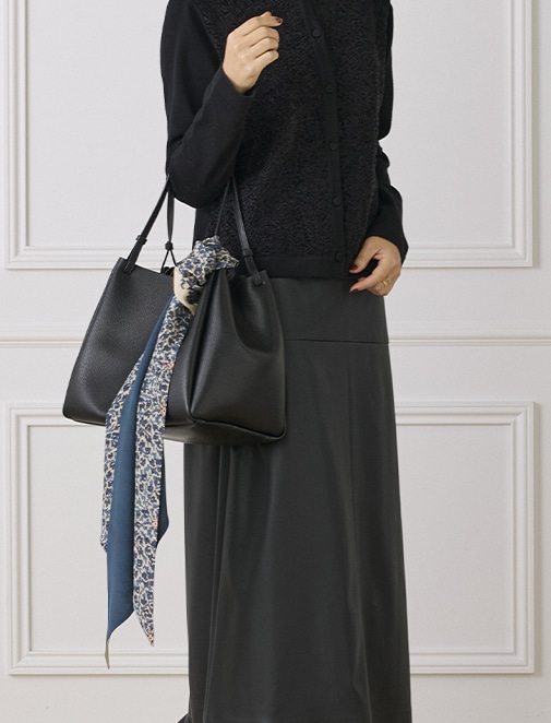 ベーシックないつものバッグに柄物スカーフをプラス。