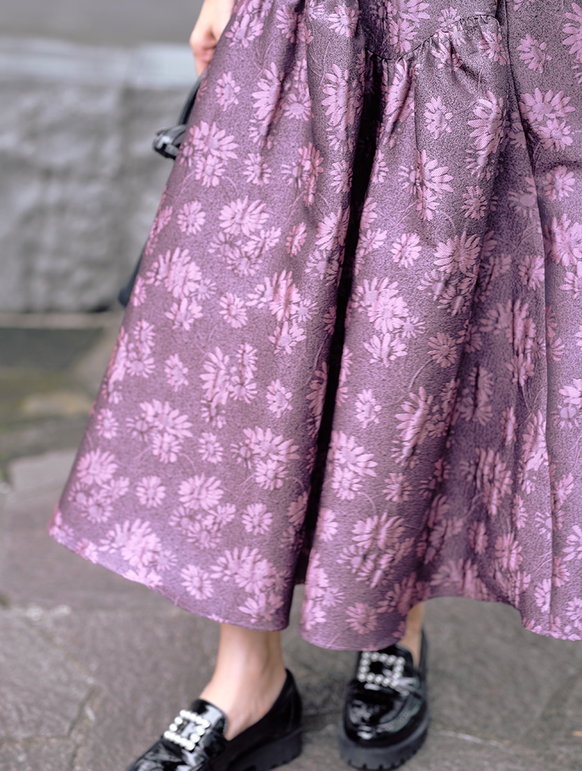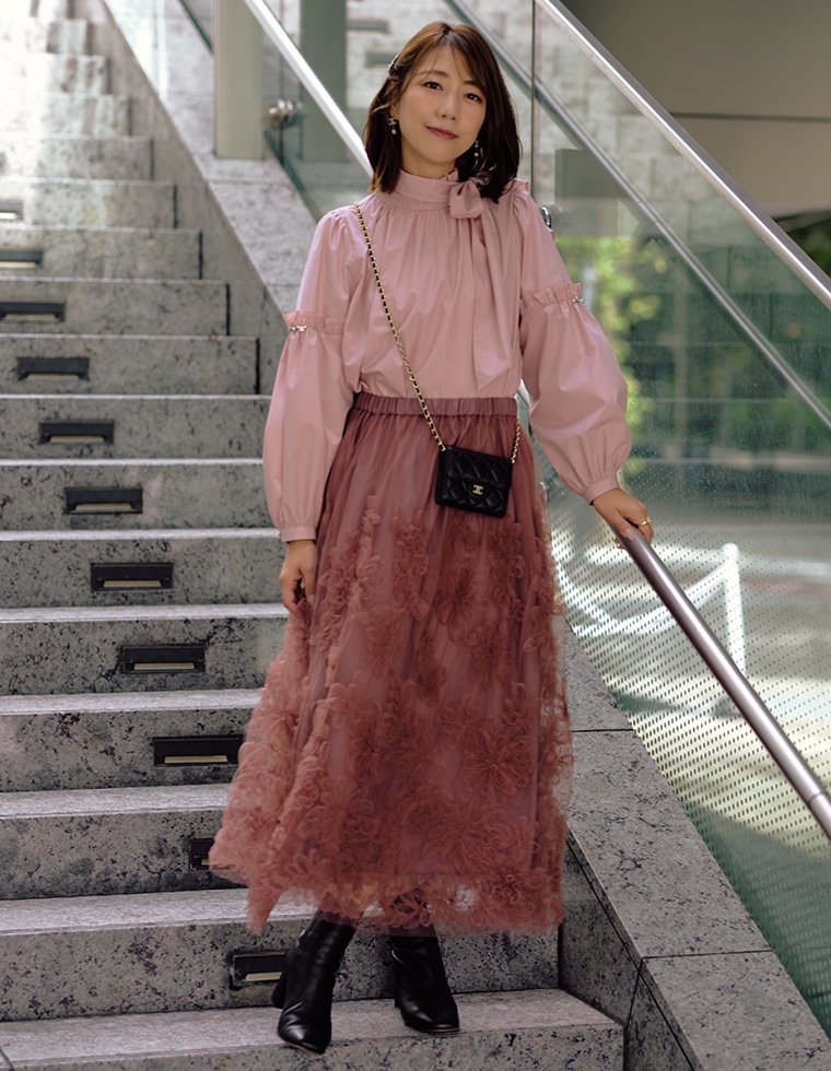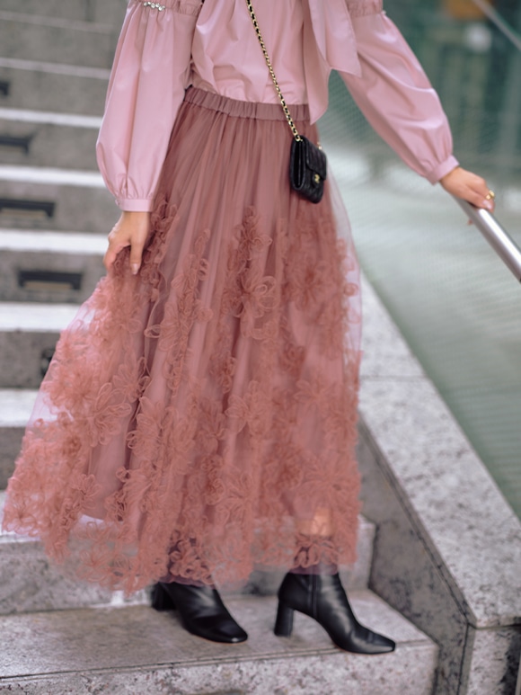 デザイナーが手描きで描いたフラワーモチーフを、チュールに刺繍したオリジナルデザインのスカート。ブラウンみのあるピンクをベースに、明るいピンクを重ねたワントーン配色がやさしく華やかな印象を演出します。とにかく軽やかな着心地で、ウエストまわりが広がりすぎないよう計算されたシルエットもポイント。動くたびにふんわりと揺れる、秋にぴったりの主役スカートです。