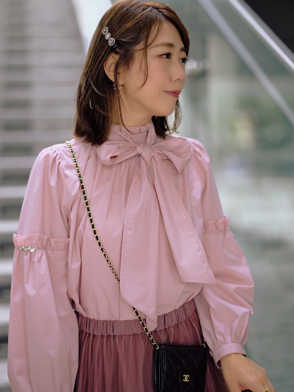 ブラウスは、袖にトレンドのビジューをあしらった