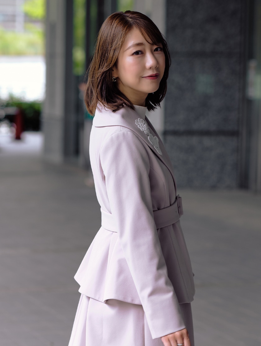 マーリエらしい大きめのショールカラーと、ウエストを