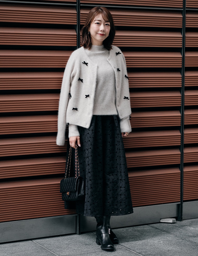 アンサンブルで着られるデザインで、インナーとセットで合わせれば冬もあたたか。プルオーバーニットには袖にさりげなくベロアのリボンをあしらい、フェミニンなアクセントを添えています。れなちょ一押しは、やわらかなニュアンスをまとった“グレーべージュ”。優しい雰囲気で、冬の装いを上品にまとめてくれるおすすめカラーです。