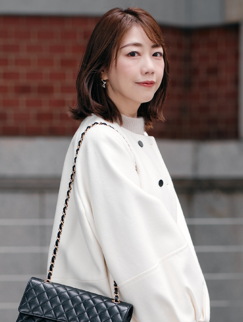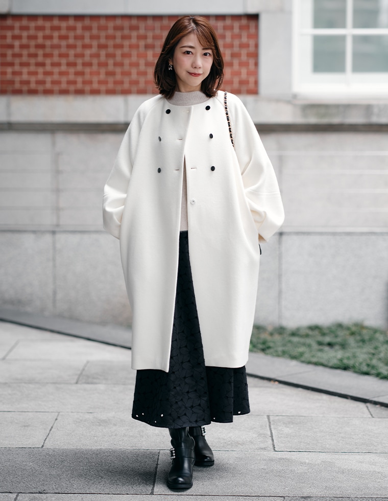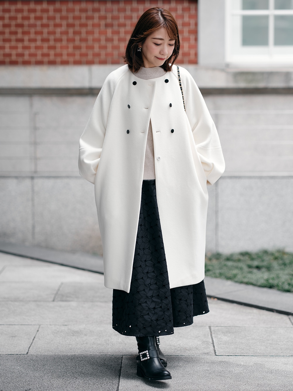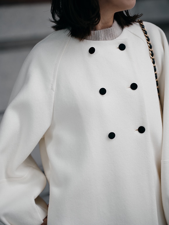 ホリデーシーズンにぴったりの“白のコート”。上質なウール素材を使用しているから、白でも高級感があり、軽さと暖かさを両立。冬のスタイルをクラスアップしてくれる、まさに主役級の一着です。