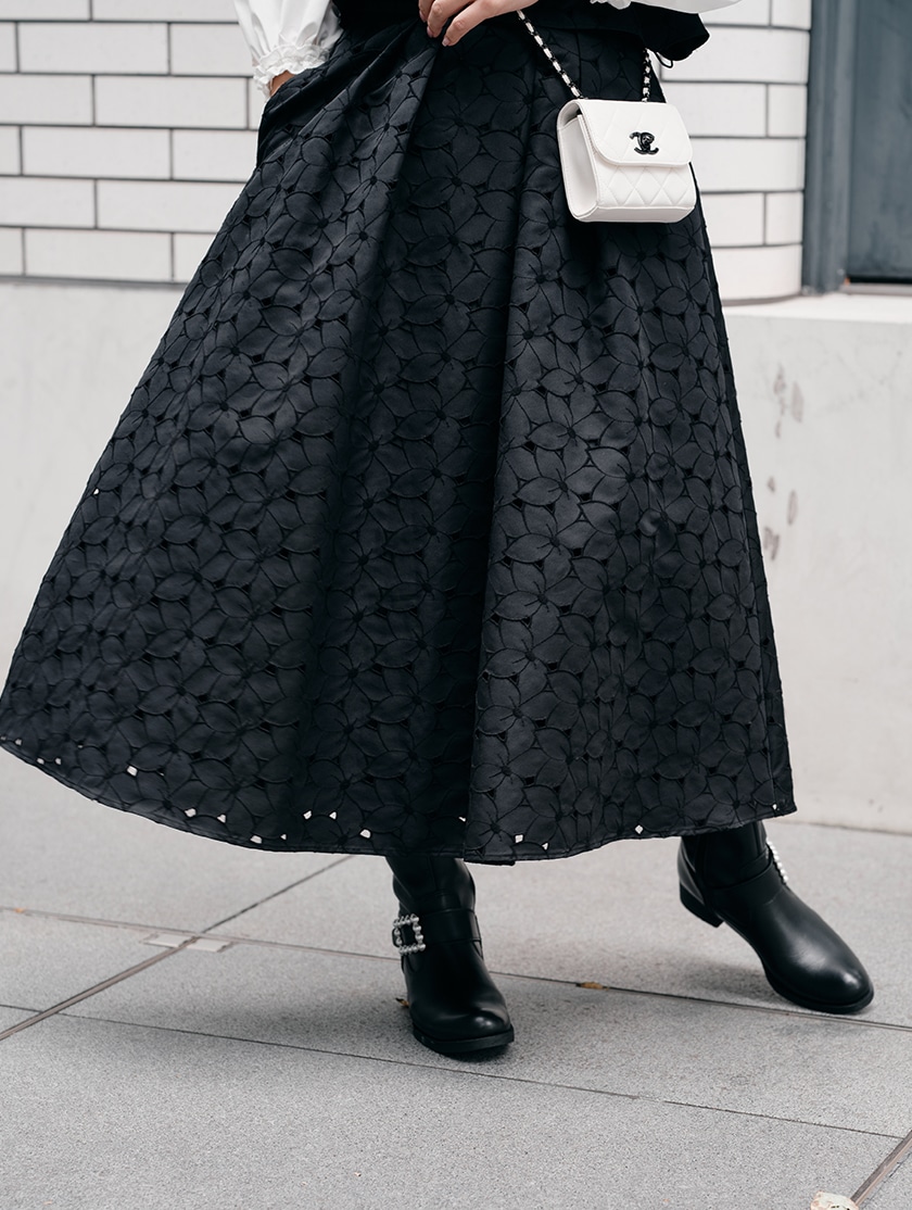 ハリのあるグログラン生地にフラワー刺繍を施した、シーズンレスで楽しめるビスチェ×スカートのセットアップ。これまでにない立体的なデザインのビスチェは、ほどよくモードな雰囲気をまとい、コンパクトな丈感でバランスよく着こなせます。インナーには、2枚衿がポイントのフリルブラウスを合わせて華やかに。スカートは、たっぷりとボリュームを持たせたタックデザインで、存在感のある一枚に仕上げました。この冬のトレンドをリードする着回しアイテムとして、ぜひワードローブに迎えてほしいセットアップです。
