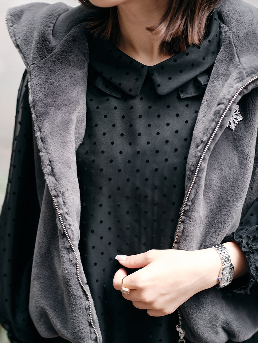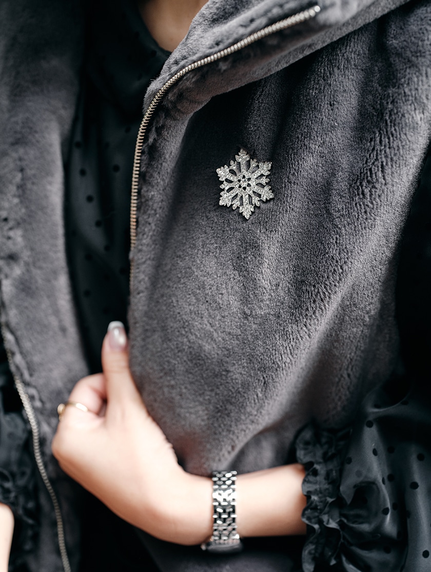 ふわふわのファーフードジレ。本物のファーに見えるほど上質で高級感のあるエコファーを使用し、今年のスタイリングに取り入れたい一着です。ブラウスやパンツとのコーディネートにもぴったり。さらに上からコートを羽織ることもできるので、寒い日にはレイヤードスタイルを楽しめます。ワントーンコーデには、スノーフレークモチーフのブローチをプラスしてアクセントに。