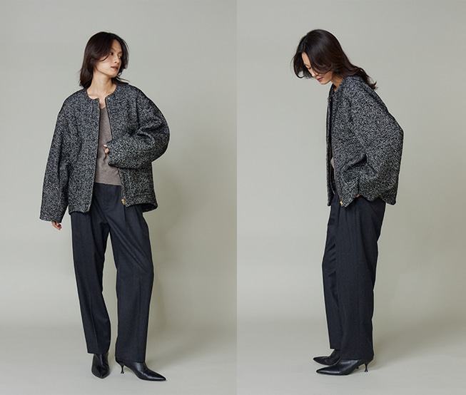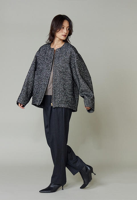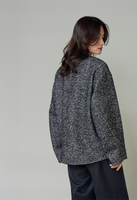 日本でも有数のウールの産地、尾州産のオリジナル生地を使用。ヘリンボーン生地にトレンドのラメとスパンコールを織り込みました。