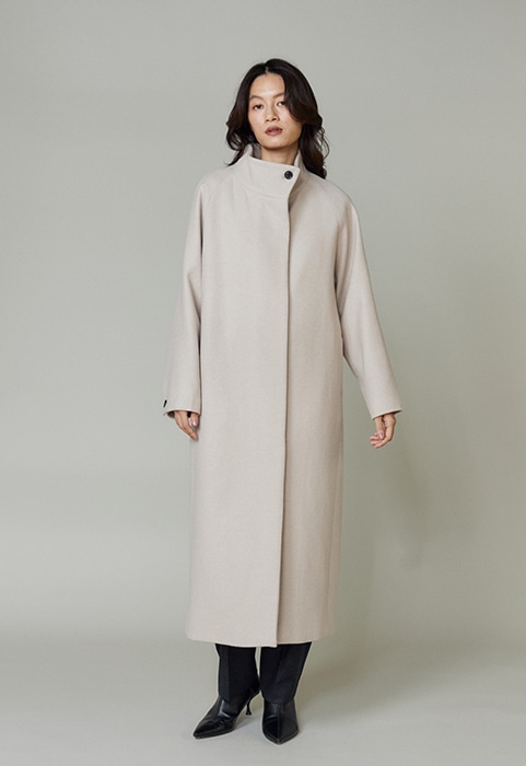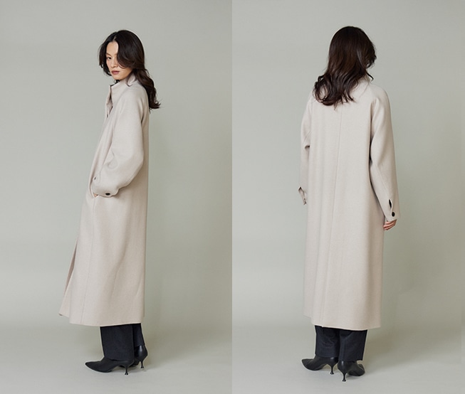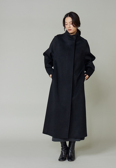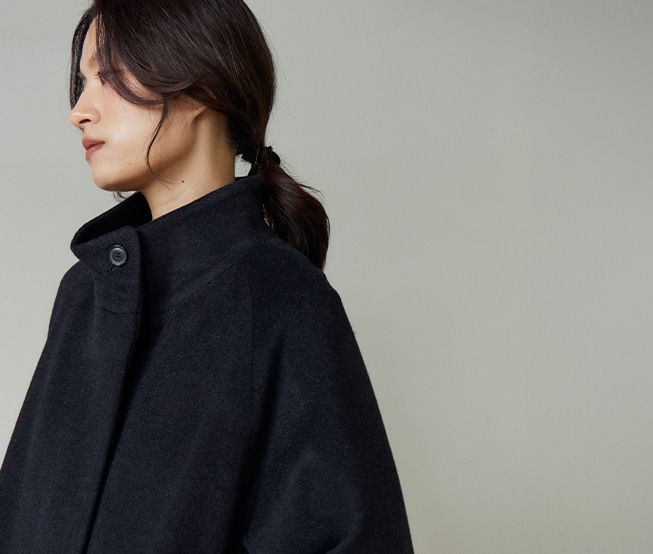 MADE IN ITALYの上質な素材を使用した、クラシックなスタンドカラーのコート。柔らかくカーブしたファンネルネックと控え目なバットウィングスリーブが特徴です。
