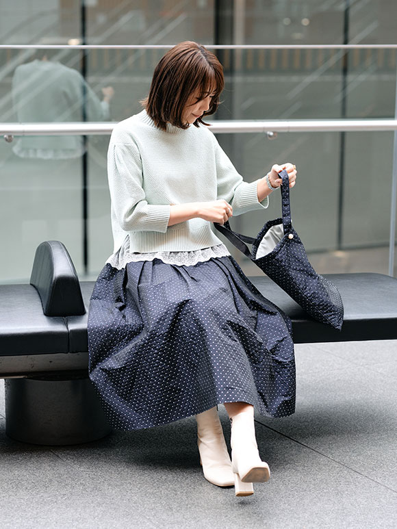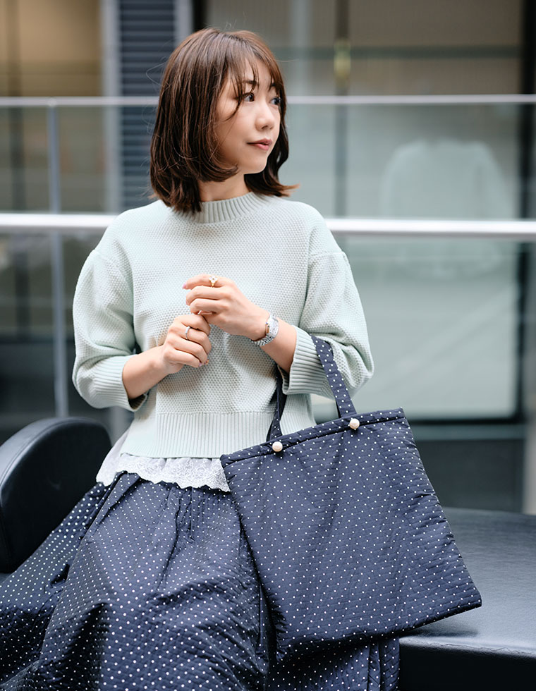 ドットジャガードのセットアップとお揃いの生地で、A4サイズのトートバッグも作りました。裏地はミントグリーンにしているので、ぜひニットと合わせてコーデのアクセントに持ってほしいな♡