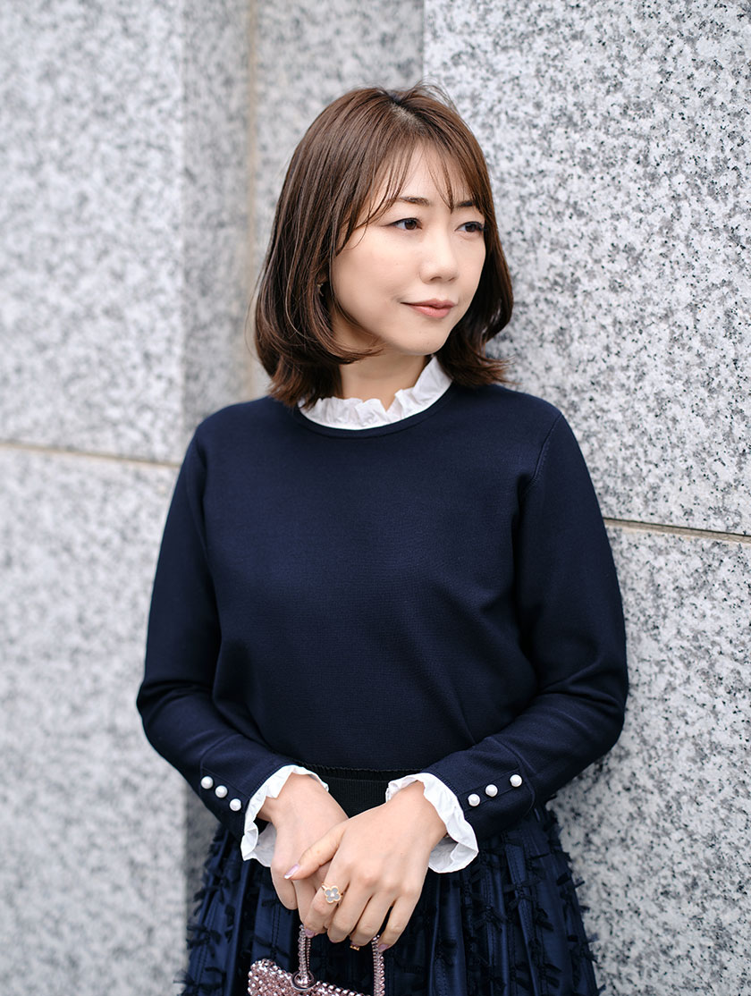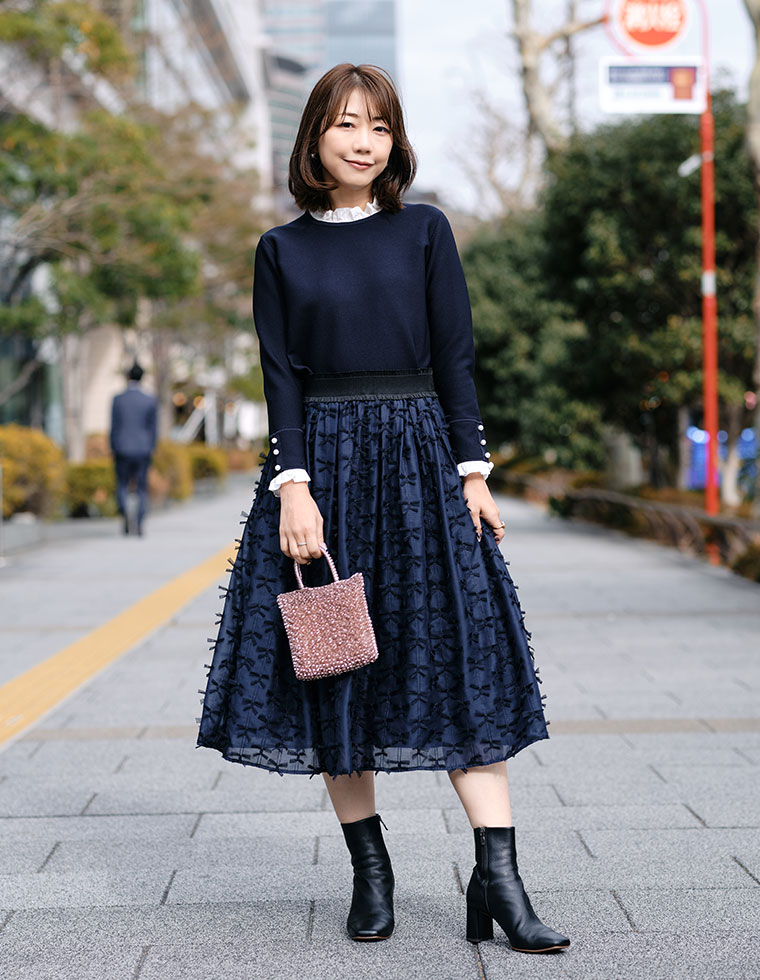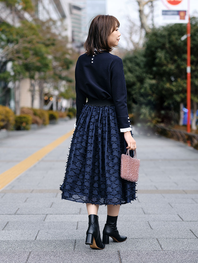 プチハイネックがクラシカルなフリルドッキングニットは、首元と袖のフリルが取り外しできるので気分で印象を変えられます。手元とバックスタイルのパールがさりげなく華やぎをプラスします。合わせたタックギャザースカートは、繊細なチュールリボン刺繍と透け感がポイントで、とっても軽やか。ウエストにはイタリアの高級フリルゴムを使い、きれいなシルエットと快適さを両立しました。