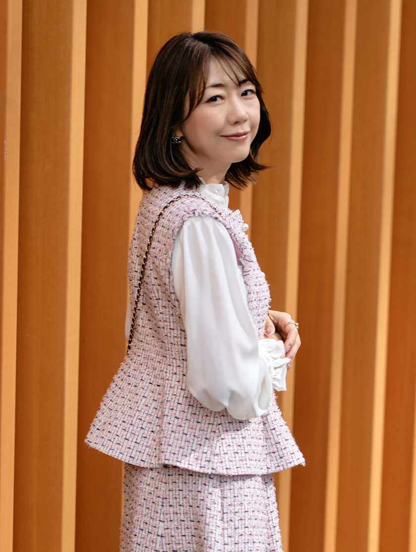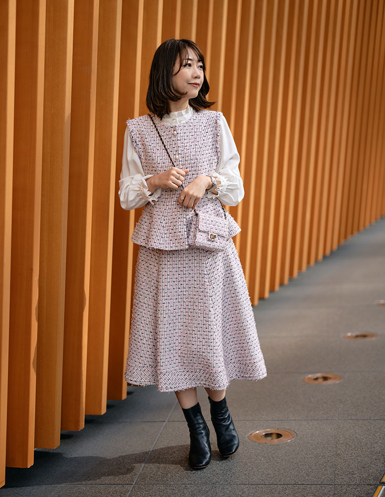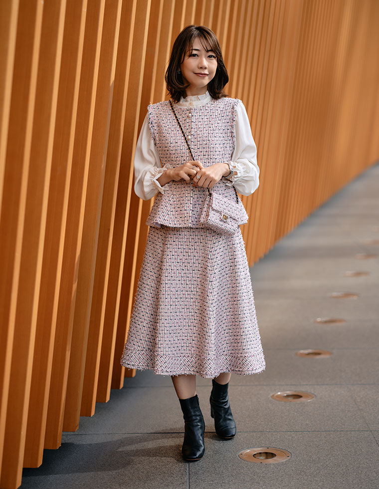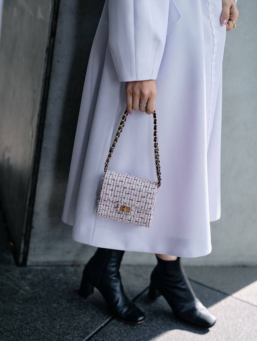 春らしい可愛さをぎゅっと詰め込んだ、オリジナルツィードを作りました。6種類の糸を贅沢に使用したジレは、華やかな表情と上品な存在感が魅力。ウエストまわりを美しく見せてくれるペプラムシルエットにもこだわりました。合わせたスカートは長すぎないミディ丈で、軽やかに広がるフレアラインがポイント。裾には繊細なフリンジ加工を施し、動くたびに表情が出る特別な一枚に仕上げています。さらに、お揃いのツィードバッグは新しくミニサイズで登場。コーデのワンポイントに、ぜひゲットしてほしいアイテムです。