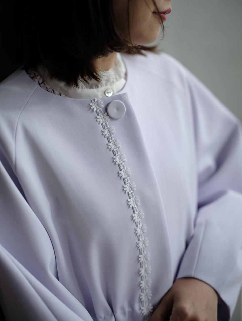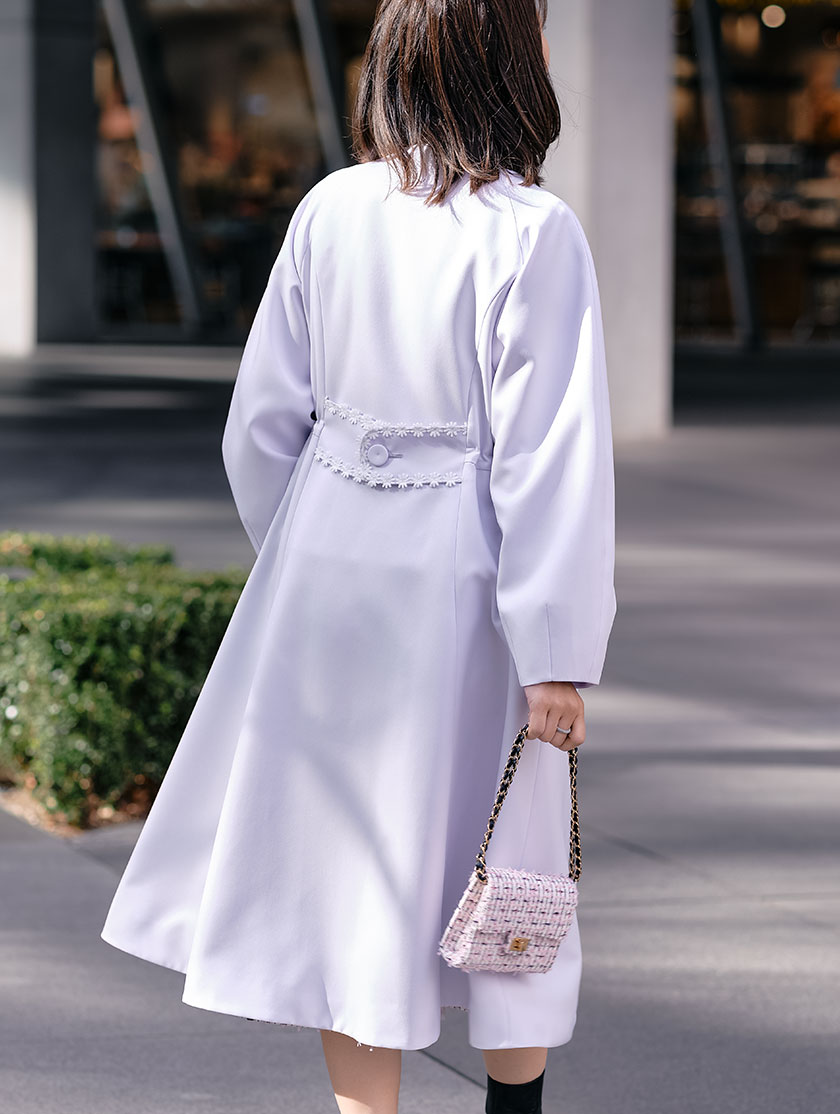 トレンドのフラワーレースを贅沢にあしらった、春の主役コート。上品なラベンダーカラーにホワイトレースが映え、羽織るだけで華やかな印象に仕上がります。袖はふんわりとしたランタンスリーブで女性らしさをプラス。ウエストはゴム仕様で自然にウエストマークされ、ワンピースのようなシルエットが叶います。さらにバックスタイルには太めのベルトとフラワーレースを施し、360度どこから見ても着映える一着です。