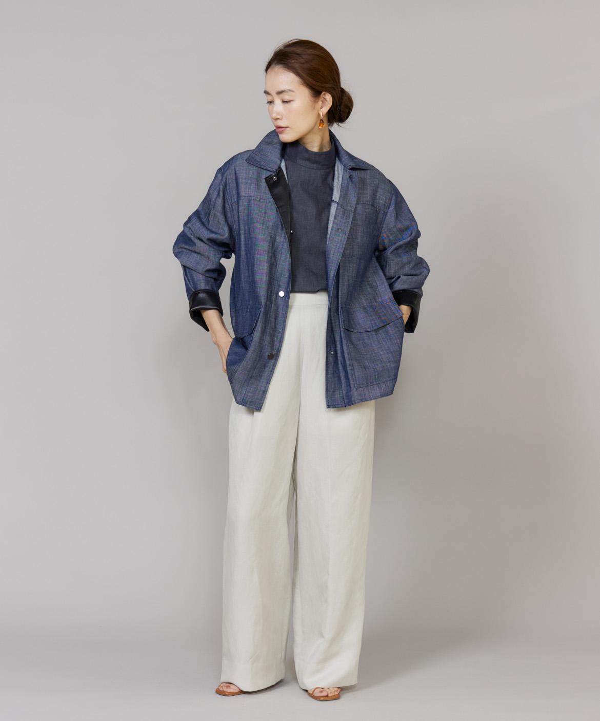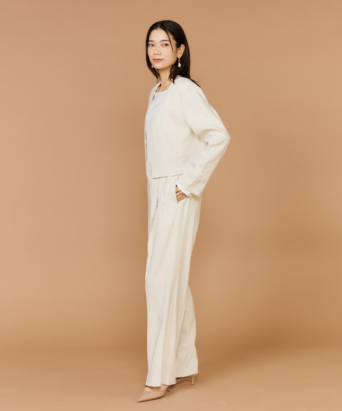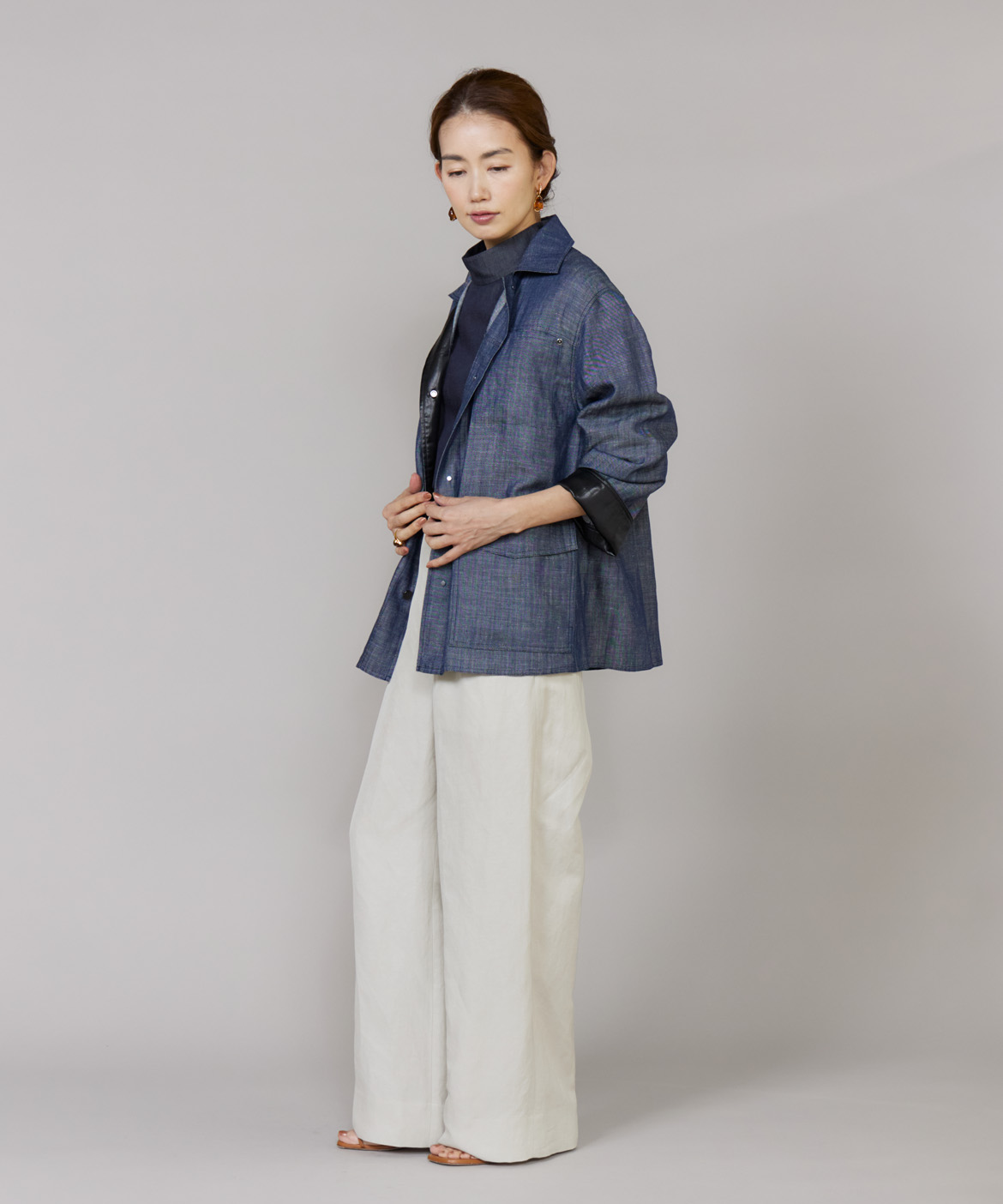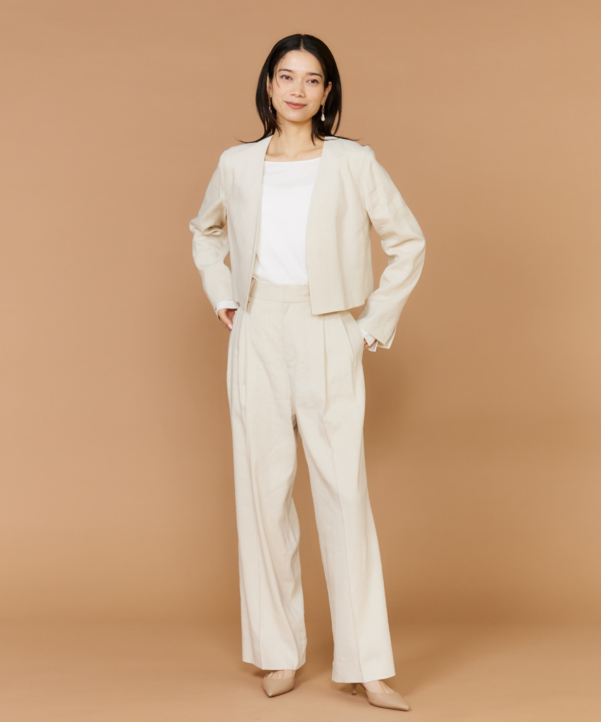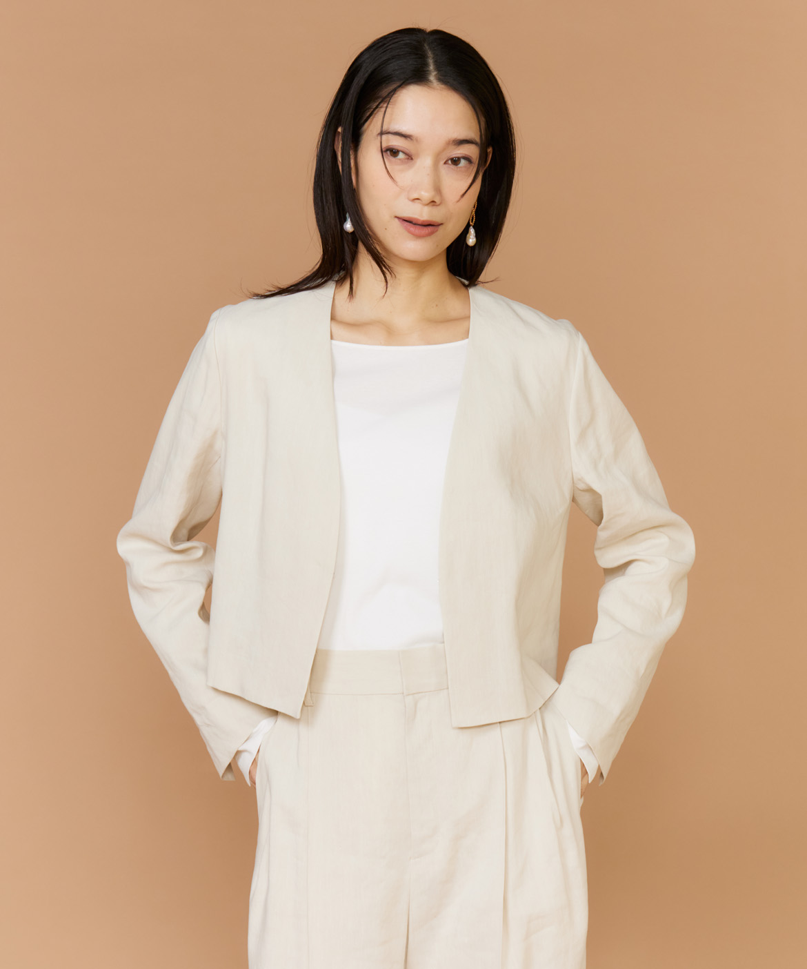 ノーカラーのショート丈ジャケットで、軽やかかつ上品に。コンパクトな着丈がバランスを整え、ワイドパンツと合わせてスタイルアップ効果も実現。柔らかなワントーンでまとめた、きちんと感のある春の大人スタイリング。