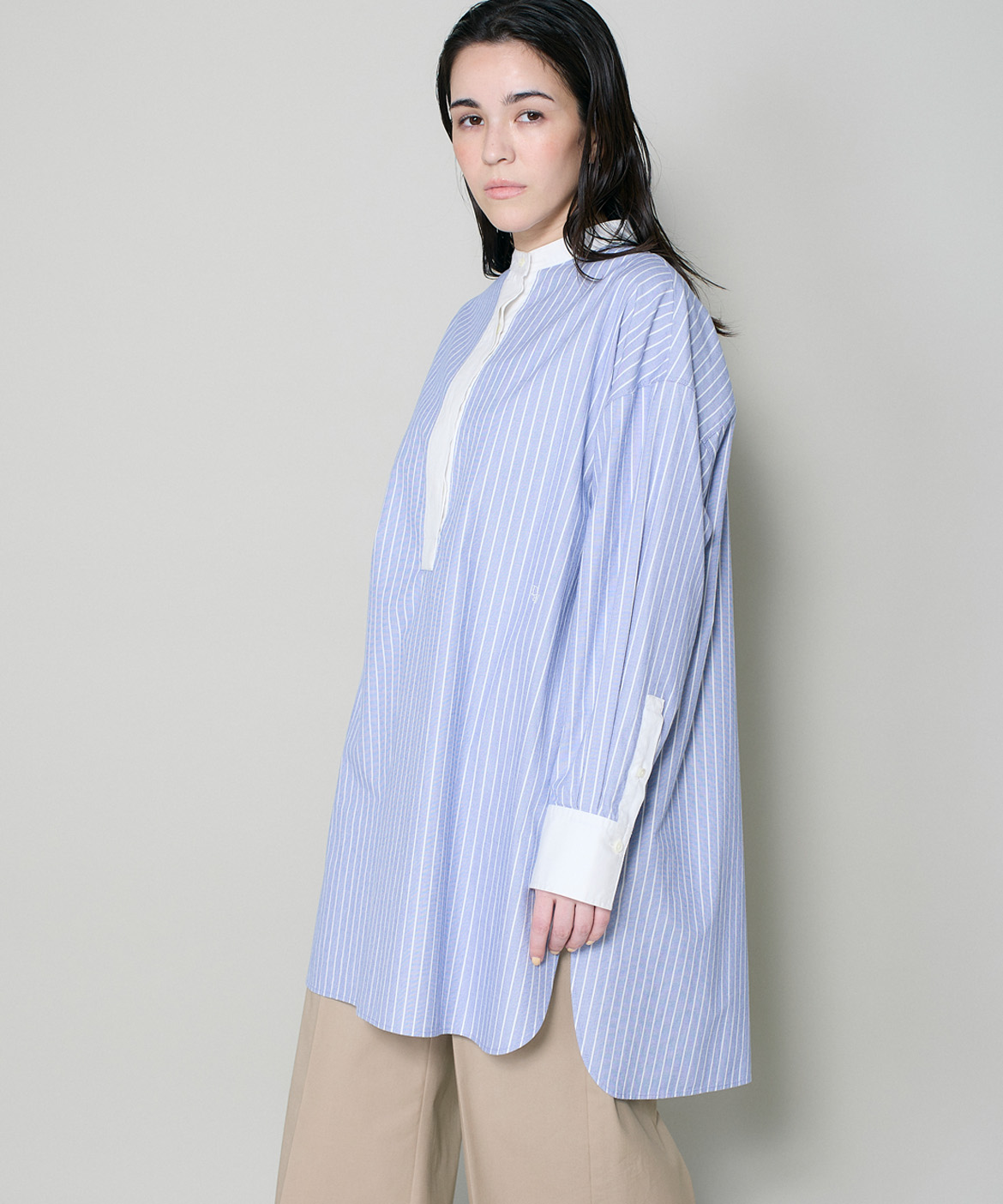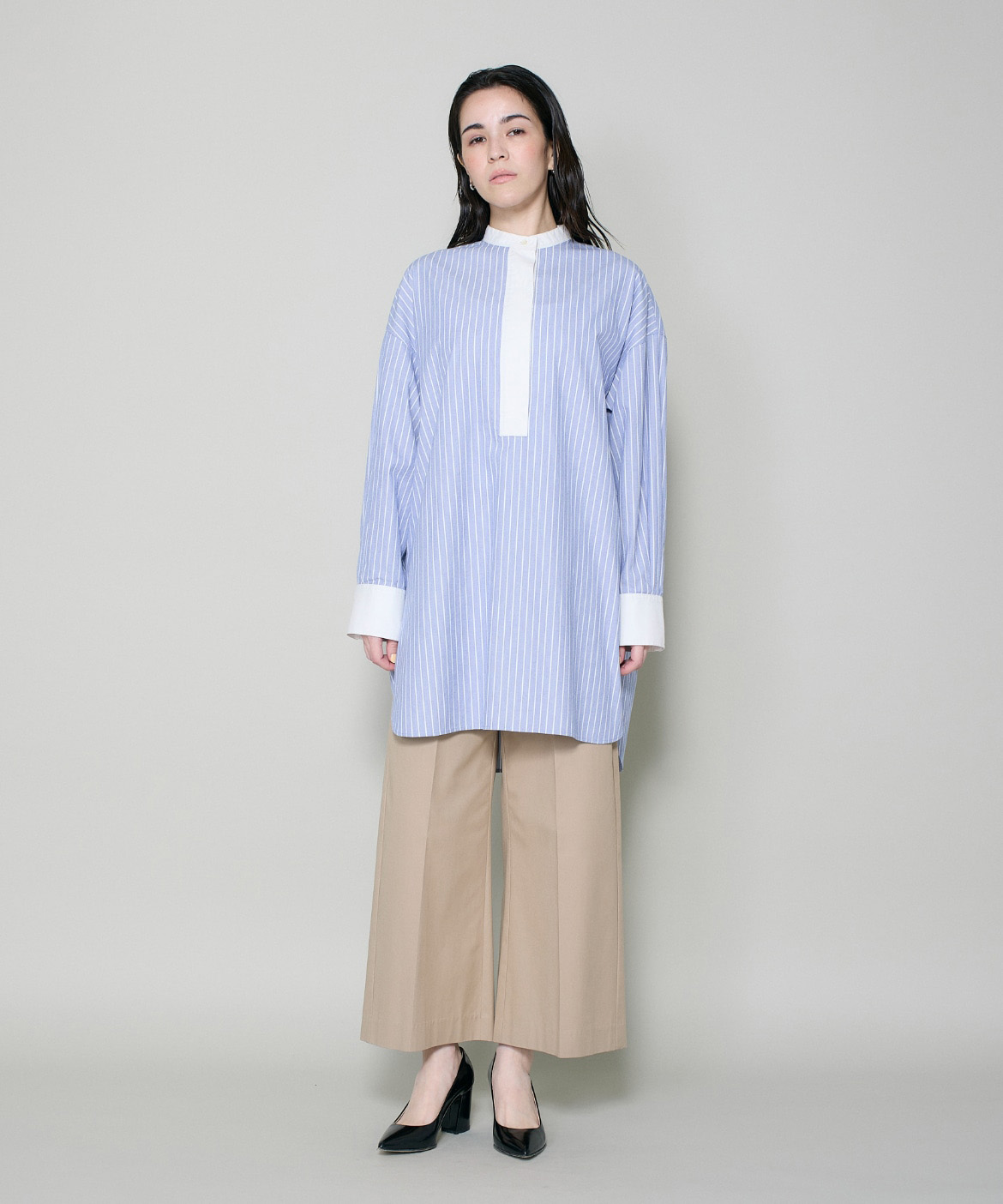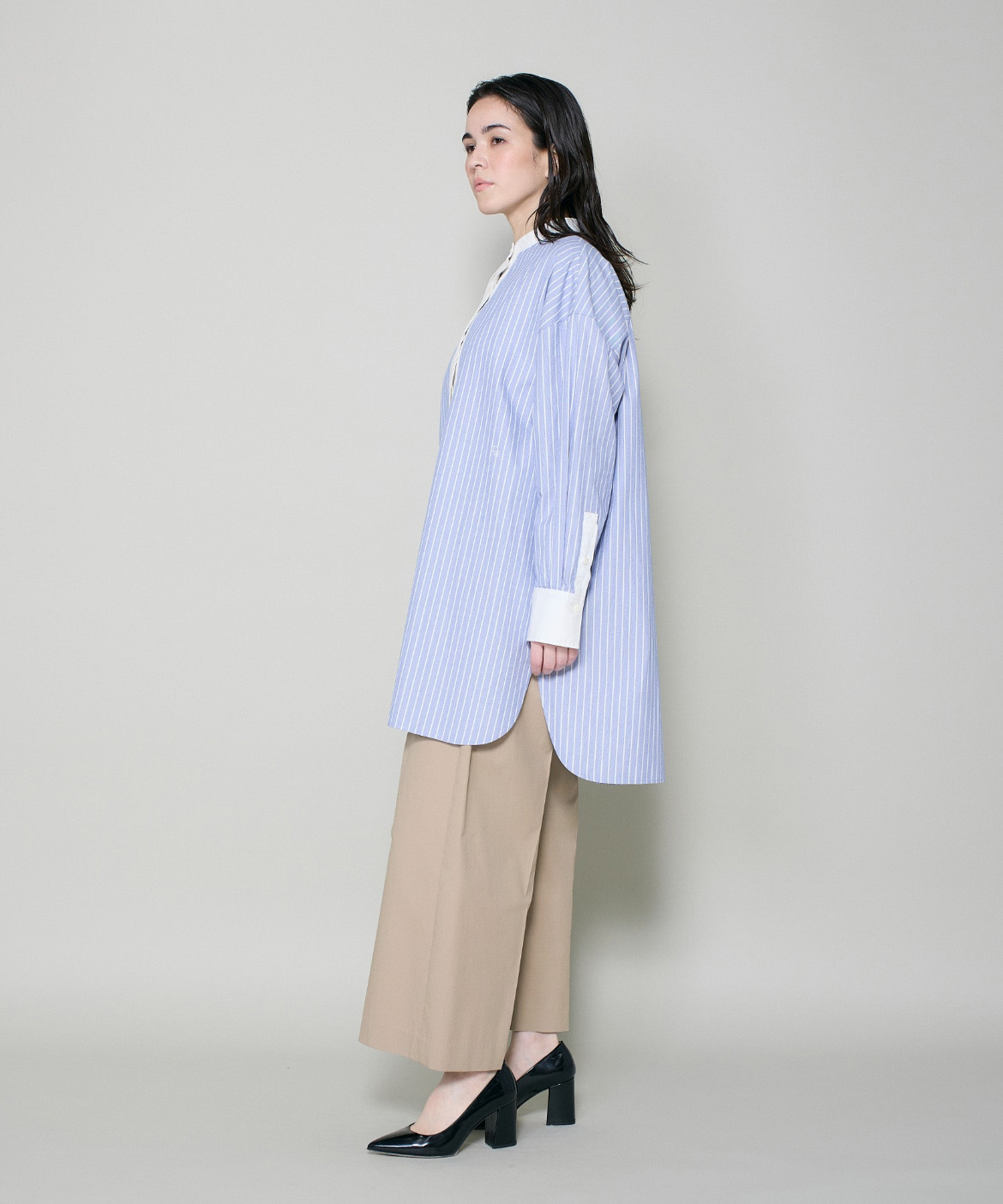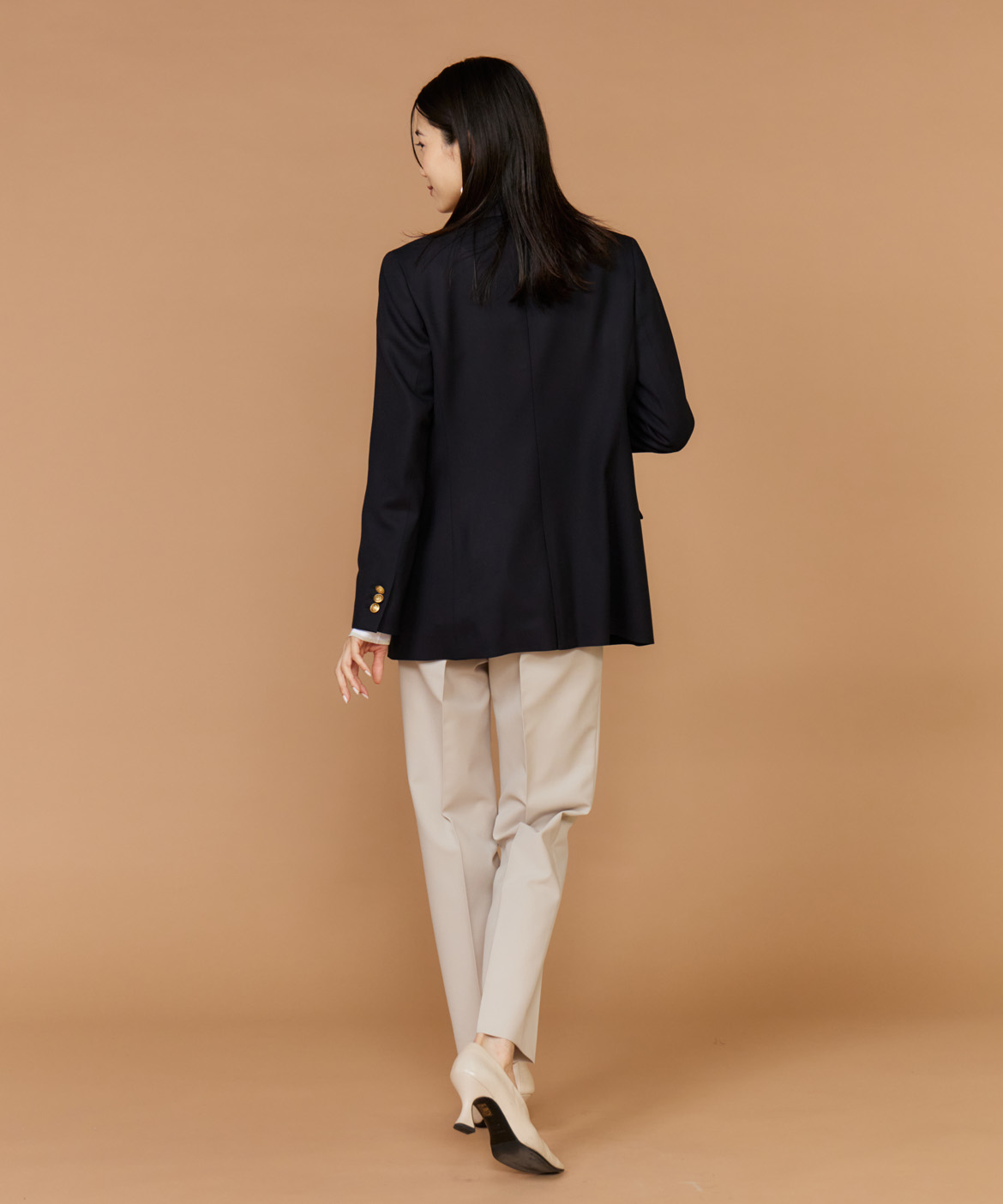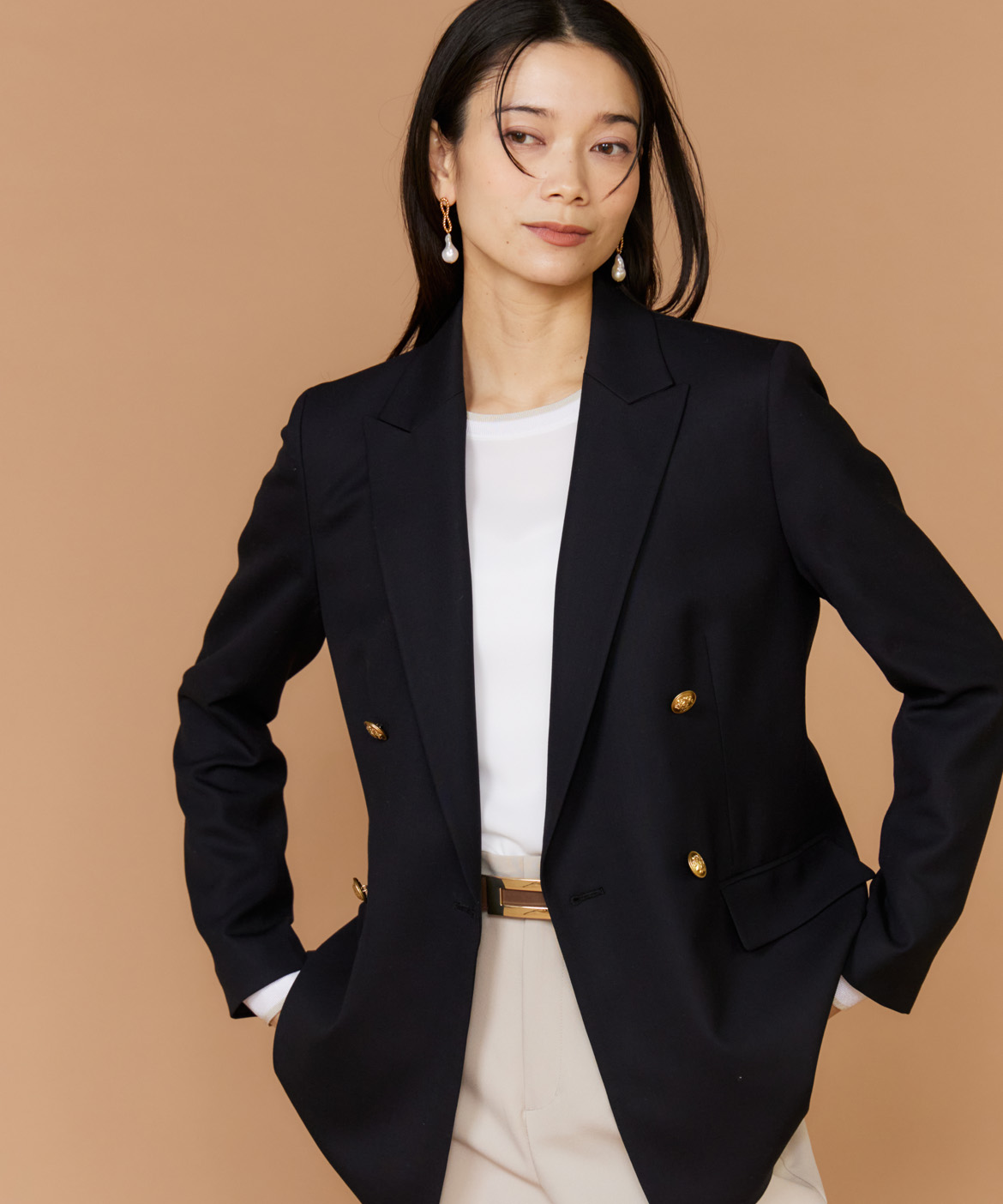 ノーカラーのショート丈ジャケットで、軽やかかつ上品に。コンパクトな着丈がバランスを整え、ワイドパンツと合わせてスタイルアップ効果も実現。柔らかなワントーンでまとめた、きちんと感のある春の大人スタイリング。