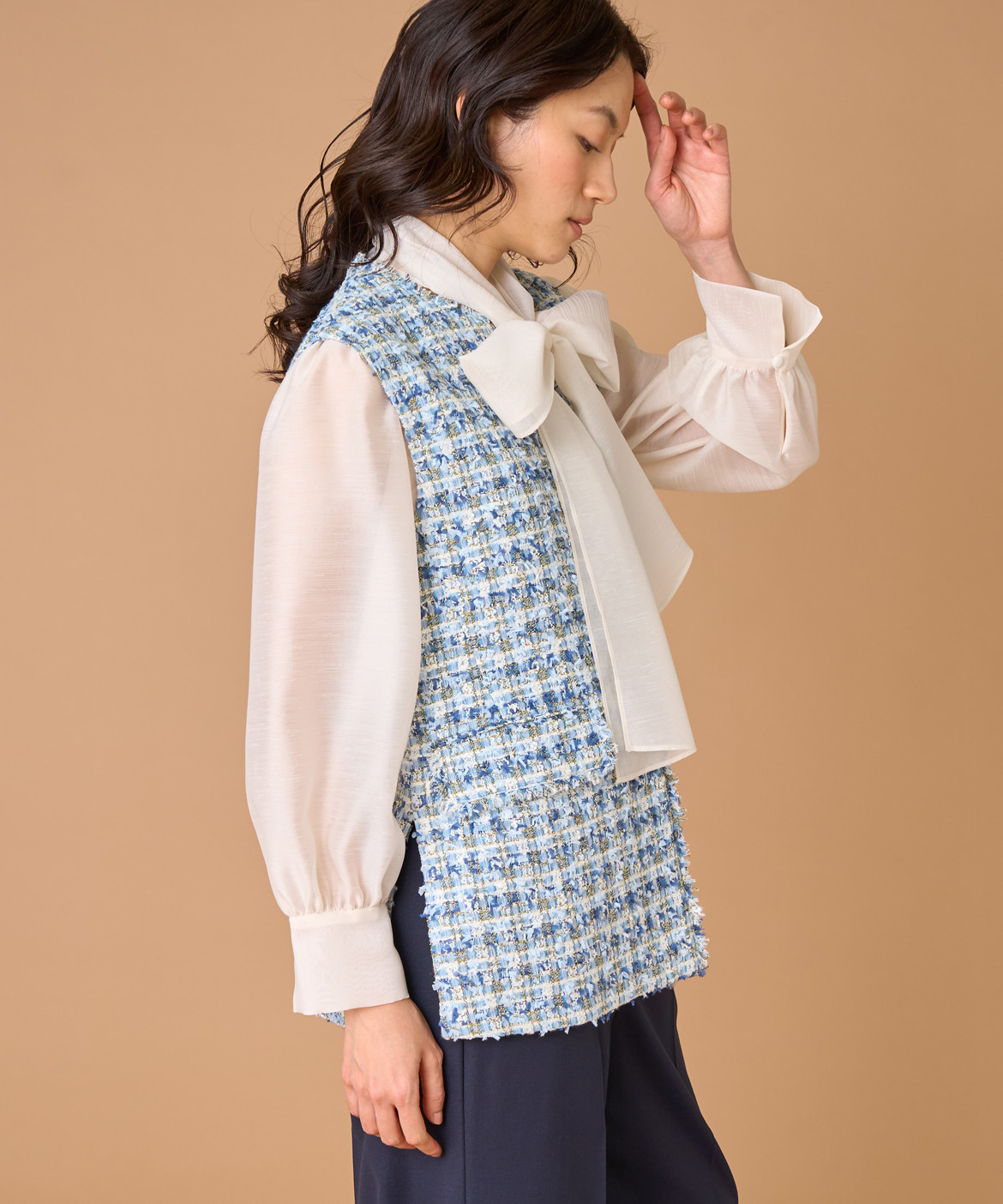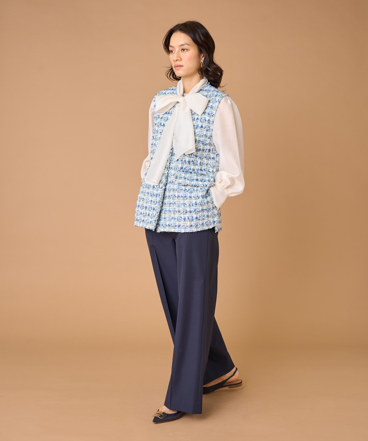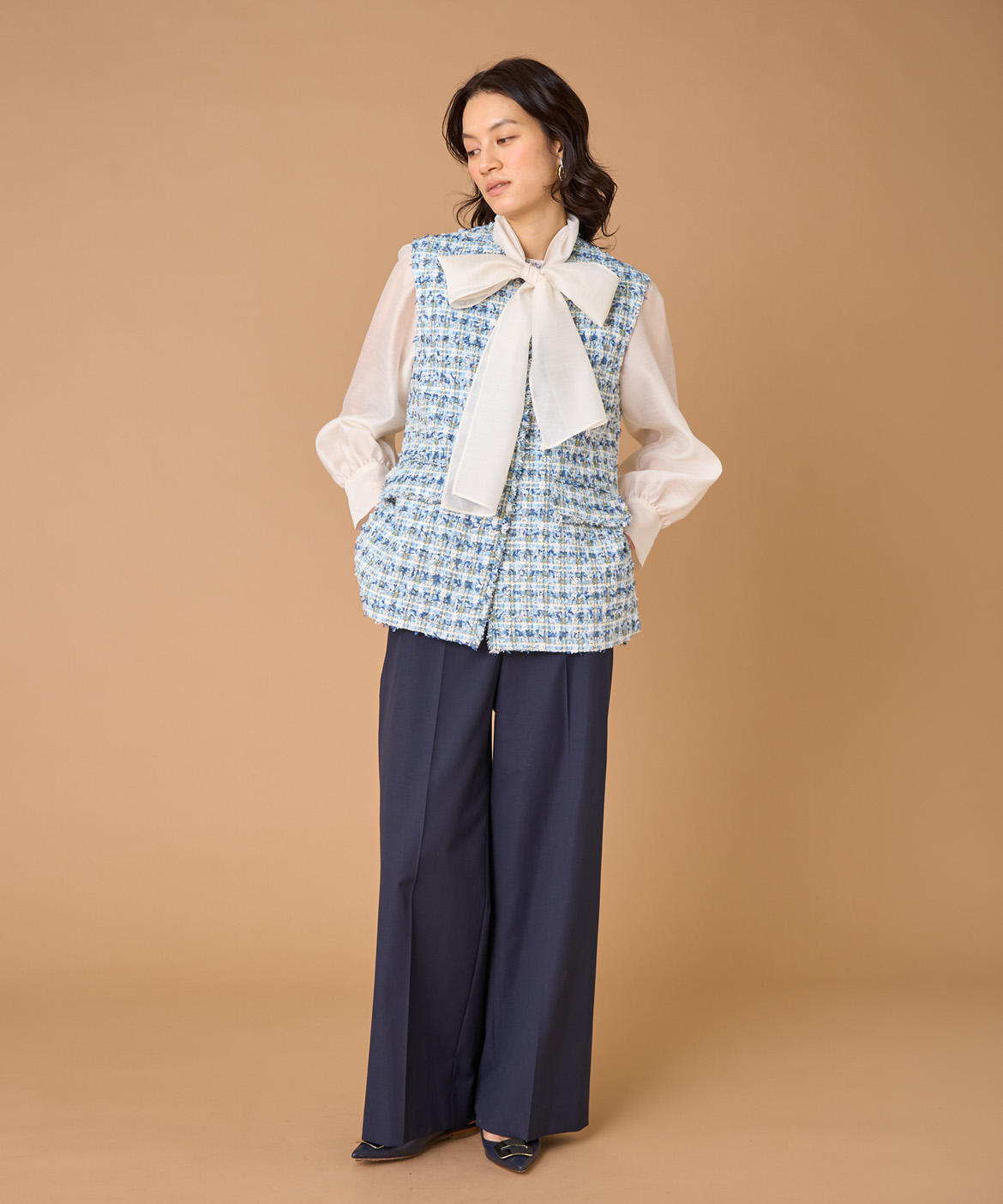 16〜20度の春に最適な軽やかレイヤード。ツイードベストで季節感と上品さをプラスし、ボウタイブラウスで華やかさを演出。ワイドパンツで抜け感を出しつつ、快適さときちんと感を両立した大人の春スタイリング。