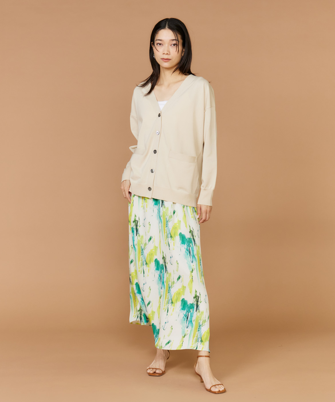 淡色カーディガンを主役に、軽やかな柄スカートで春らしさを演出。柔らかなカラーで全体をまとめつつ、足元はサンダルで抜け感をプラス。リラックス感と女性らしさを兼ね備えた春のデイリースタイル。