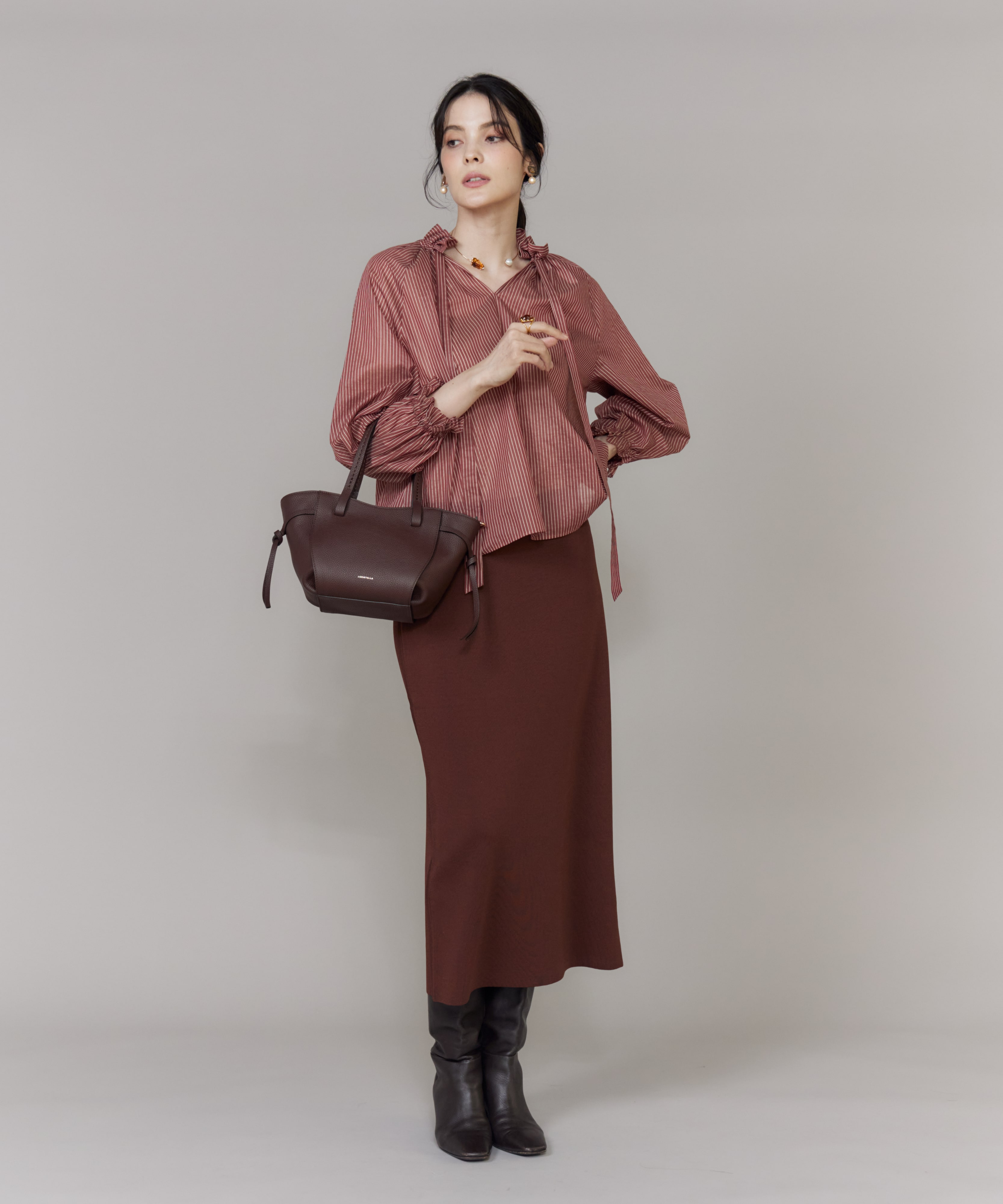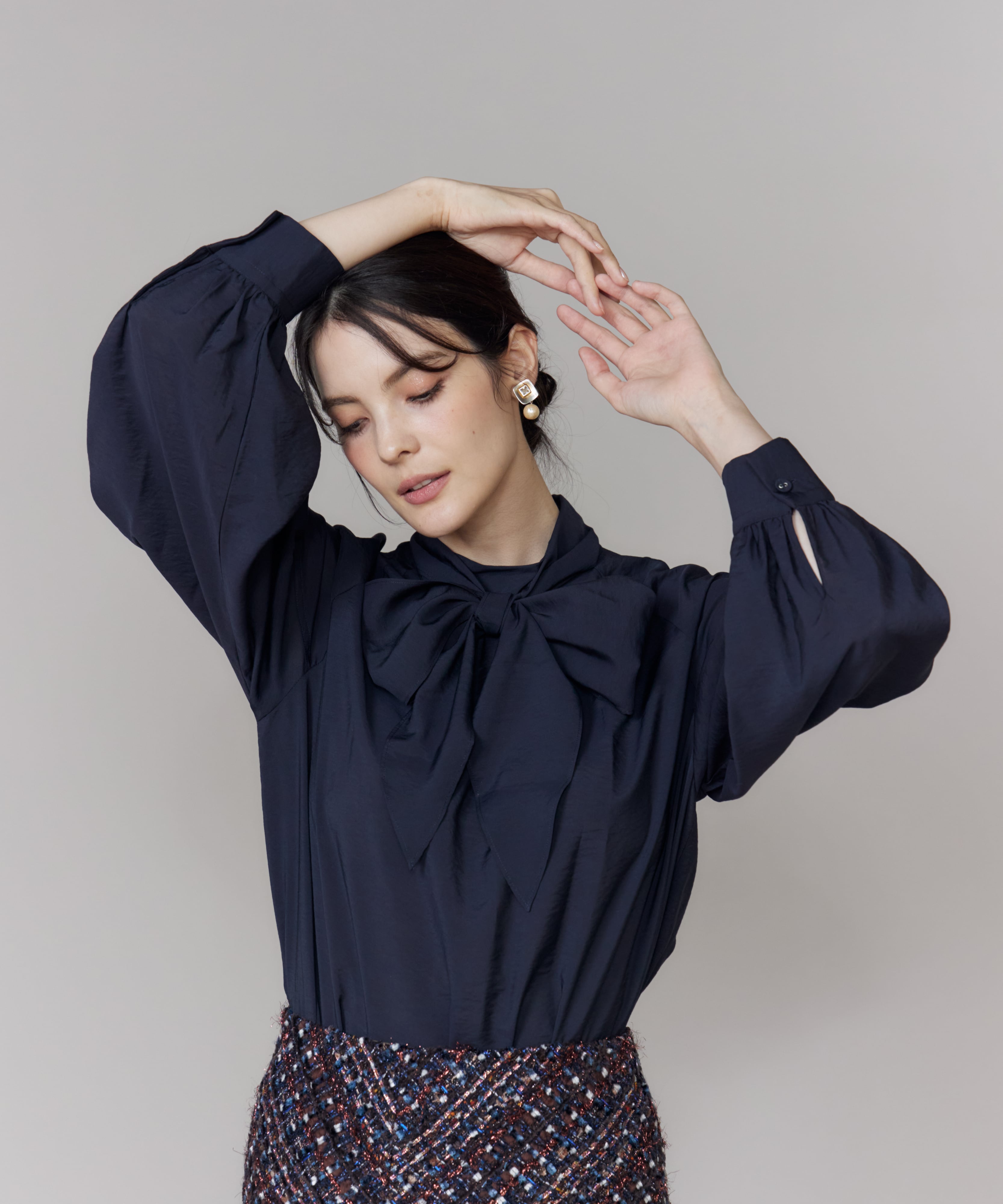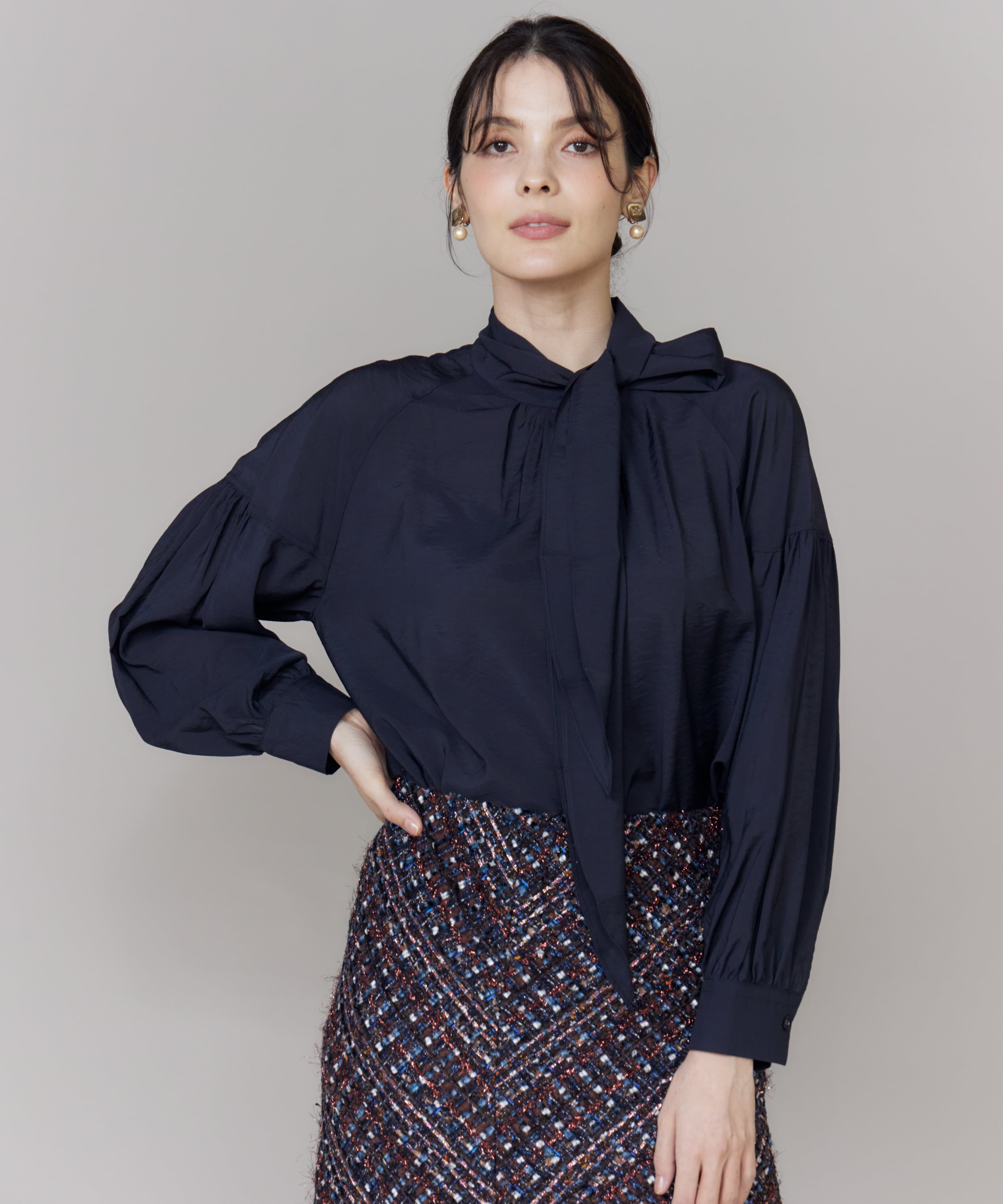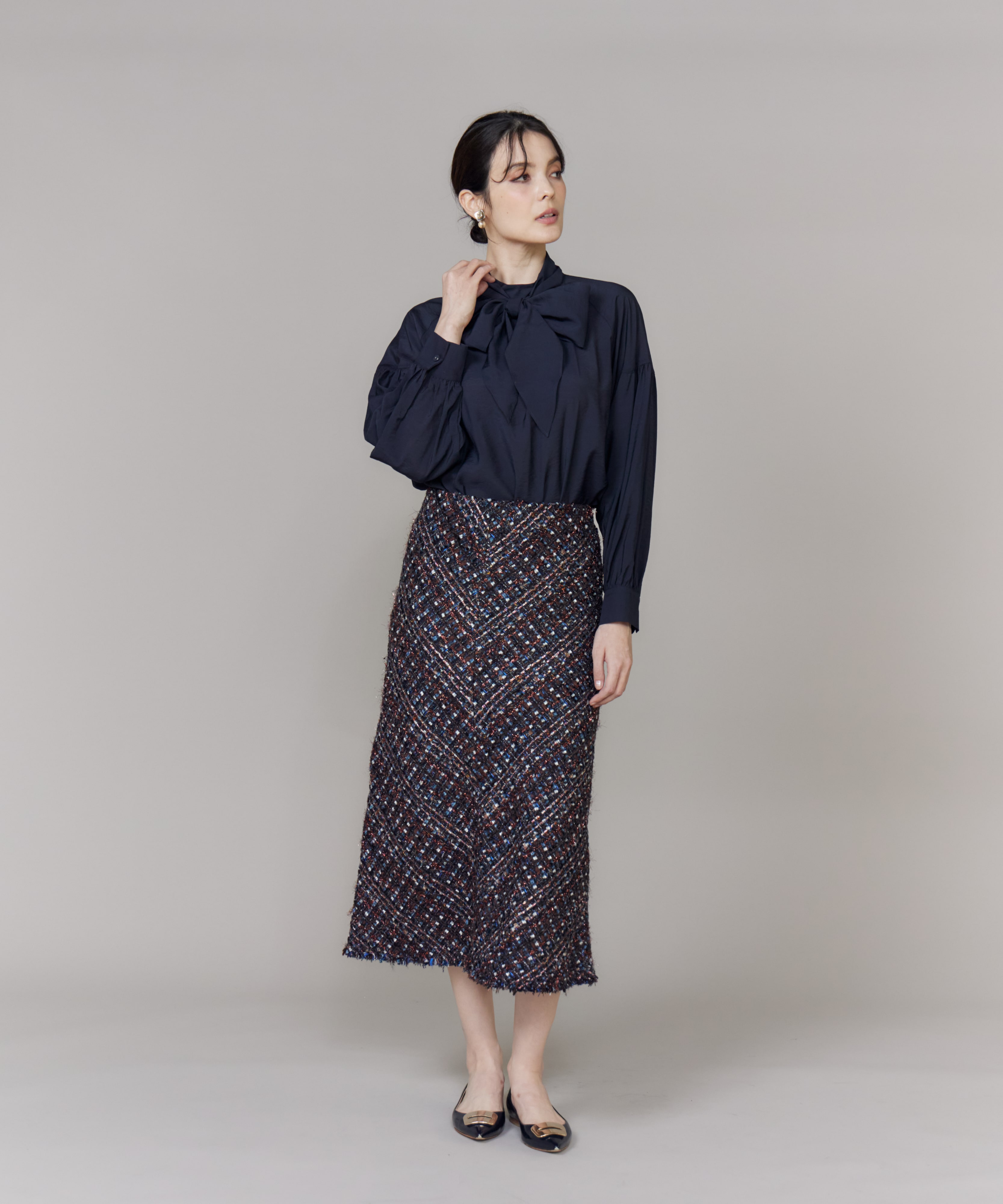 艶感のあるボウタイリボンブラウスに、煌びやかなツイードスカートを合わせた、大人フェミニンな着こなし。スカートには、世界的なメゾンブランドも手掛けるフランスの老舗ツイードメーカー「TOURNIER」の生地を使用し、コーディネートを一層格上げしてくれます。ボウタイリボンは結び方次第で表情が変わるので、その日の気分やスタイルに合わせてアレンジを楽しんで。