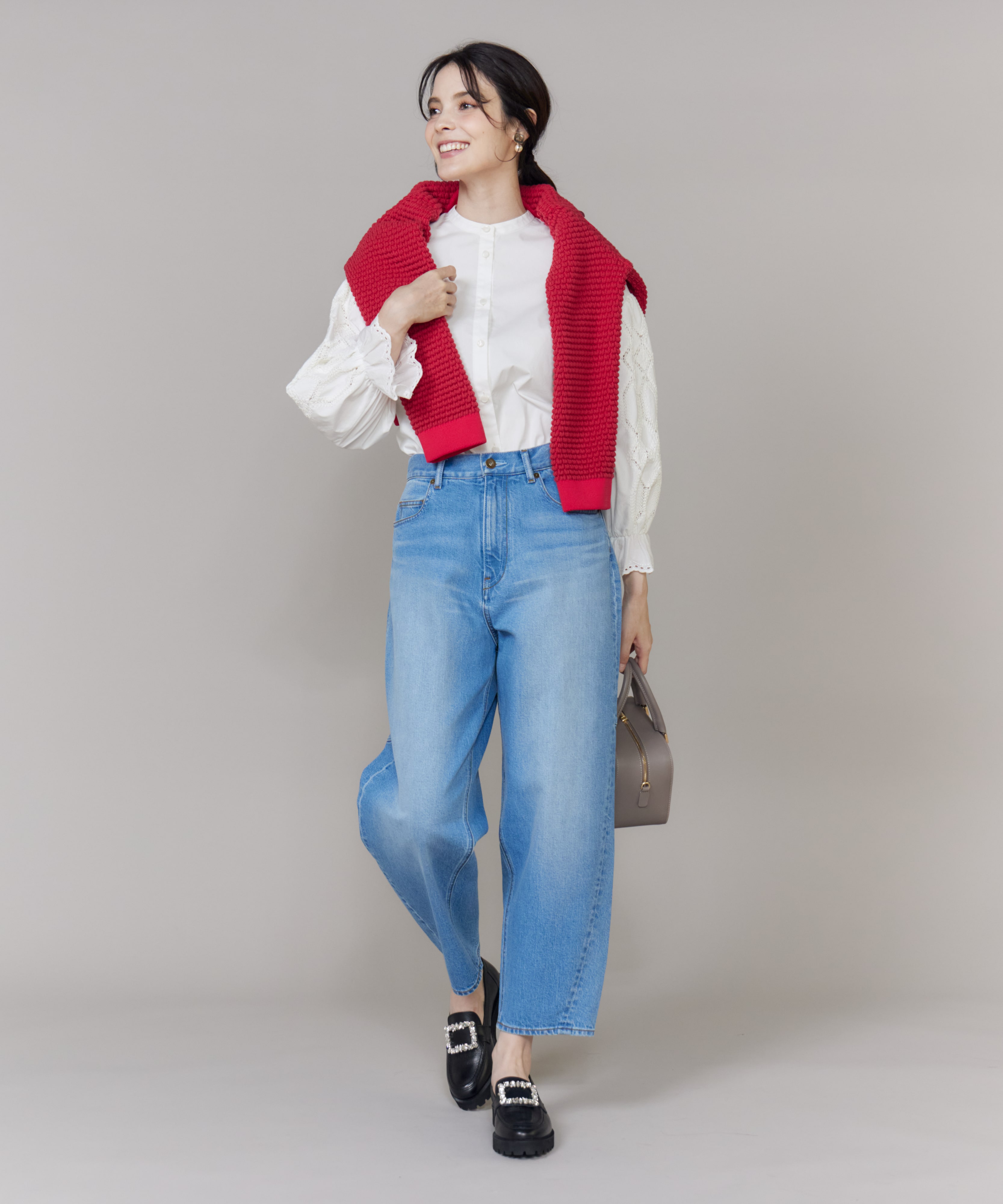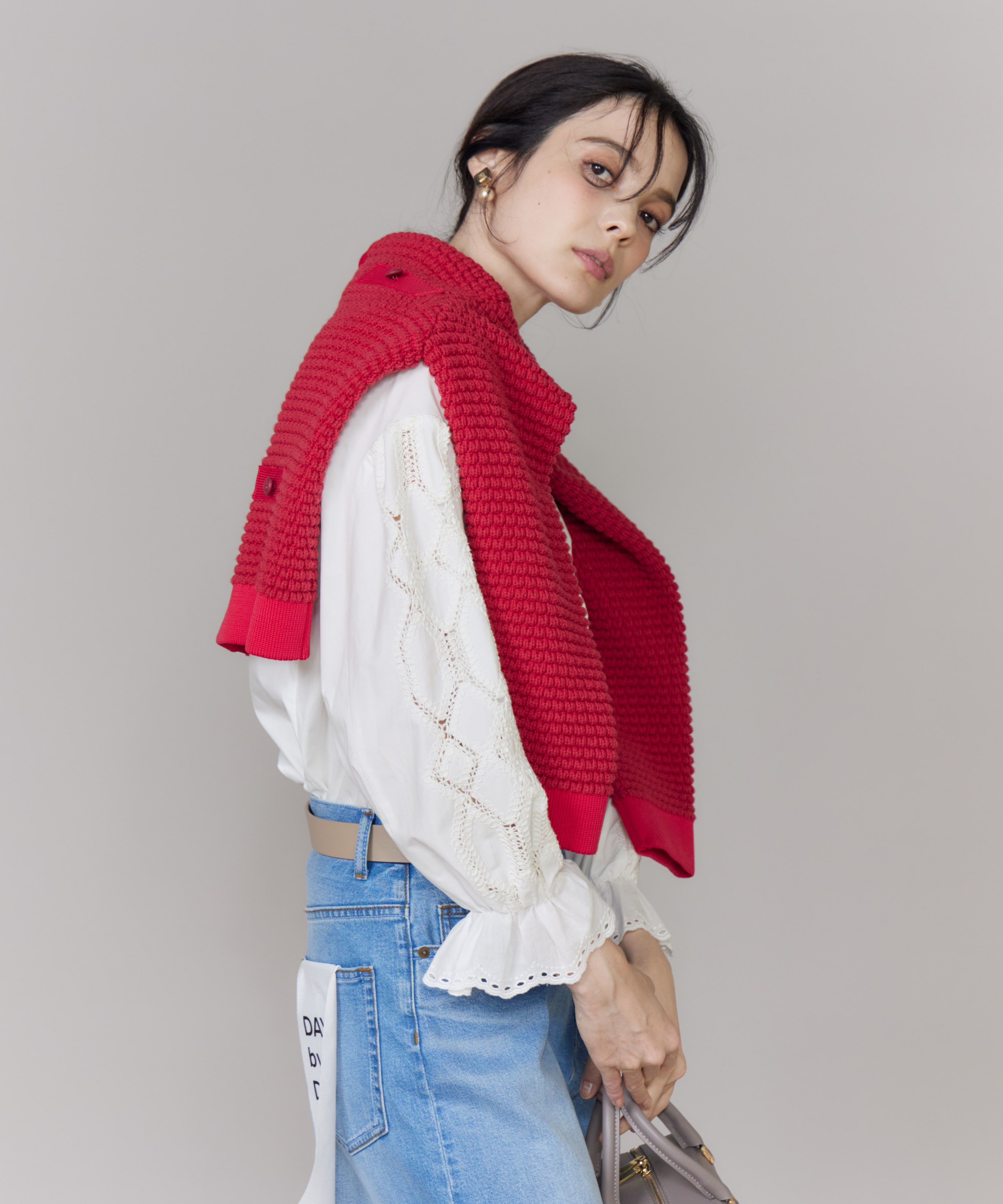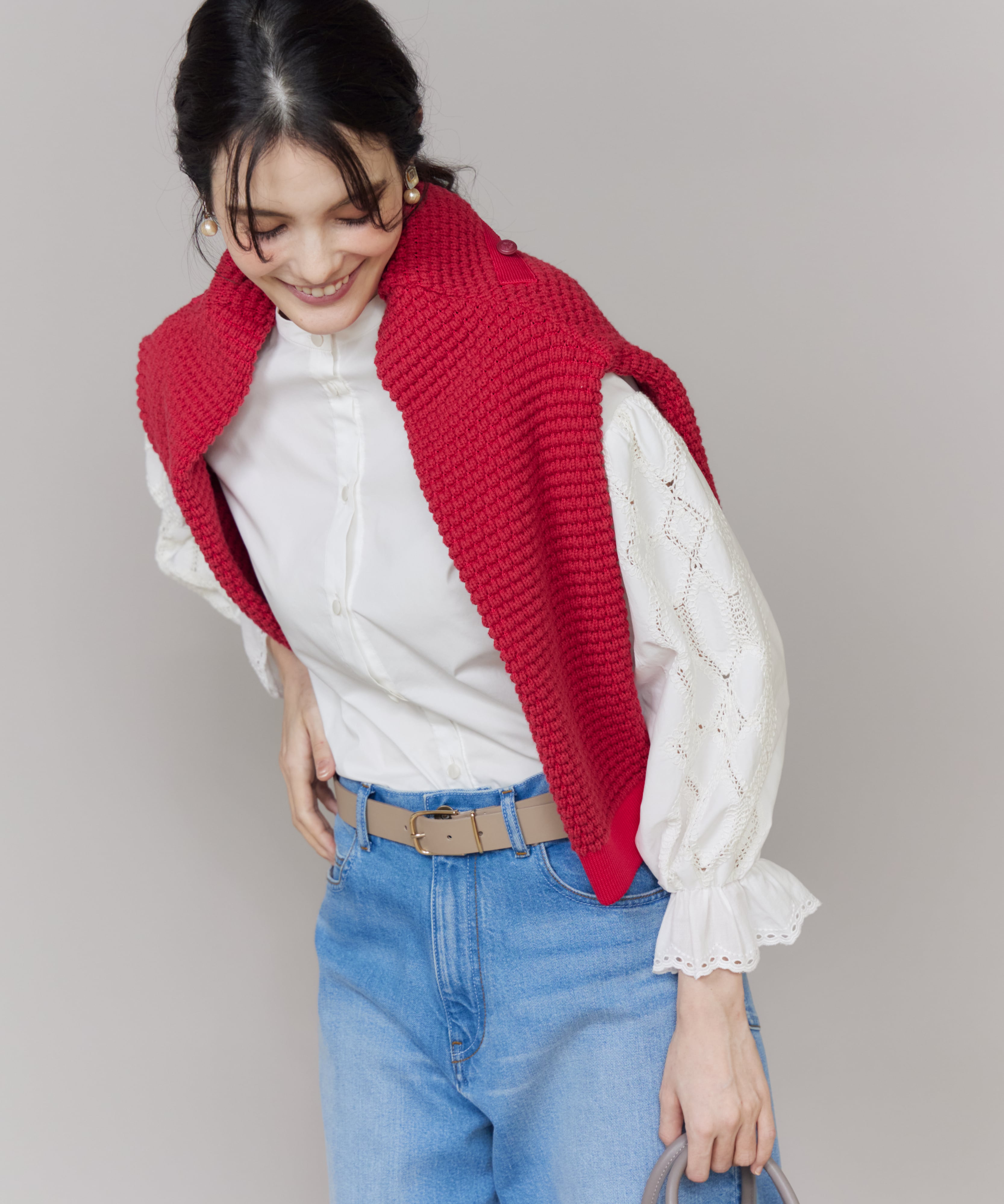 こだわりの刺繍やオリジナルレースをあしらった表情豊かなレディライクなブラウスに、デニムを合わせて抜け感をプラス。甘さとカジュアルのバランスが絶妙な、大人にふさわしいスタイルに仕上がります。秋の始まりは、気温調節しやすいカーディガンを肩掛けして、こなれ感を演出するのもおすすめ。