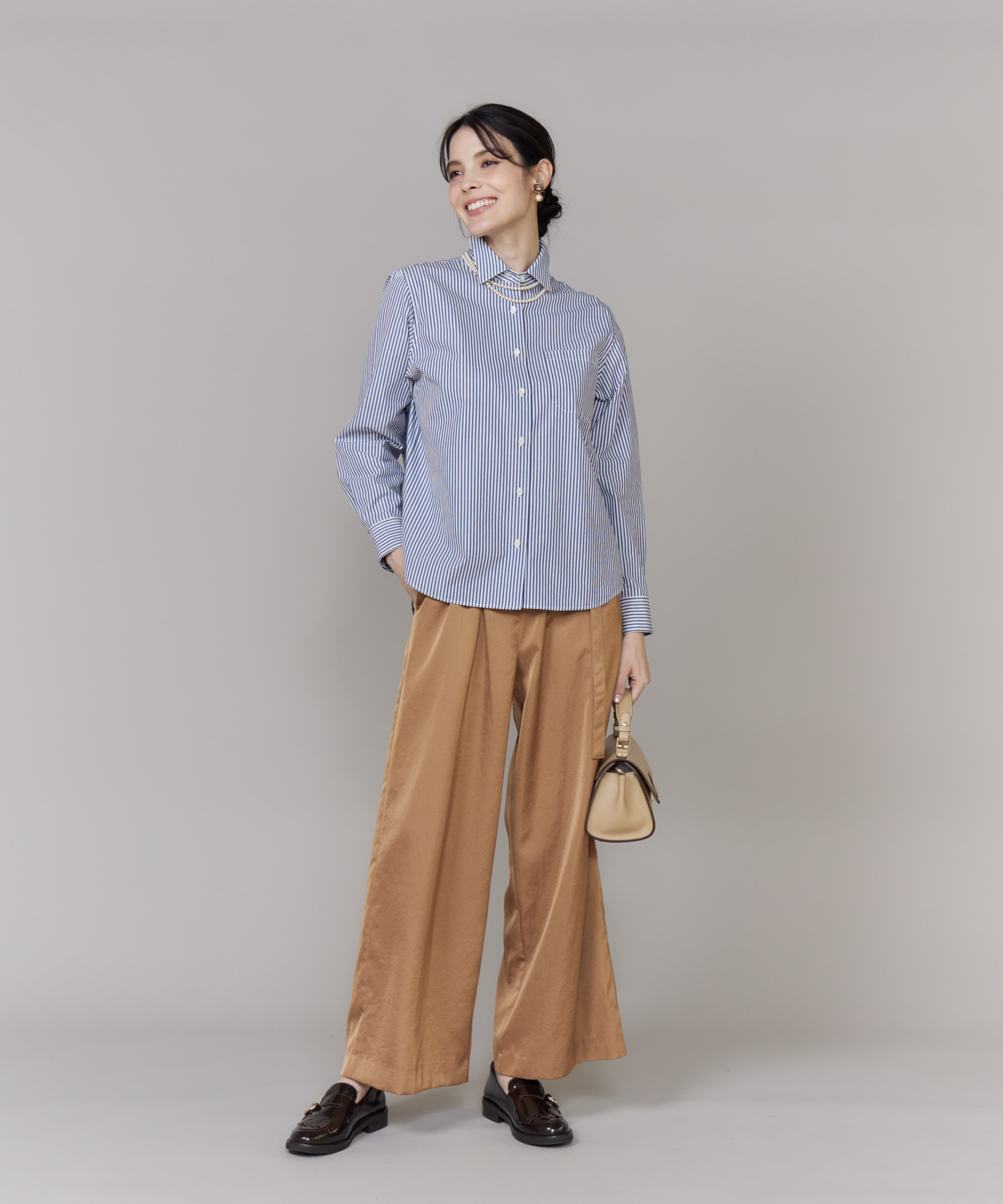 シンプルに一枚で着ても、レイヤードしても活躍するストライプブラウス。コンパクトなシルエットに華奢なディティールを効かせ、雰囲気のあるベーシックシャツに仕上げました。季節が進んだらニットジレを重ね、トレンドの艶感ボトムを合わせれば、大人らしいエレガントカジュアルが完成。ワードローブに一枚あると、秋のおしゃれがぐっと広がります。