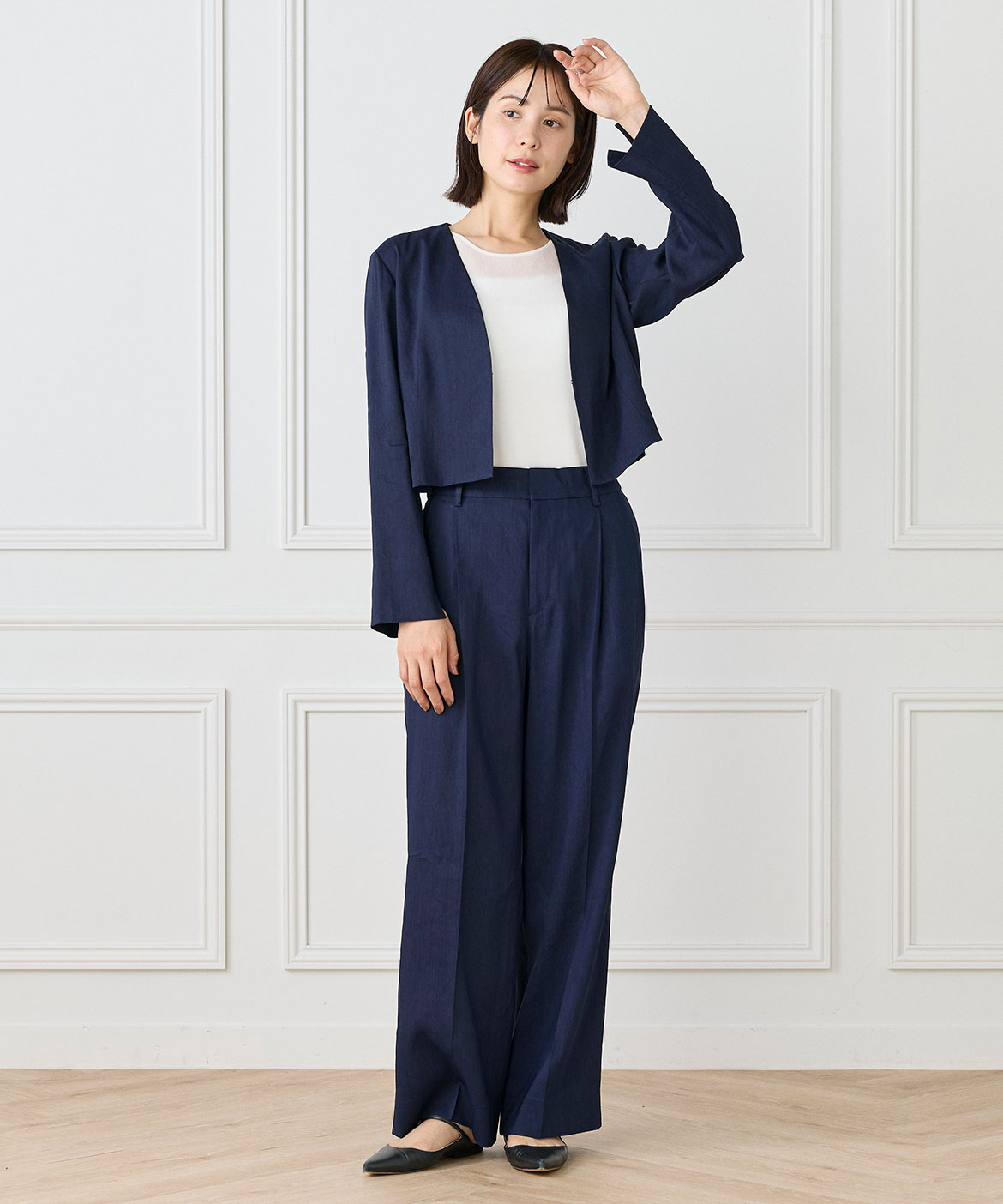 トレンド感のあるスペンサージャケット。前中心突合せのVネックが、より今年らしく着て頂けるよう仕上げています。エレガントなシルエットがリュクスな印象を醸し、都会的な品の良さを確立します。コンパクトな丈感なので、スタイルアップ効果も期待できます。カフスを折り上げてこなれ感のある着こなしも素敵です。同素材のパンツとのセットアップが可能で、よりモードなスタイリングが完成します。内側の 配色のパイピングが存在感があり、高見えさせてくれます。