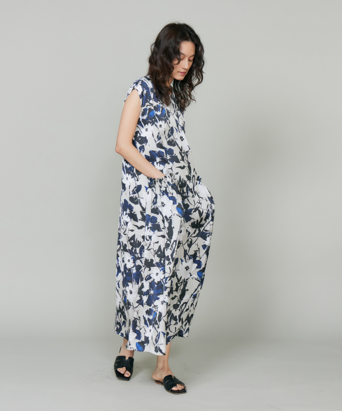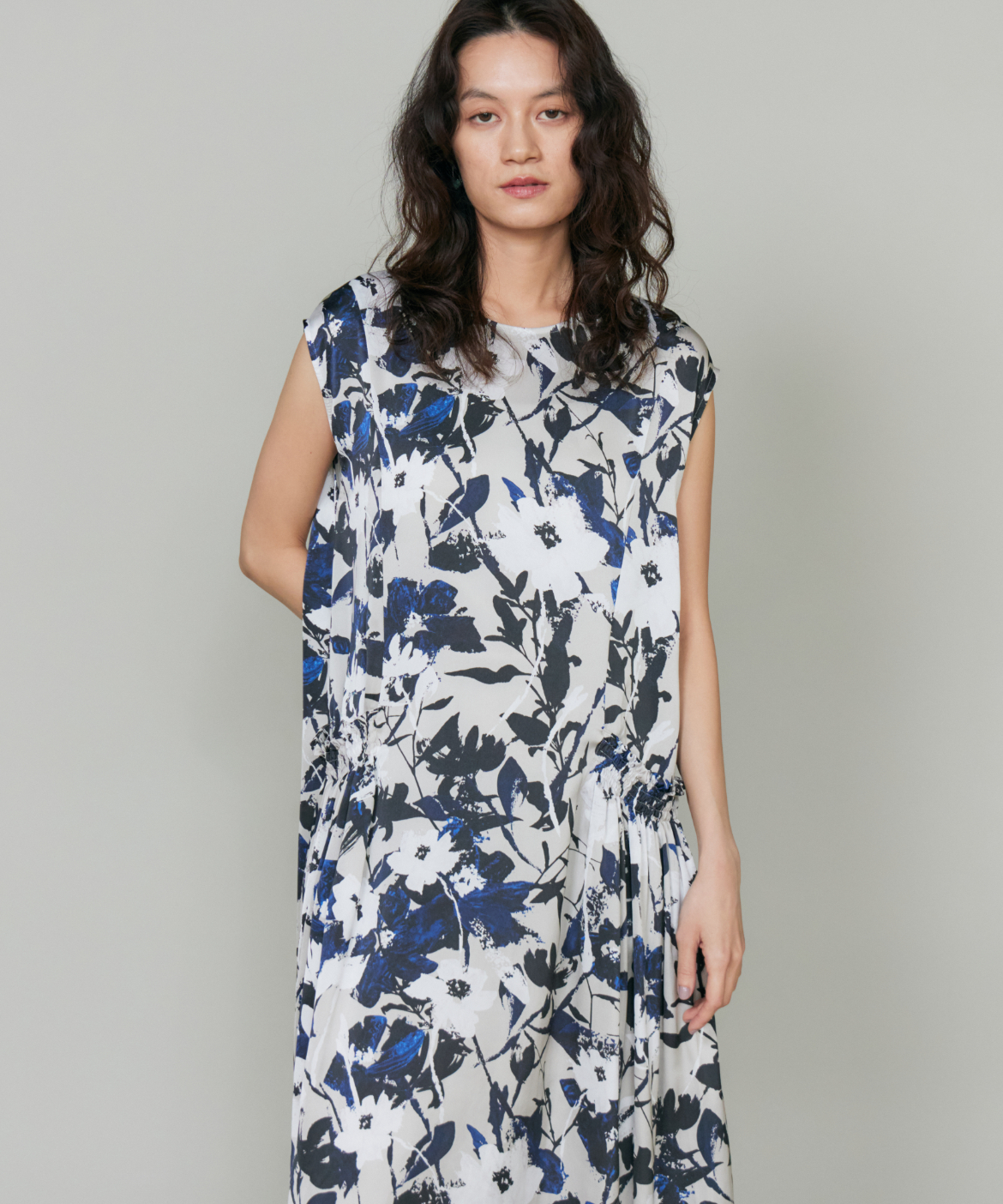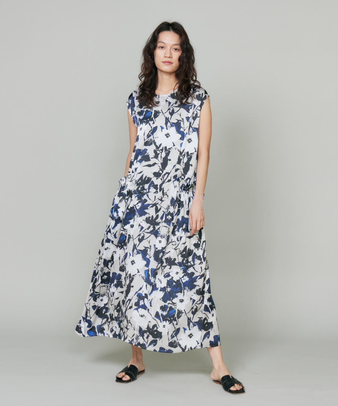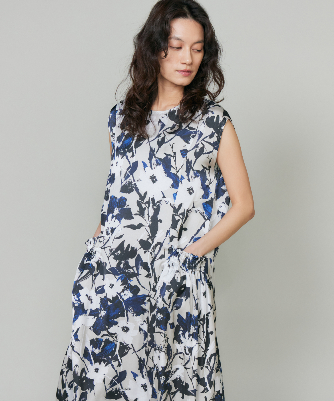 上品なフラワーモチーフのプリントワンピース。陰影をつけたオリジナルの柄とシャーリングディテールを施したポケットがアクセント。リラックス感のあるやや裾広がりのシルエットは、清涼感がありながらも都会的な印象に。ニュアンスのある素材使いで動くたびに軽やかなヘムラインを演出します。華奢なネックラインとやや広めのショルダーラインが上品さを引き立てます。
