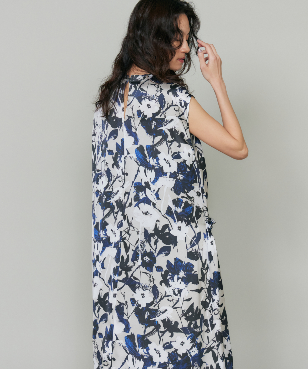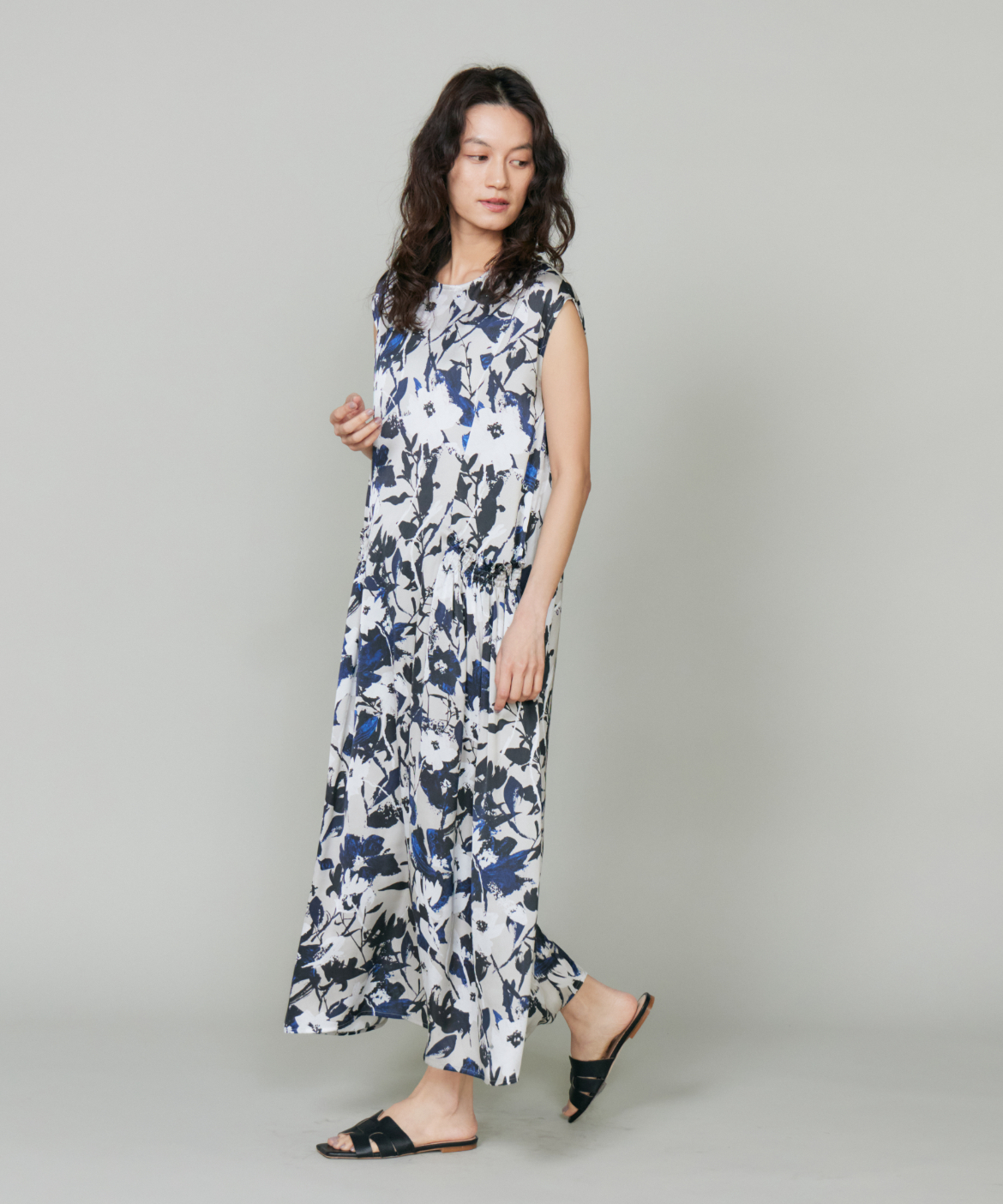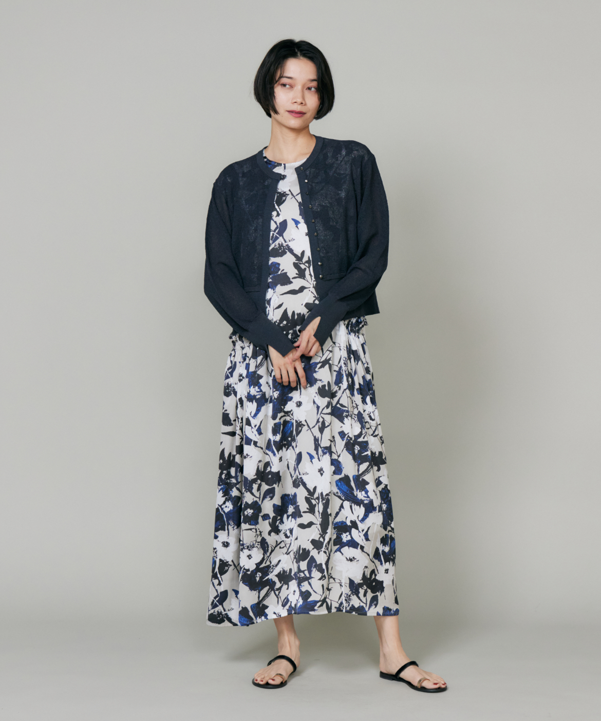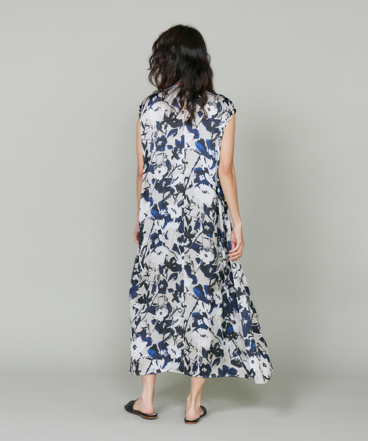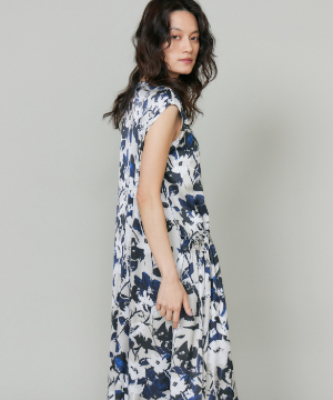 上品なフラワーモチーフのプリントワンピース。陰影をつけたオリジナルの柄とシャーリングディテールを施したポケットがアクセント。リラックス感のあるやや裾広がりのシルエットは、清涼感がありながらも都会的な印象に。ニュアンスのある素材使いで動くたびに軽やかなヘムラインを演出します。華奢なネックラインとやや広めのショルダーラインが上品さを引き立てます。