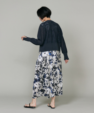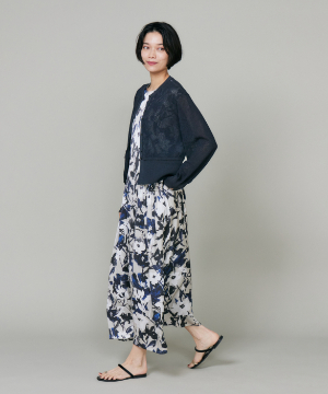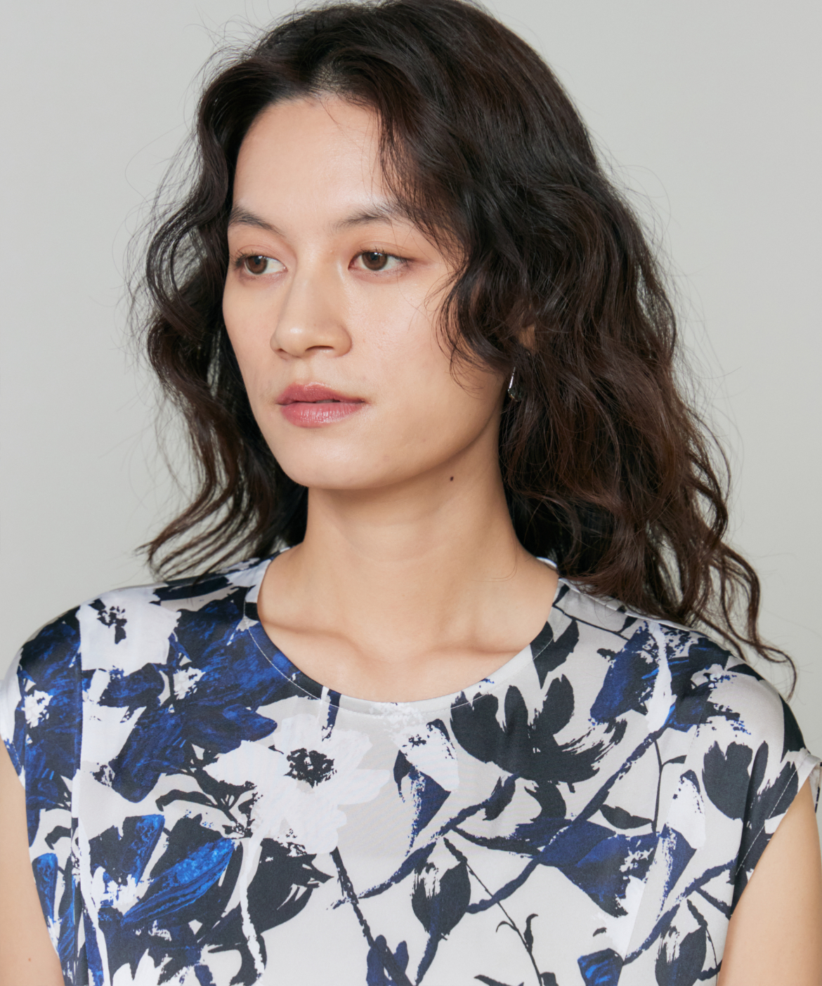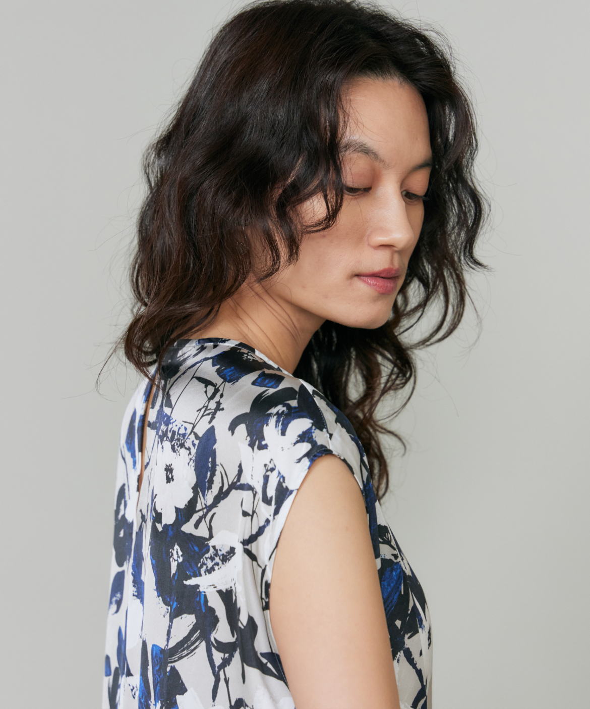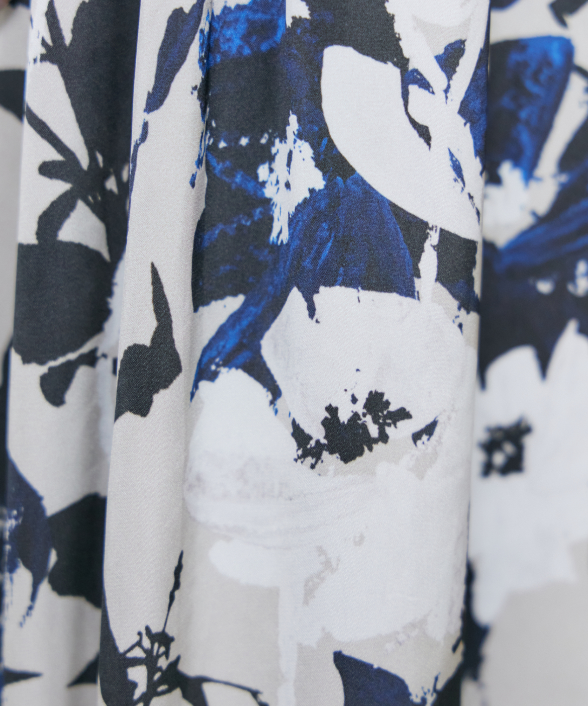 上品なフラワーモチーフのプリント素材。陰影をつけたオリジナルの柄とセーレン(株)の「ビスコテックス」による奥行きのあるカラー表現が特徴です。すっきりとした、ニュアンスのあるカラーで穏やかな清涼感を演出しました。ちりめんサテン素材にプリントする事で上質感のある表情をプラス。軽くて滑りが良く、落ち感のある着心地の良い素材感もポイントです。