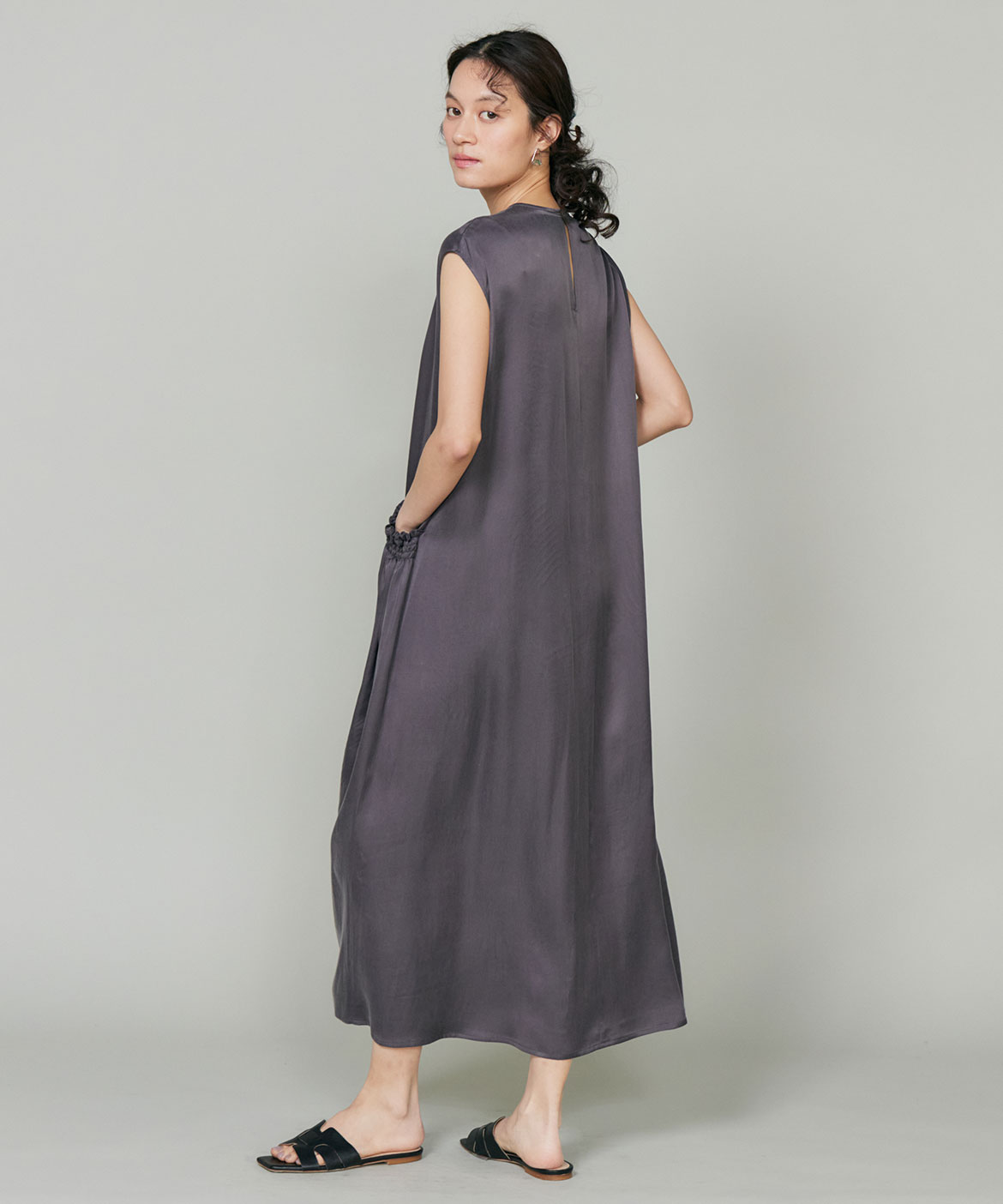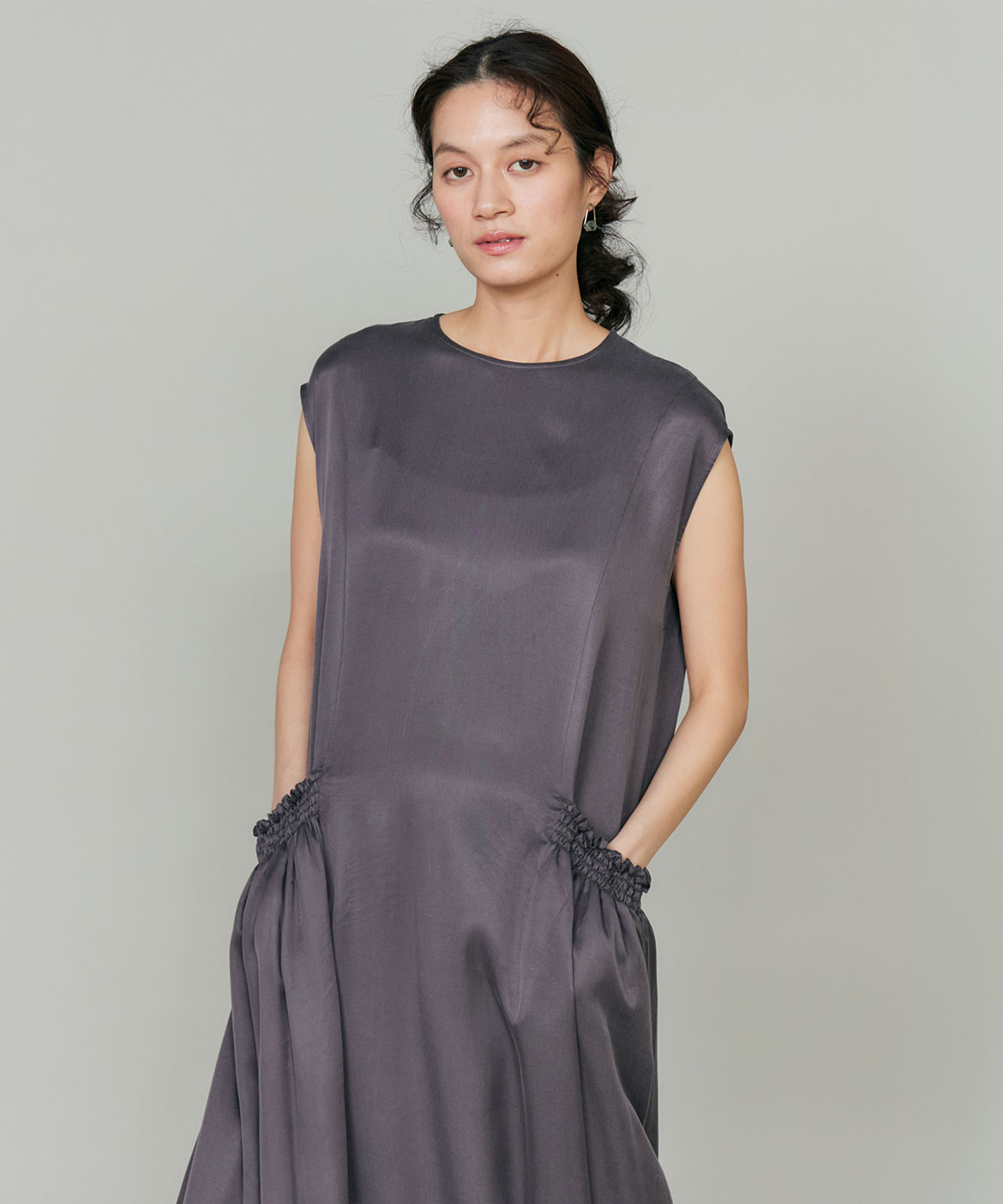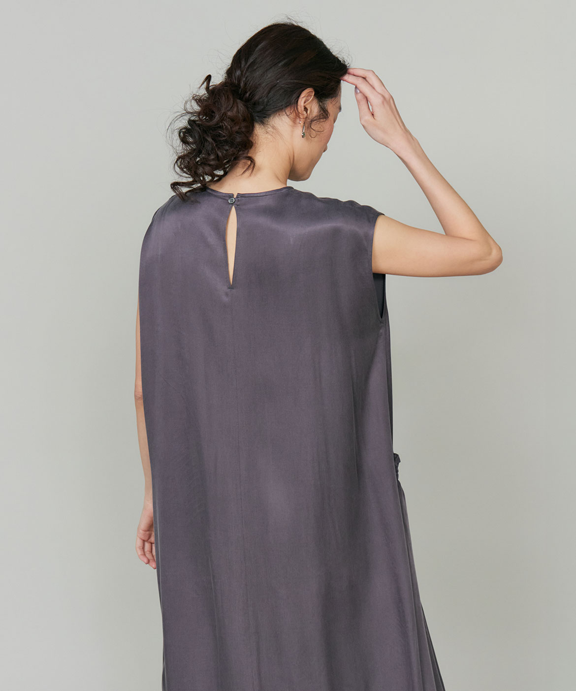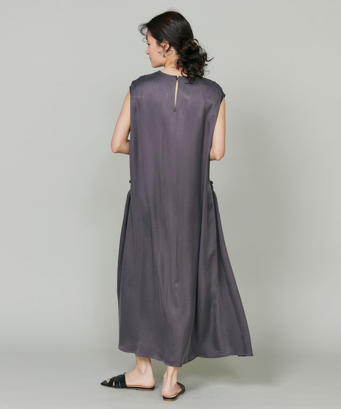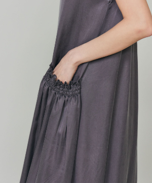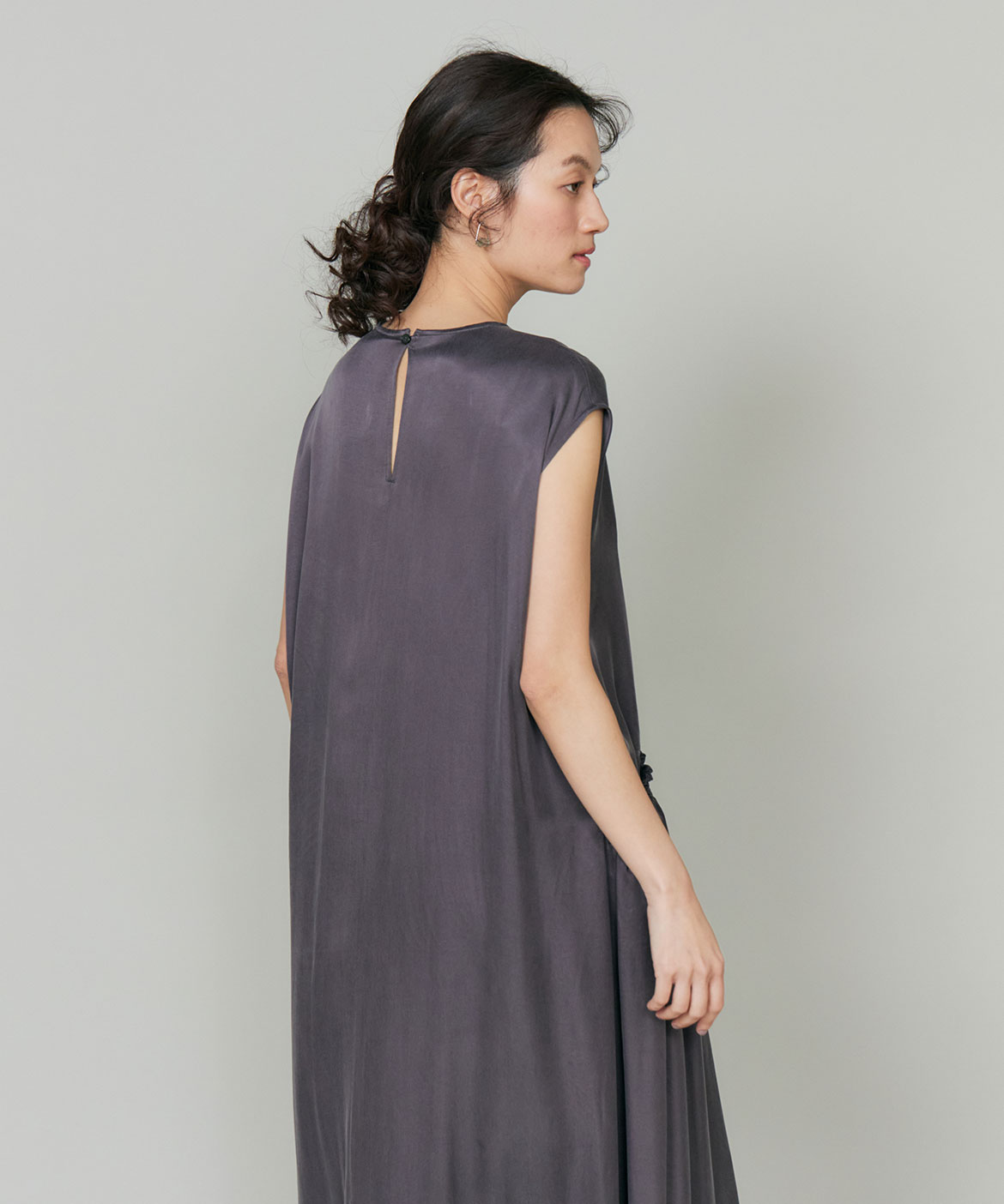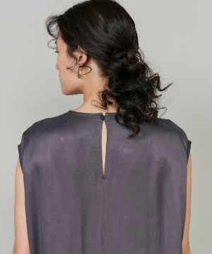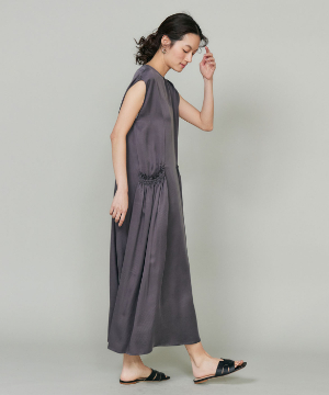 のワンピース。リラックス感のあるやや裾広がりのシルエットは、清涼感がありながらも都会的な印象に。ニュアンスのある素材使いで動くたびに軽やかなヘムラインを演出します。華奢なネックラインとやや広めのショルダーラインが上品さを引き立てます。