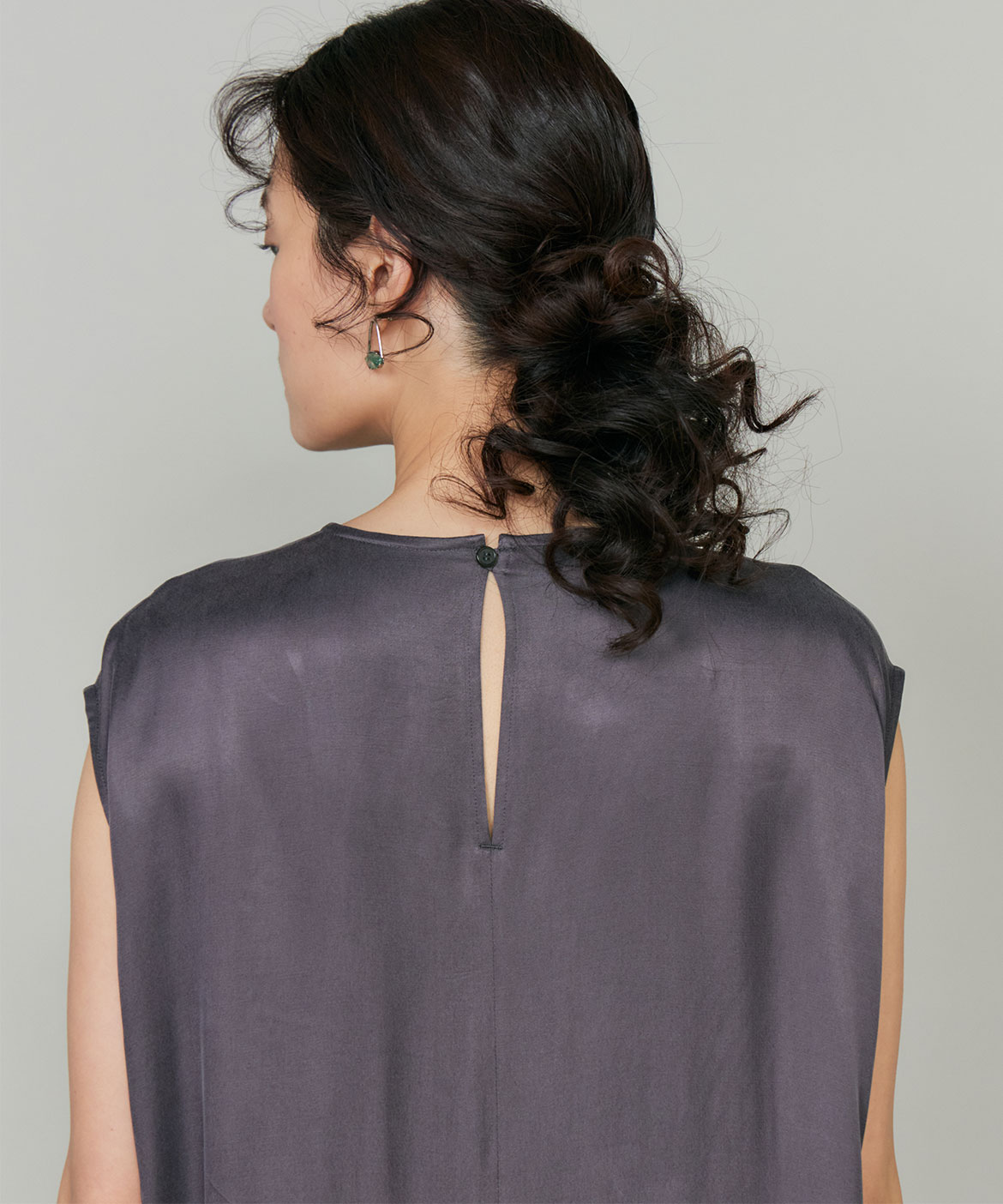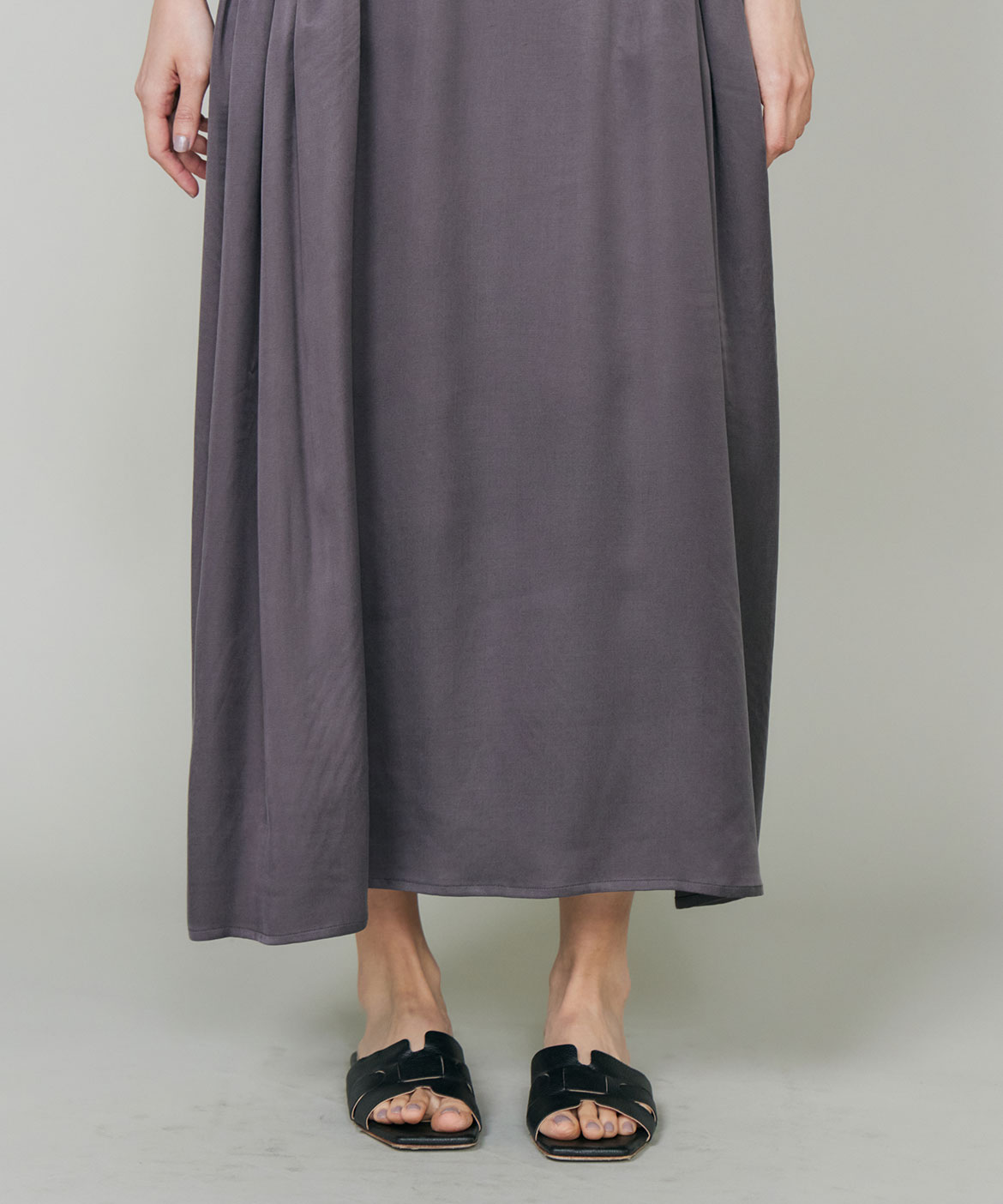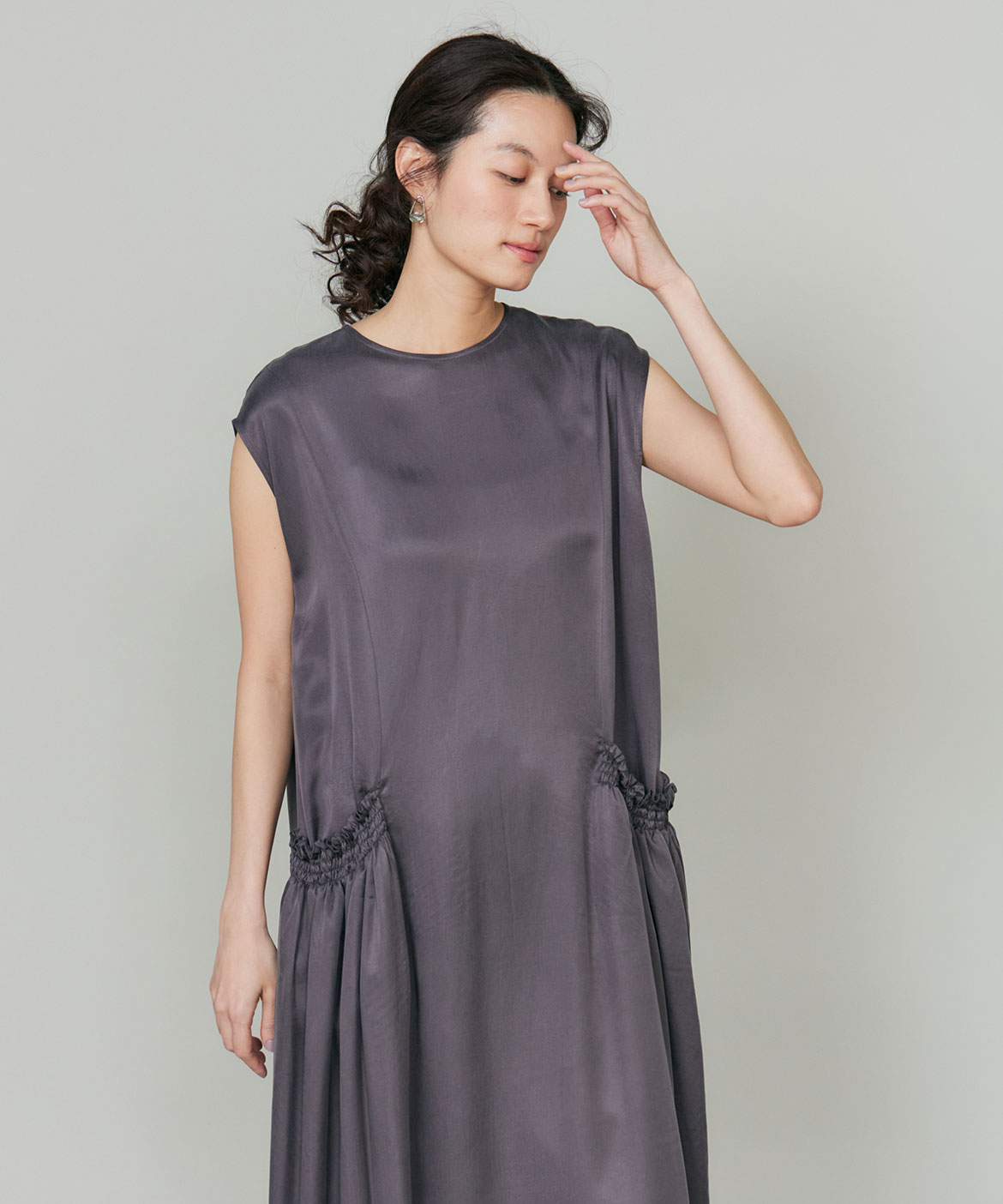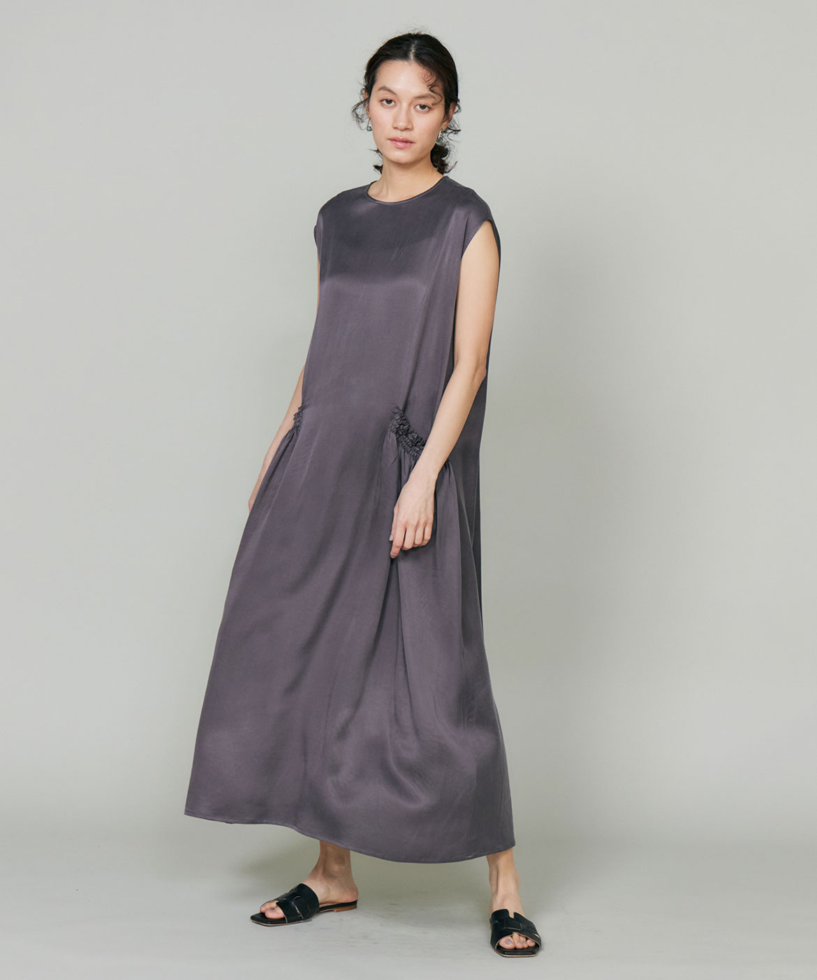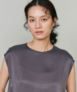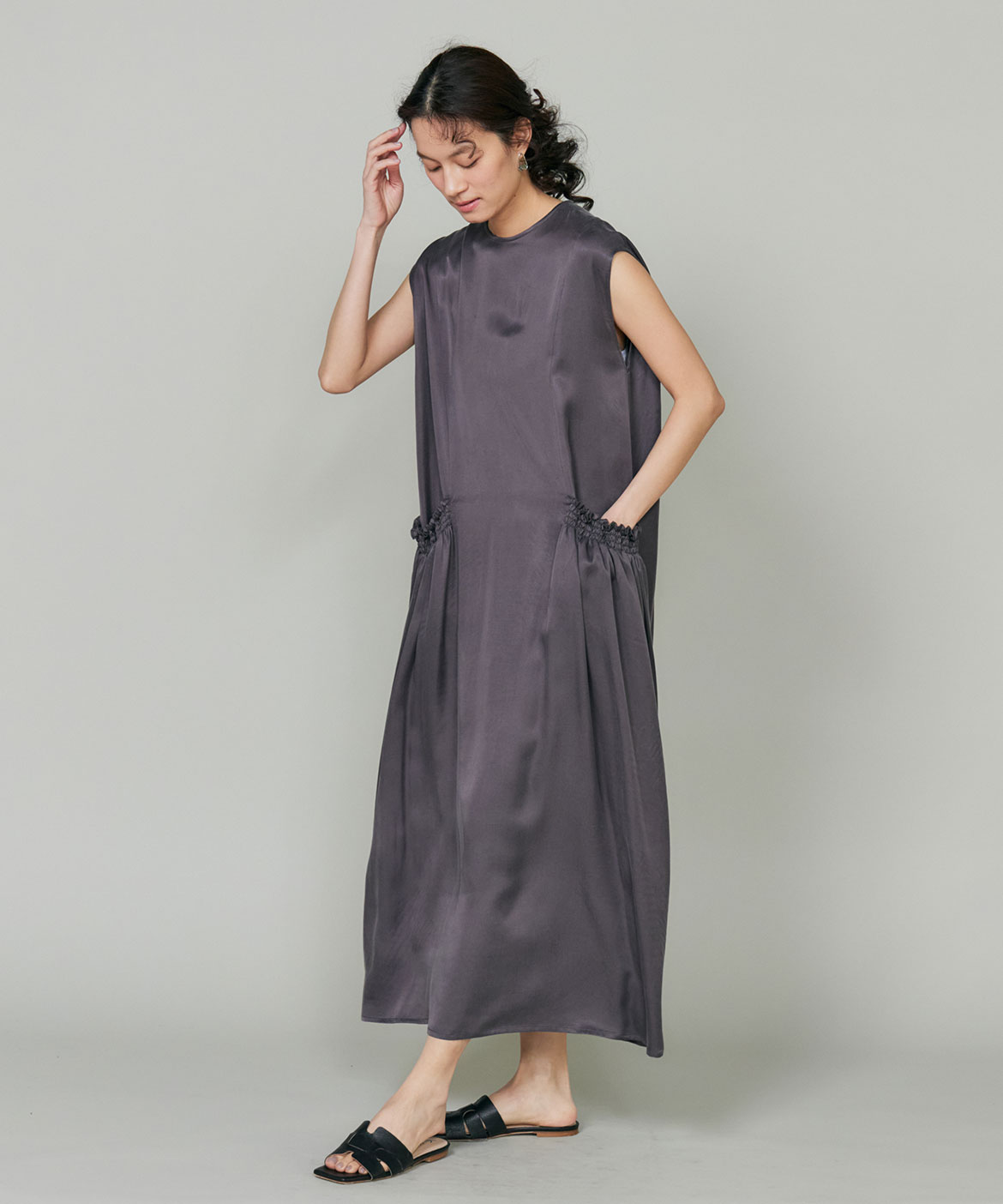 のワンピース。リラックス感のあるやや裾広がりのシルエットは、清涼感がありながらも都会的な印象に。ニュアンスのある素材使いで動くたびに軽やかなヘムラインを演出します。華奢なネックラインとやや広めのショルダーラインが上品さを引き立てます。