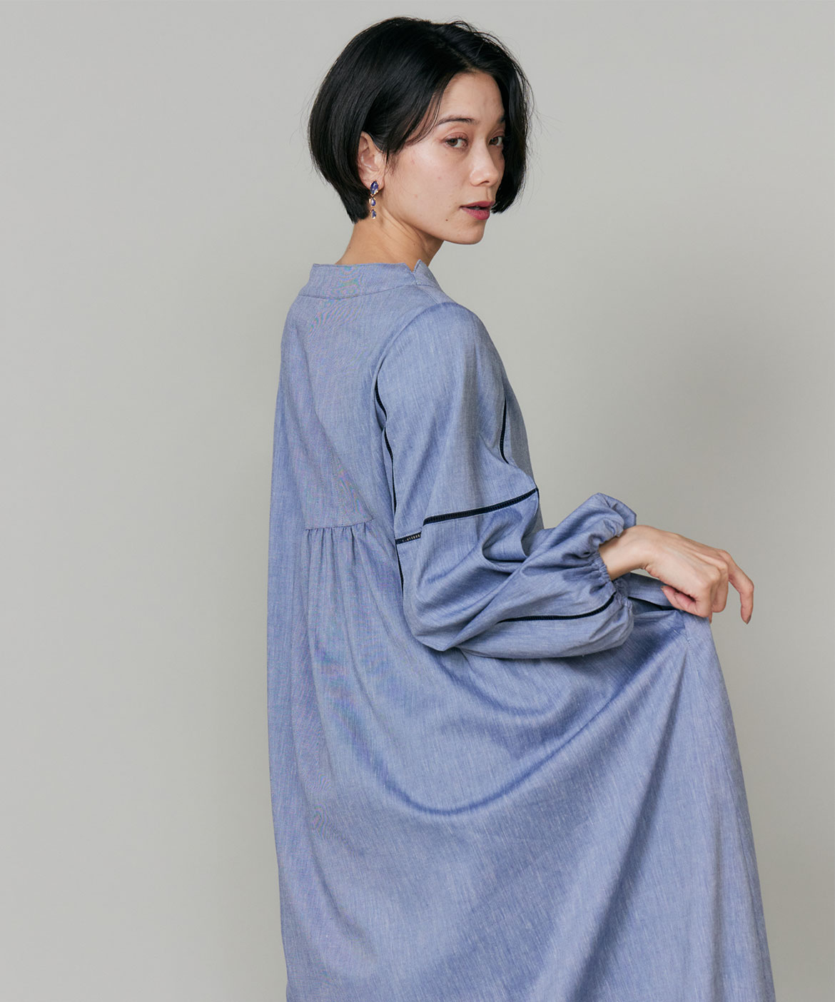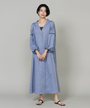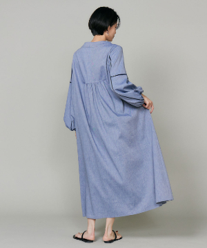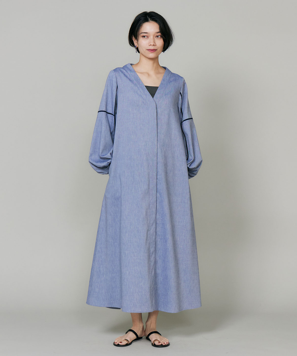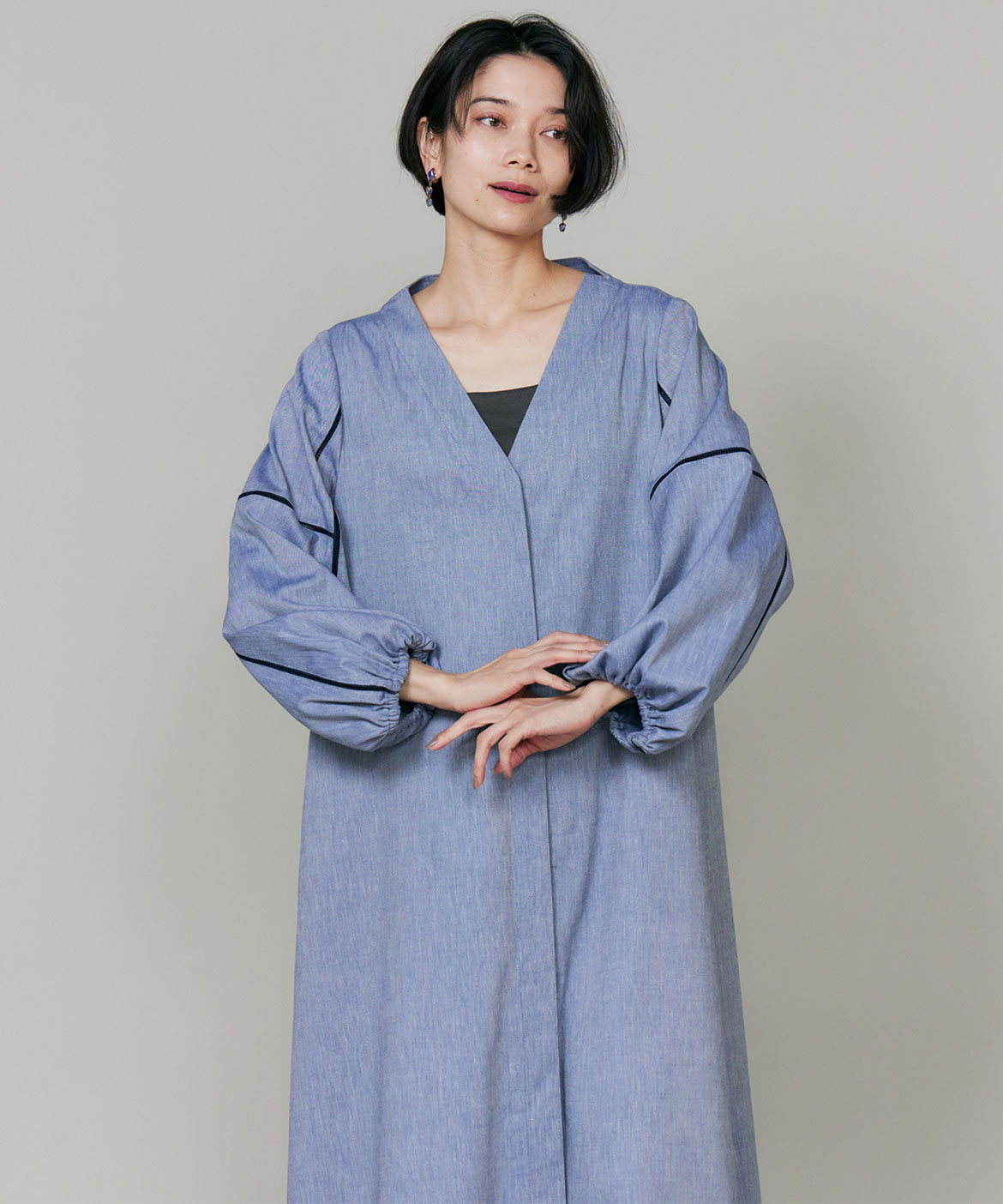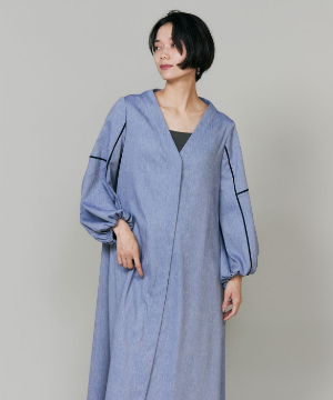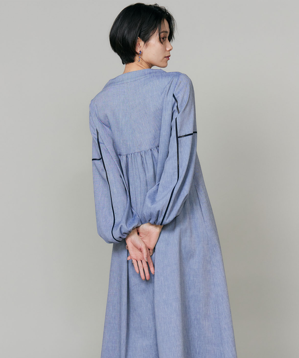 すっきりとしたVネックラインがポイントの前あきワンピース。ネックラインの刻みディテールや切り替え部分に施したハシゴレース、背中のギャザーディテール等でモード感をプラス。ギャザーを寄せた丸みのある袖口もアクセントに。フロントを開けて羽織ることでレイヤードスタイルも楽しめます。