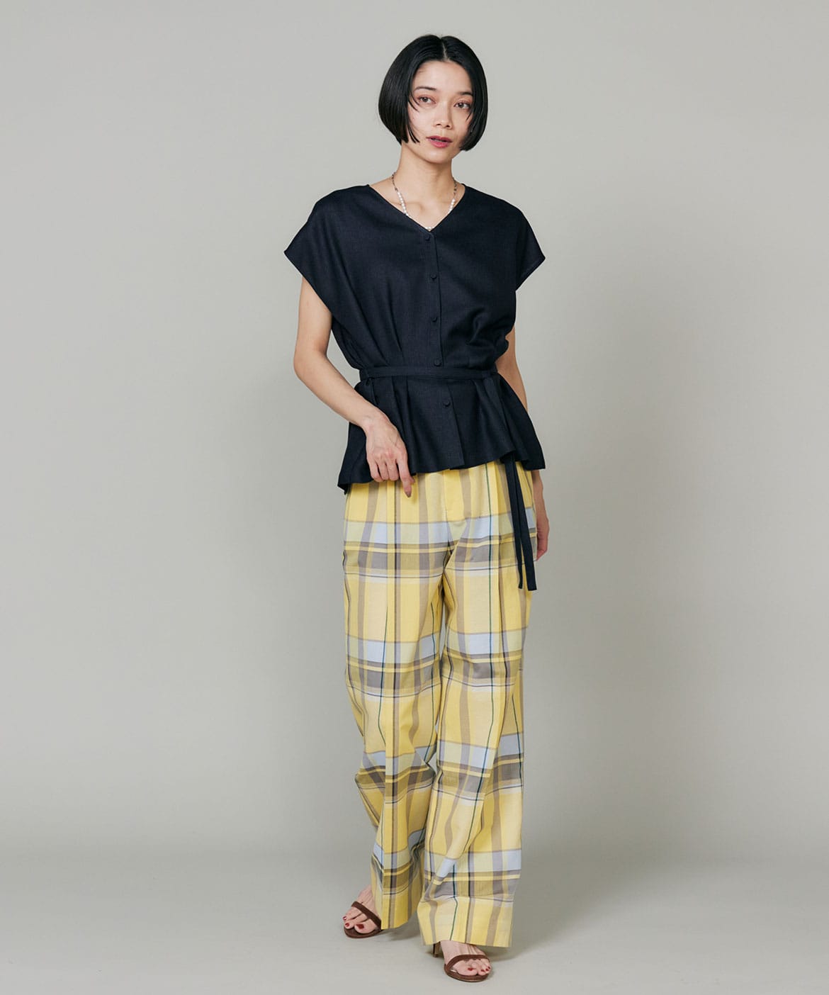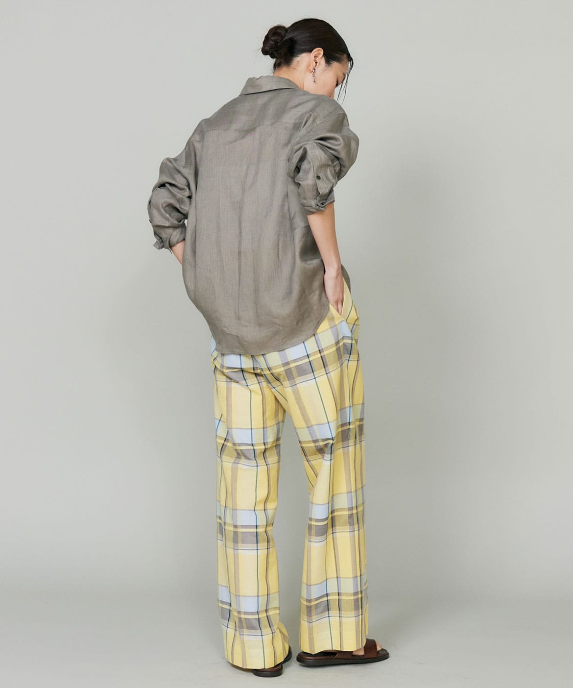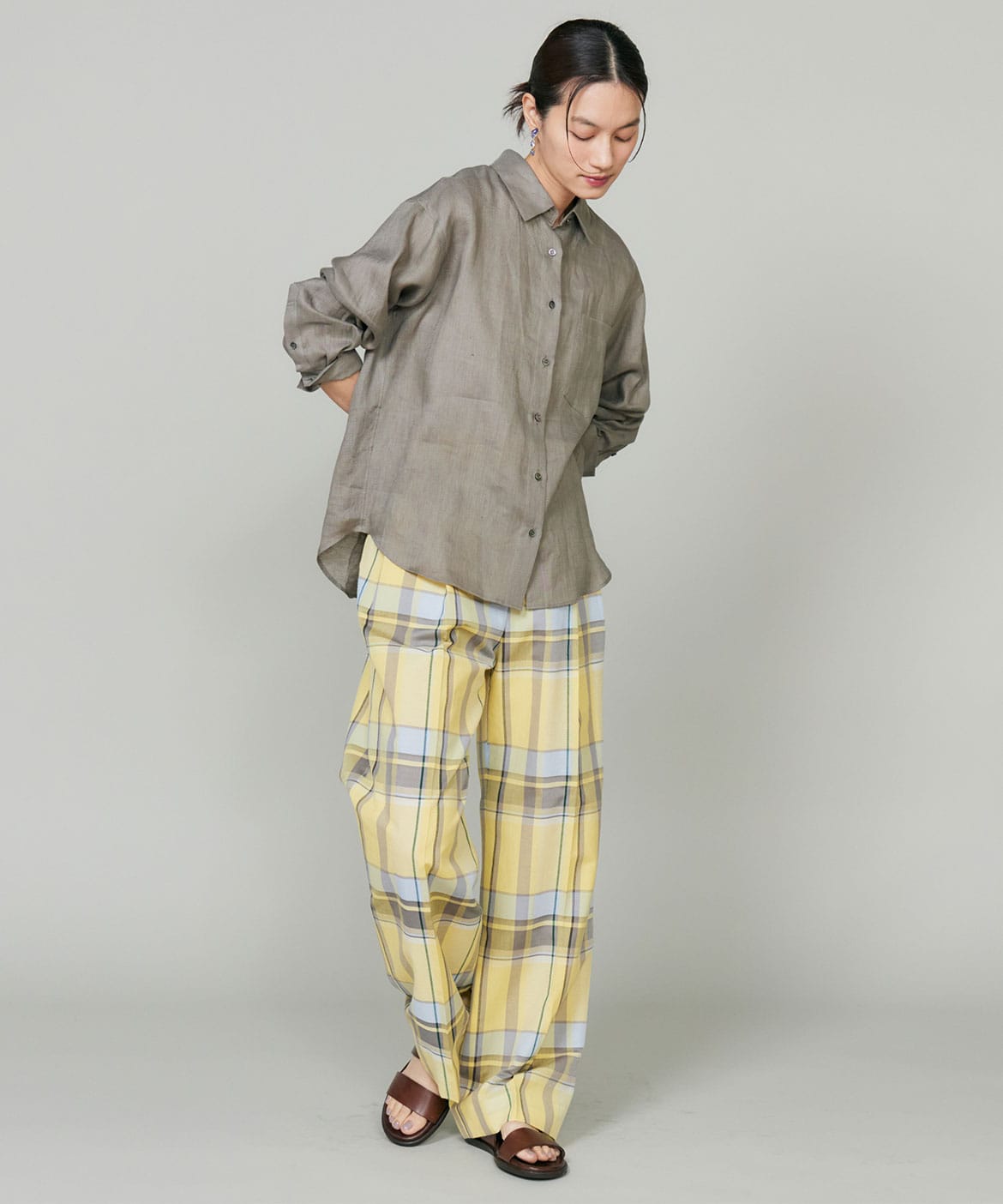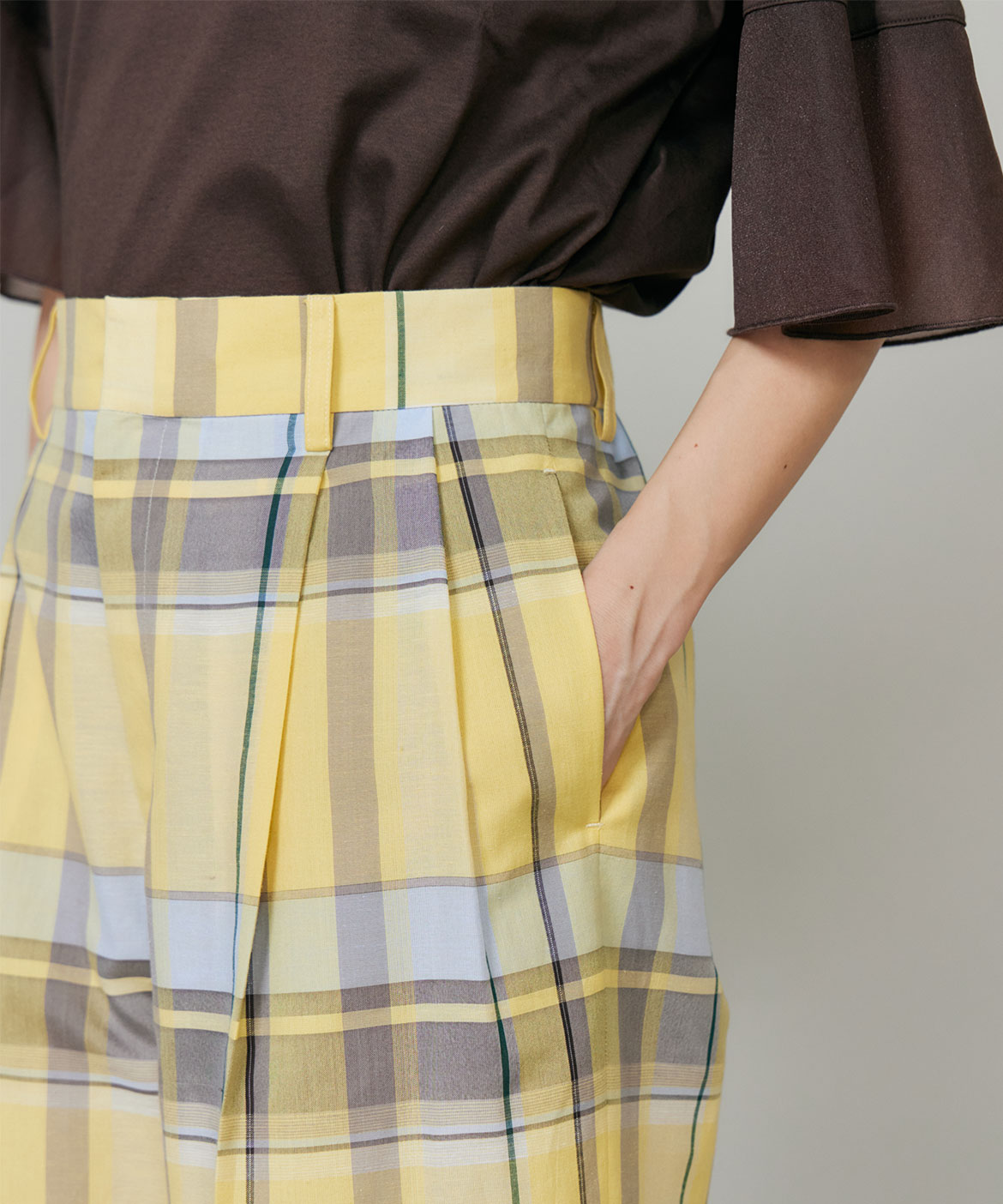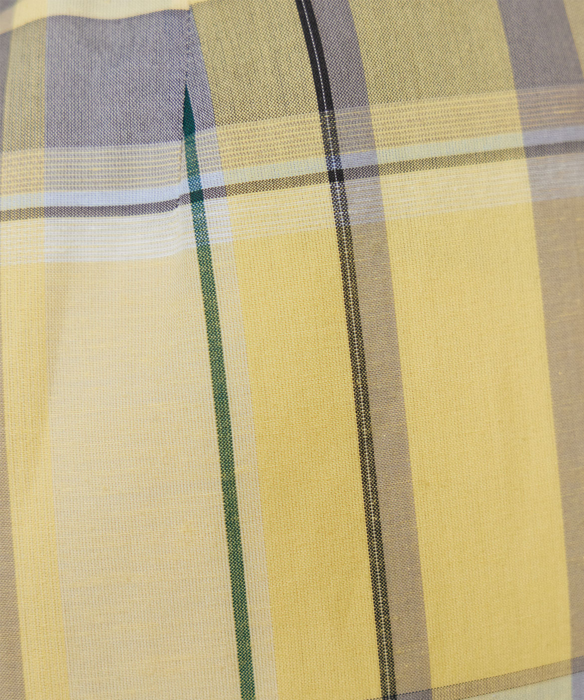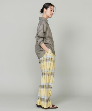 オリジナル柄の先染めチェック素材。上品でリッチ感のある大き目の格子柄がポイント。爽やかな多色使いに拘りました。トレンドの程良いシアー感、軽やかで涼しいドライな素材感で着心地の良さを叶え、上品でナチュラルな麻の表面感が上質さをプラスします。