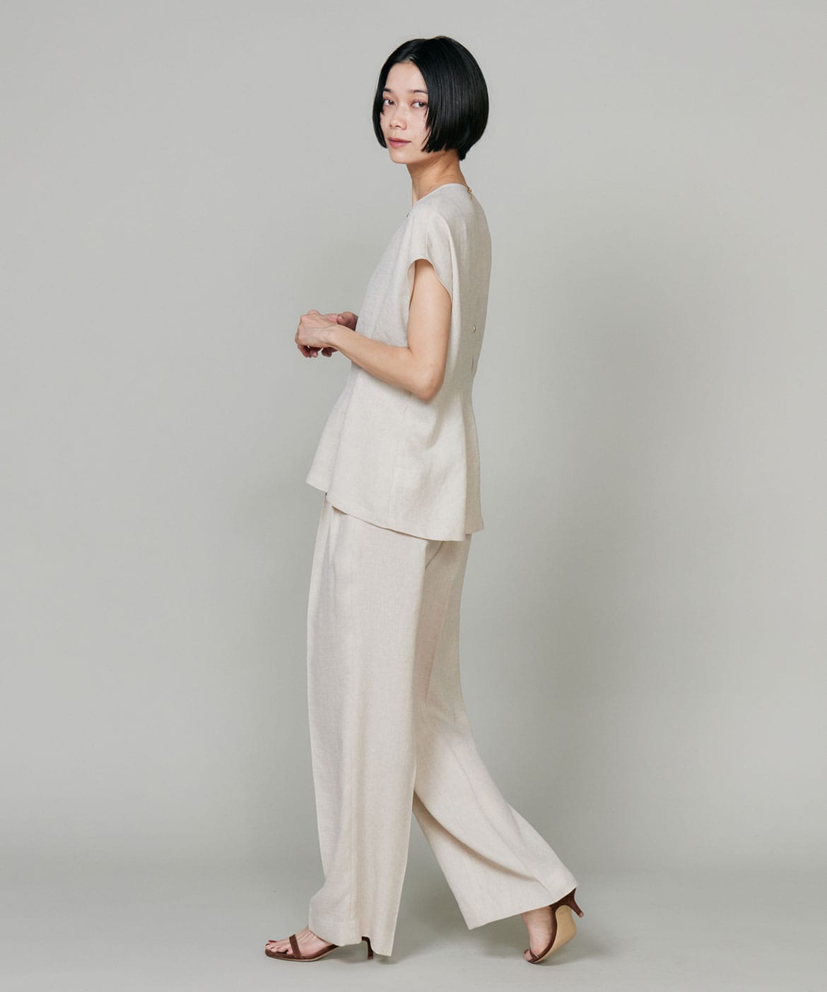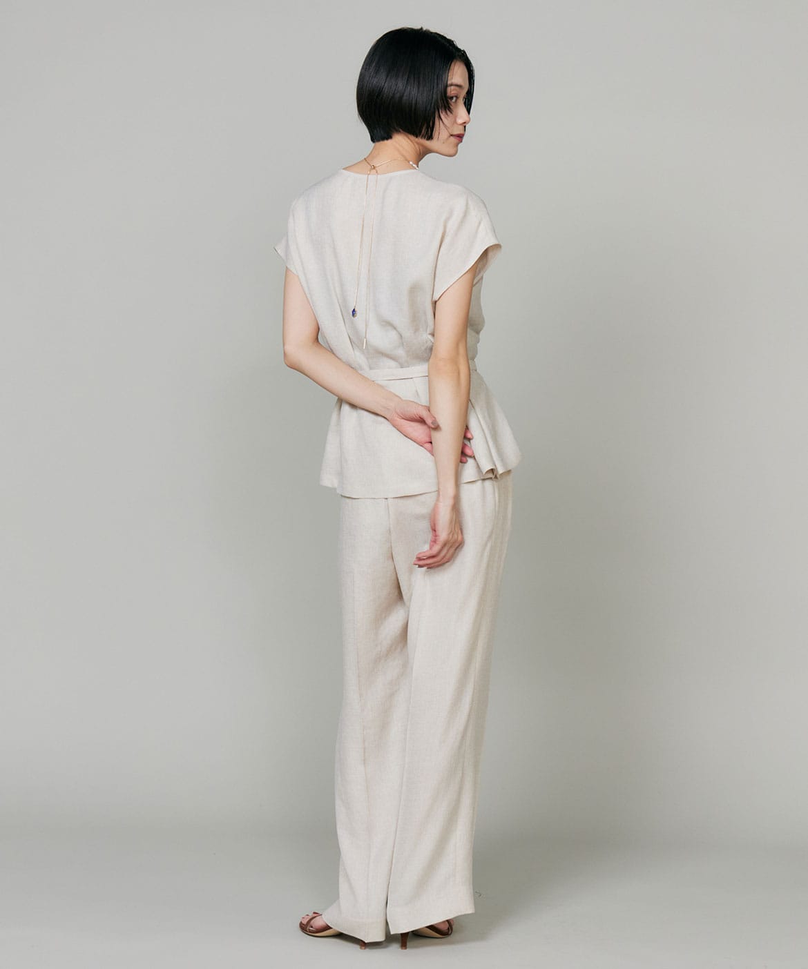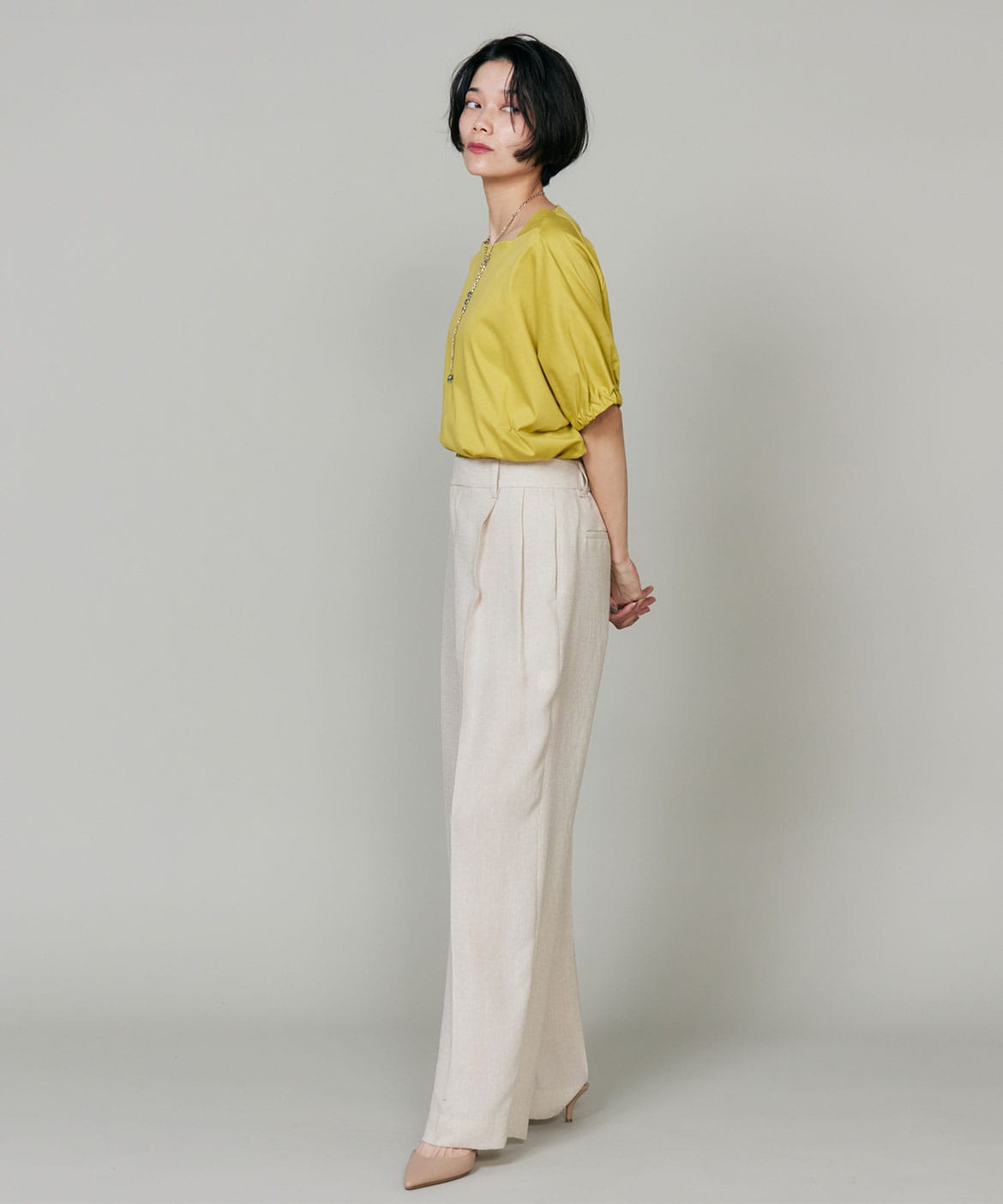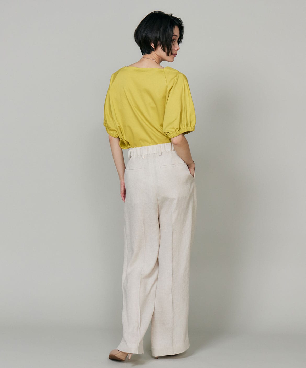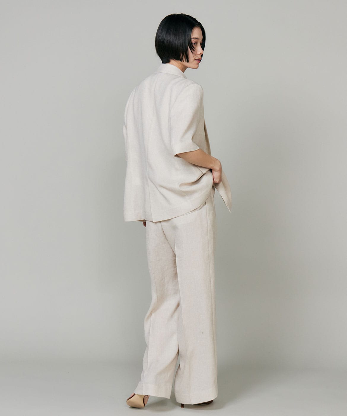 2タックデザインと自然に広がるセミワイドシルエットで分量感がありつつも、ヒップ周りをコンパクトにすることで女性らしいメリハリのあるバランスに。ミニマルな印象でどんなスタイリングにも馴染み、幅広いシーンで活躍してくれる万能なアイテム。小柄な方も高身長な方も綺麗に穿いていただけます。フラットシューズやスニーカーでも美脚になれるパンツです。