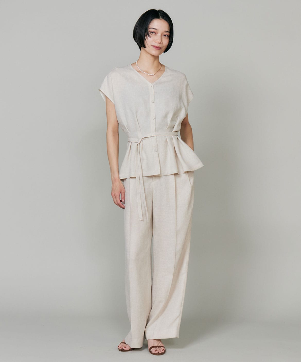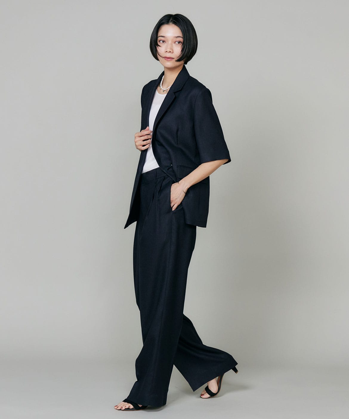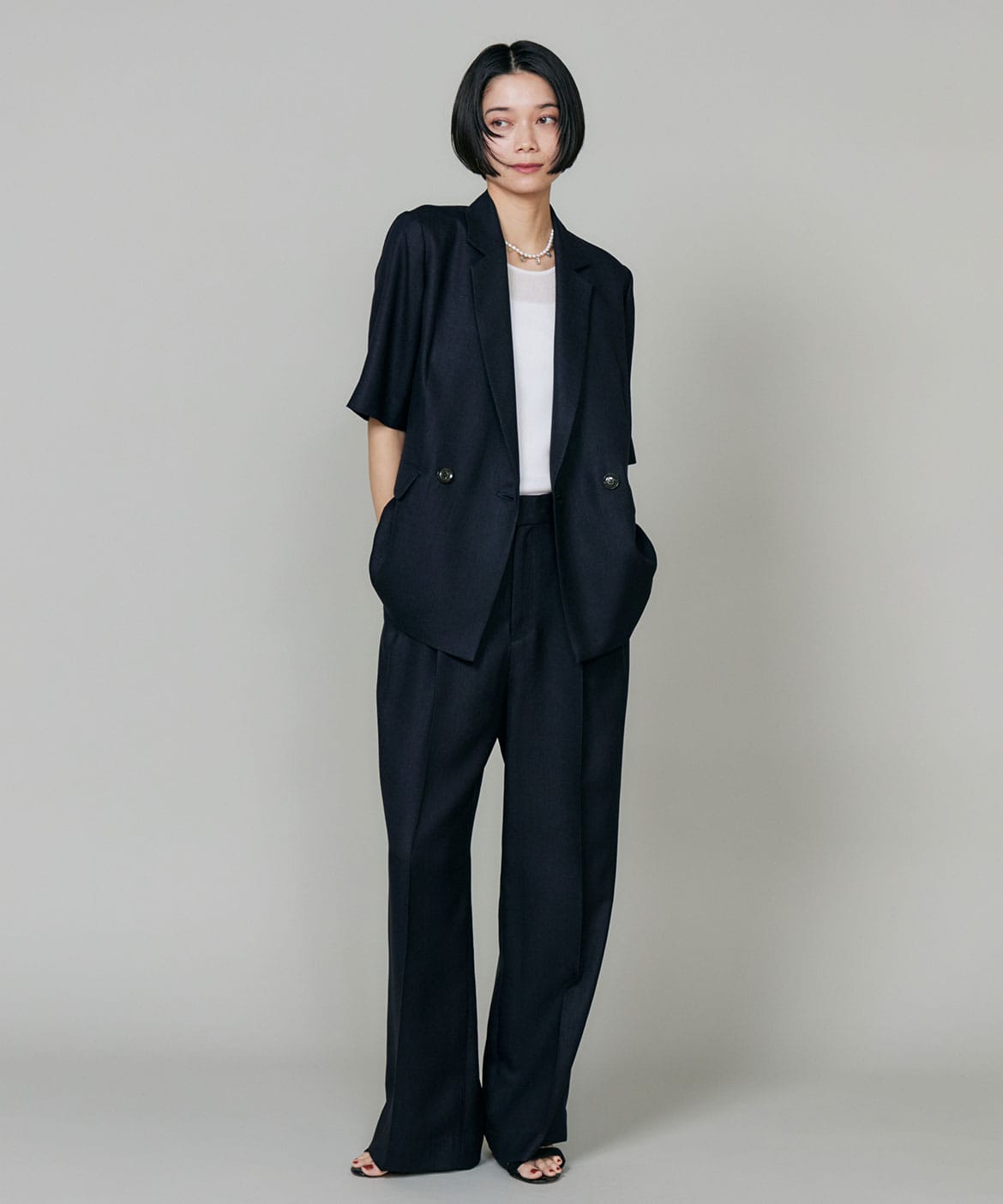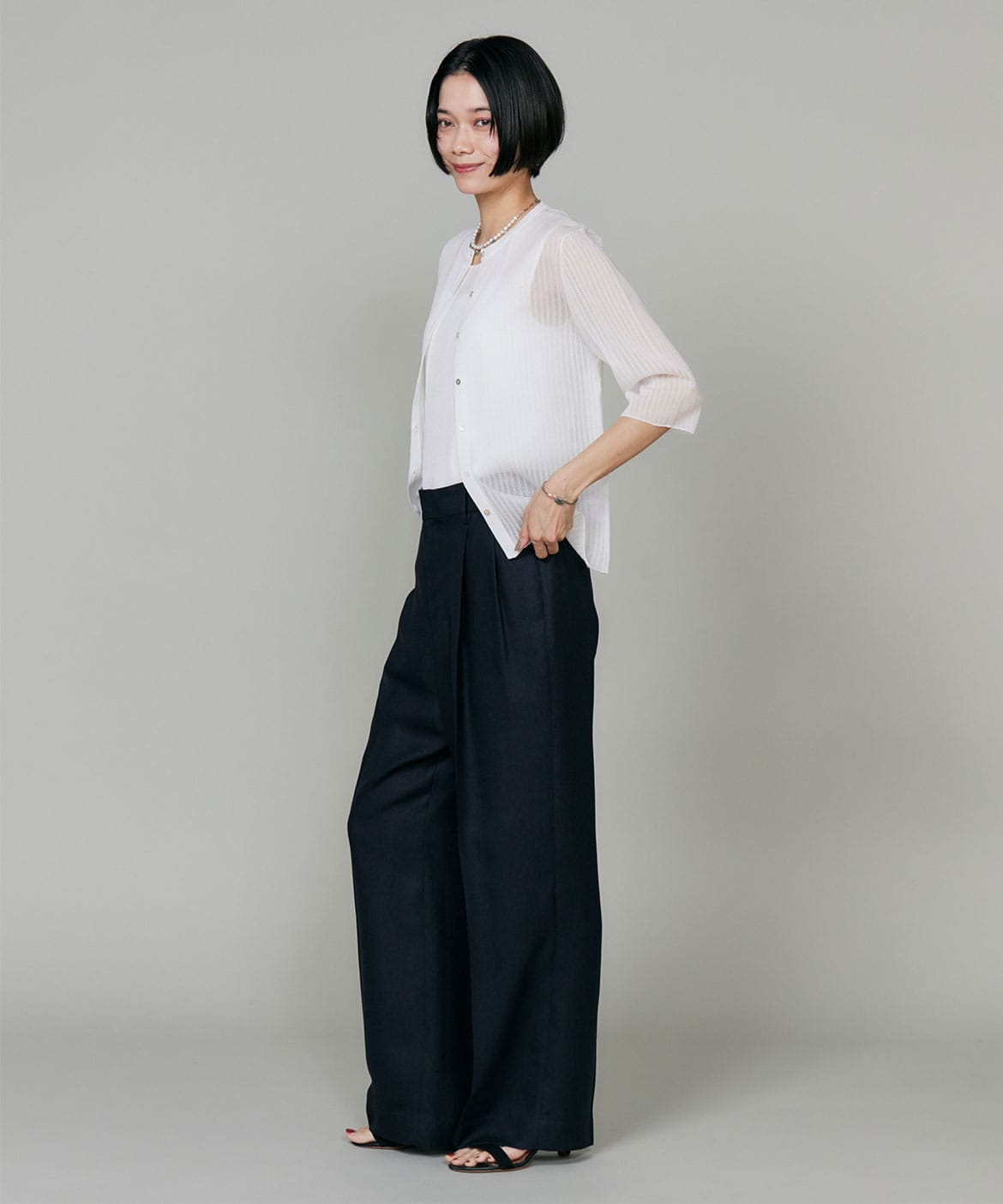 2タックデザインと自然に広がるセミワイドシルエットで分量感がありつつも、ヒップ周りをコンパクトにすることで女性らしいメリハリのあるバランスに。ミニマルな印象でどんなスタイリングにも馴染み、幅広いシーンで活躍してくれる万能なアイテム。小柄な方も高身長な方も綺麗に穿いていただけます。フラットシューズやスニーカーでも美脚になれるパンツです。