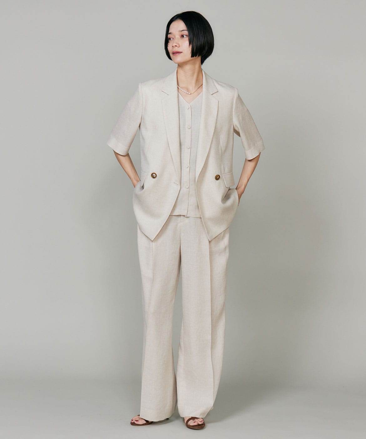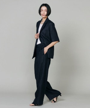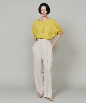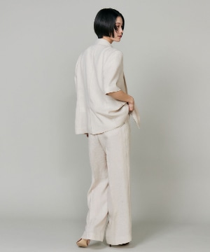 天然の麻の生成りのような深みのある色合いと表情で、麻調合繊の代名詞として知られるアイアス。トリアセテートは森林を守る為のFSC(R)認証を取得したサスティナブル素材です。ナチュラルな風合いながらもシワになりにくく、吸湿速乾性もあります。