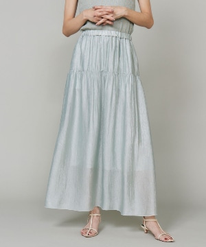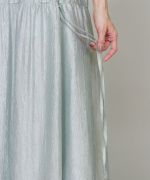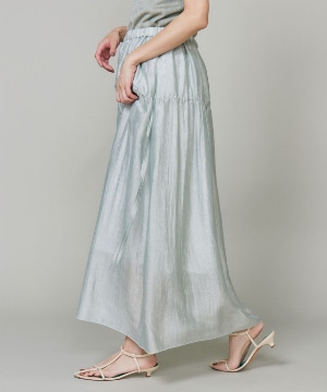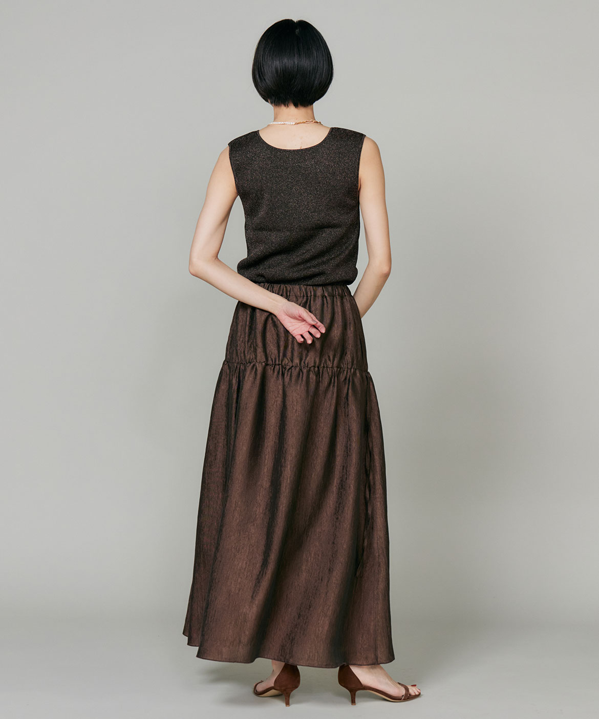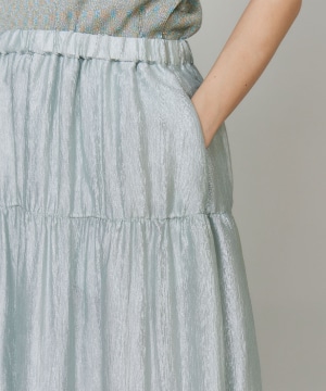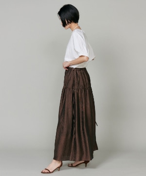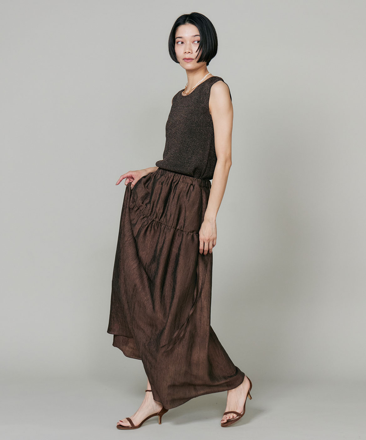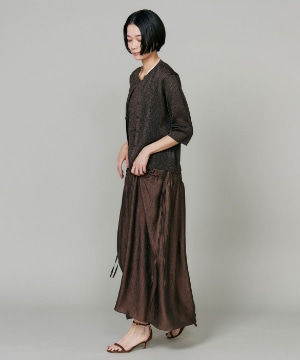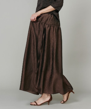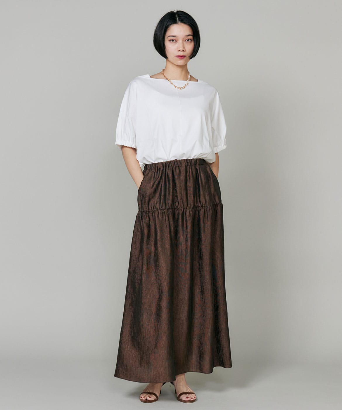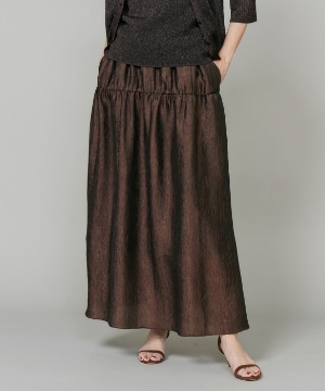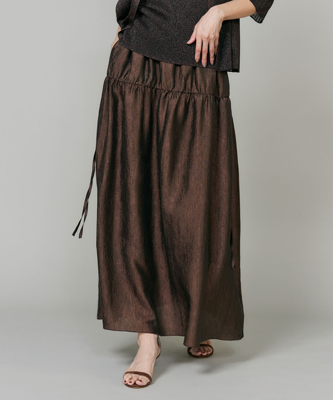 素材感を活かした表情豊かなギャザースカート。ウエストゴム仕様でイージーな着心地です。切り替え位置にゴムギャザーを施しアクセントをつけました。切り替え脇にドロスト風の共地リボンで表情をプラスしています。モード感のある長めのレングスもポイントです。