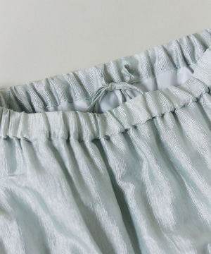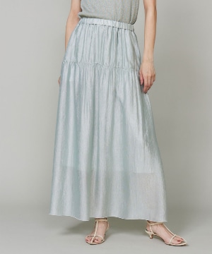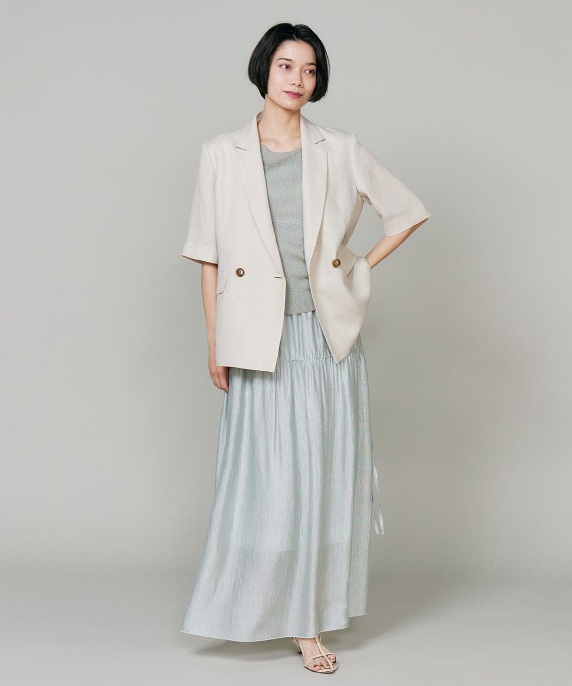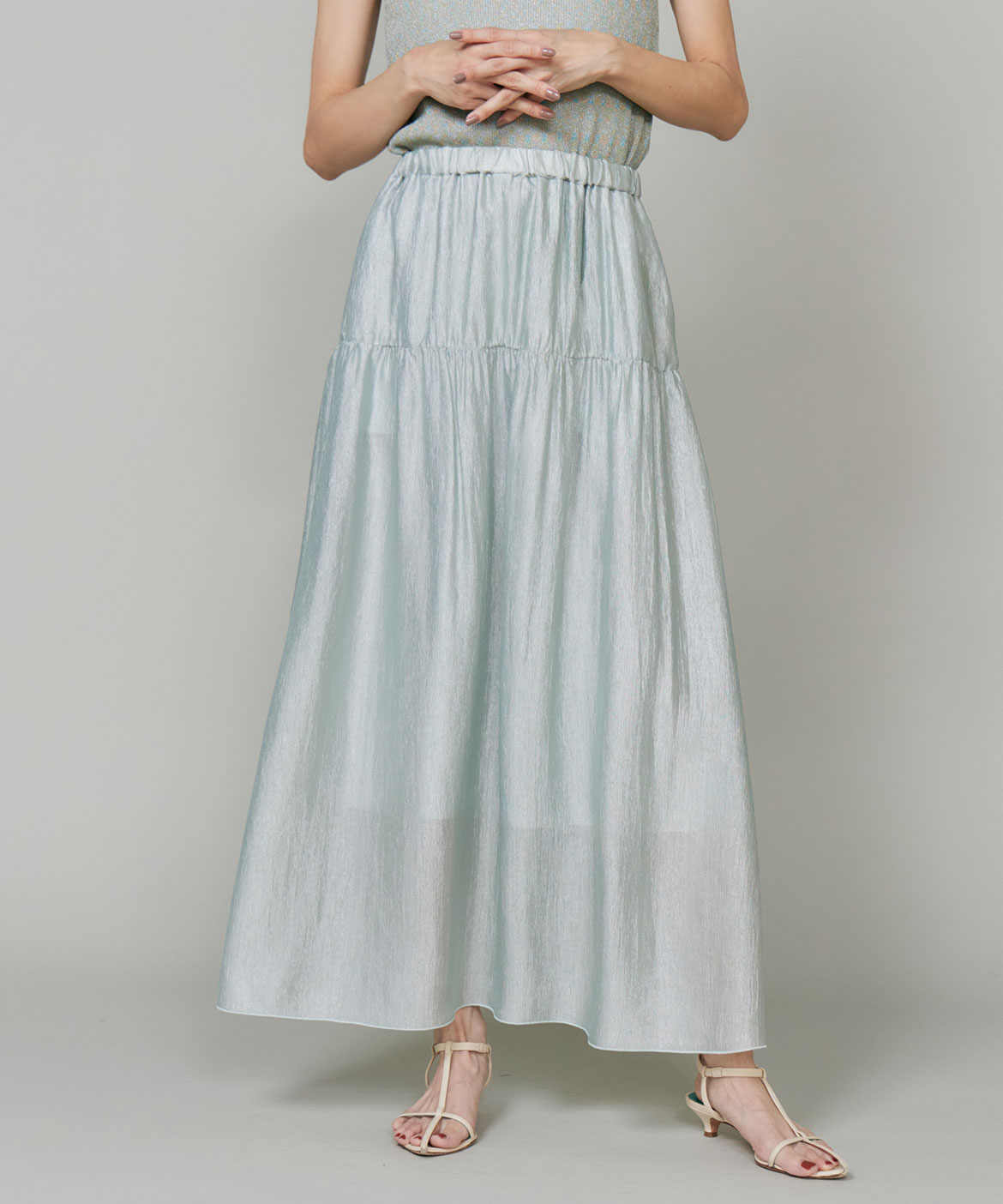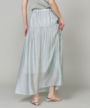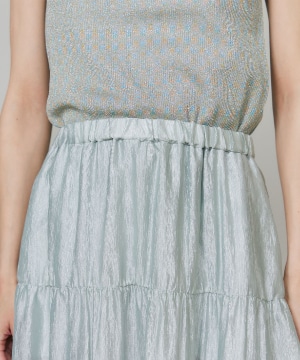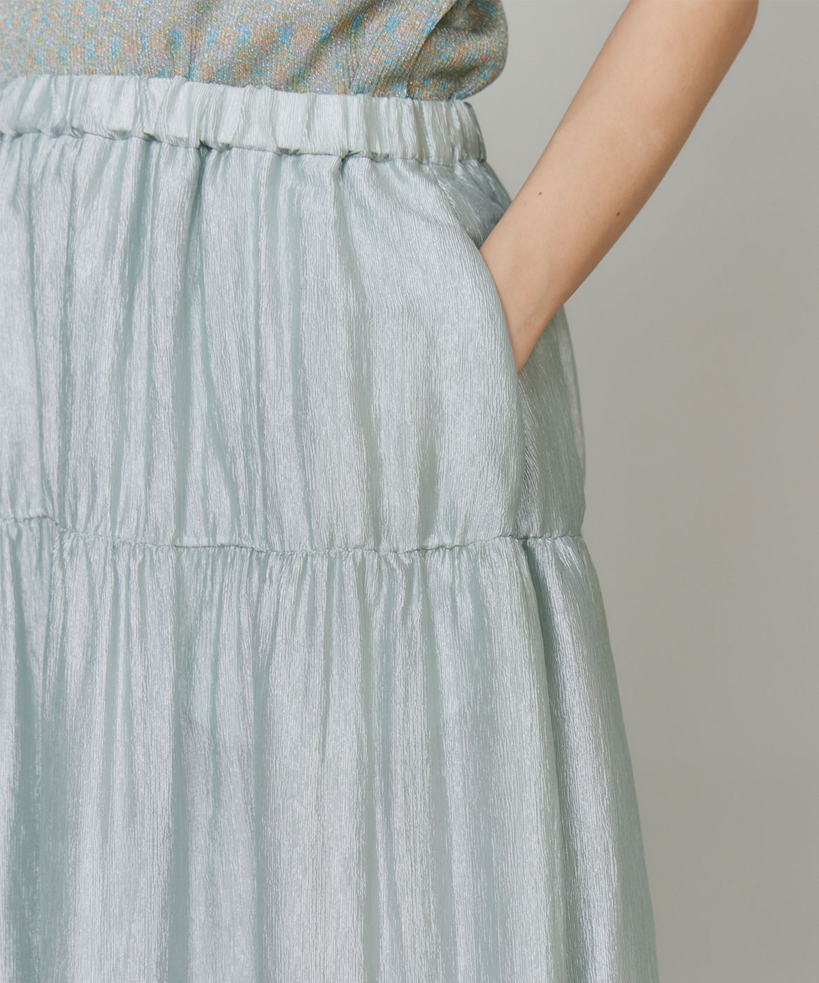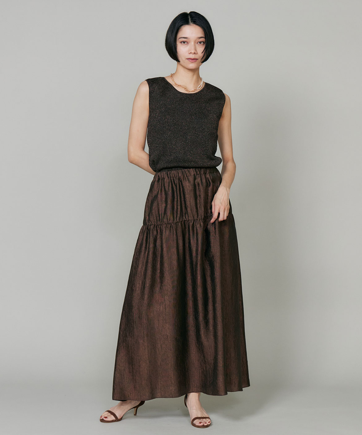 素材感を活かした表情豊かなギャザースカート。ウエストゴム仕様でイージーな着心地です。切り替え位置にゴムギャザーを施しアクセントをつけました。切り替え脇にドロスト風の共地リボンで表情をプラスしています。モード感のある長めのレングスもポイントです。