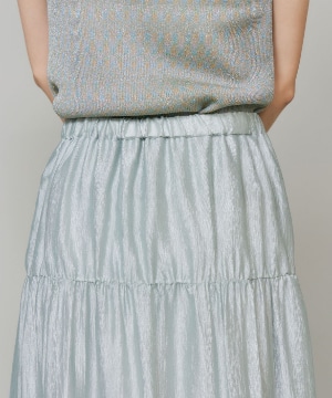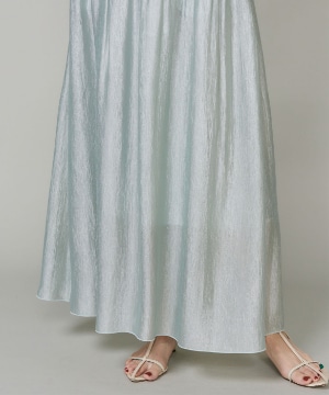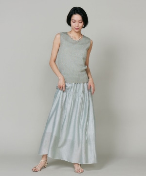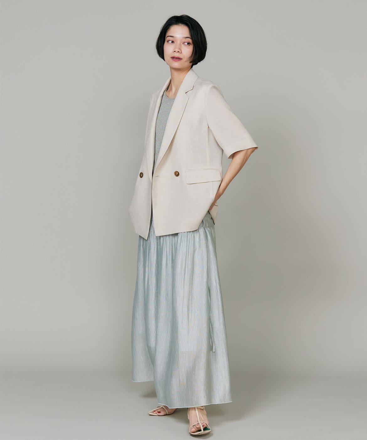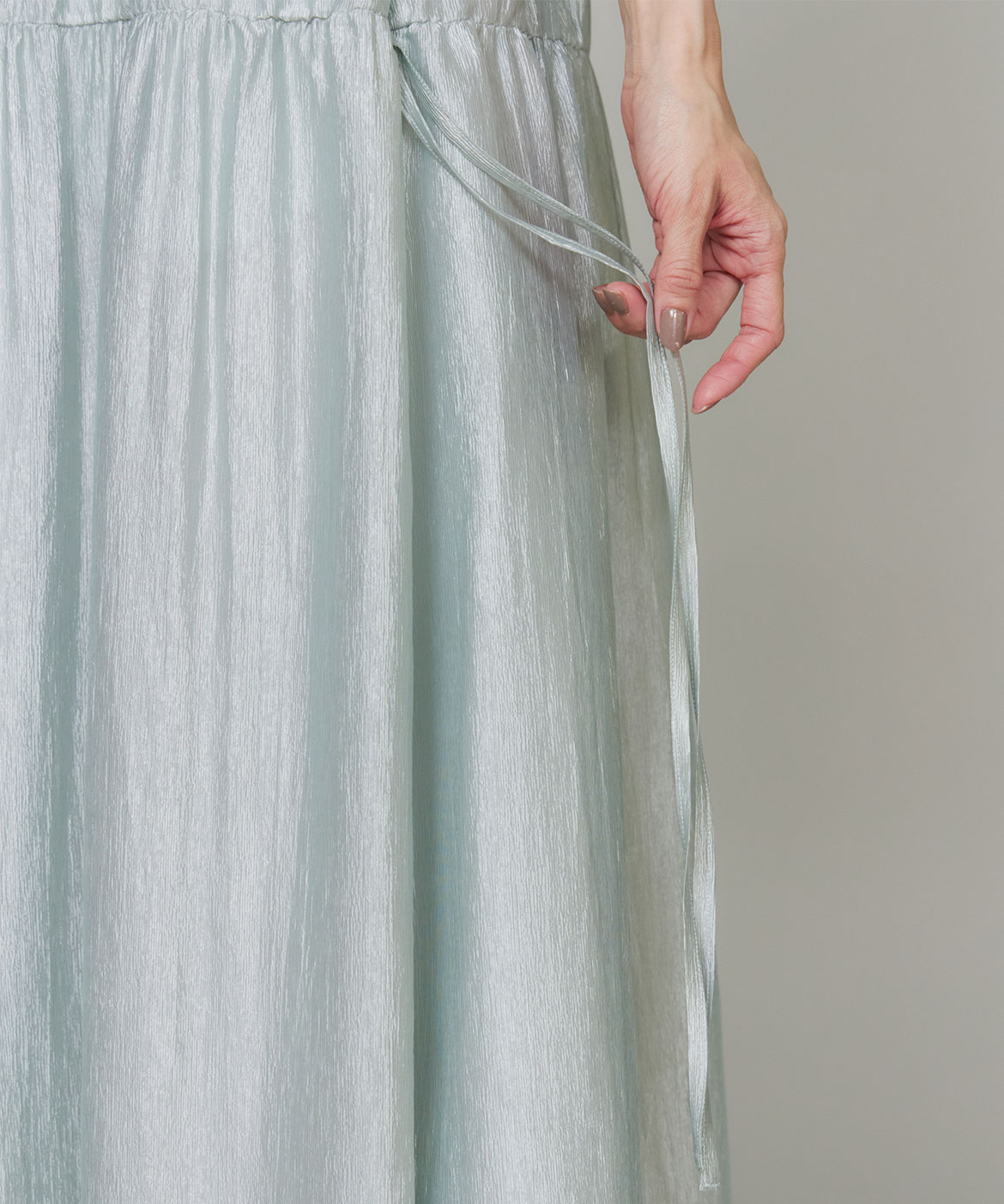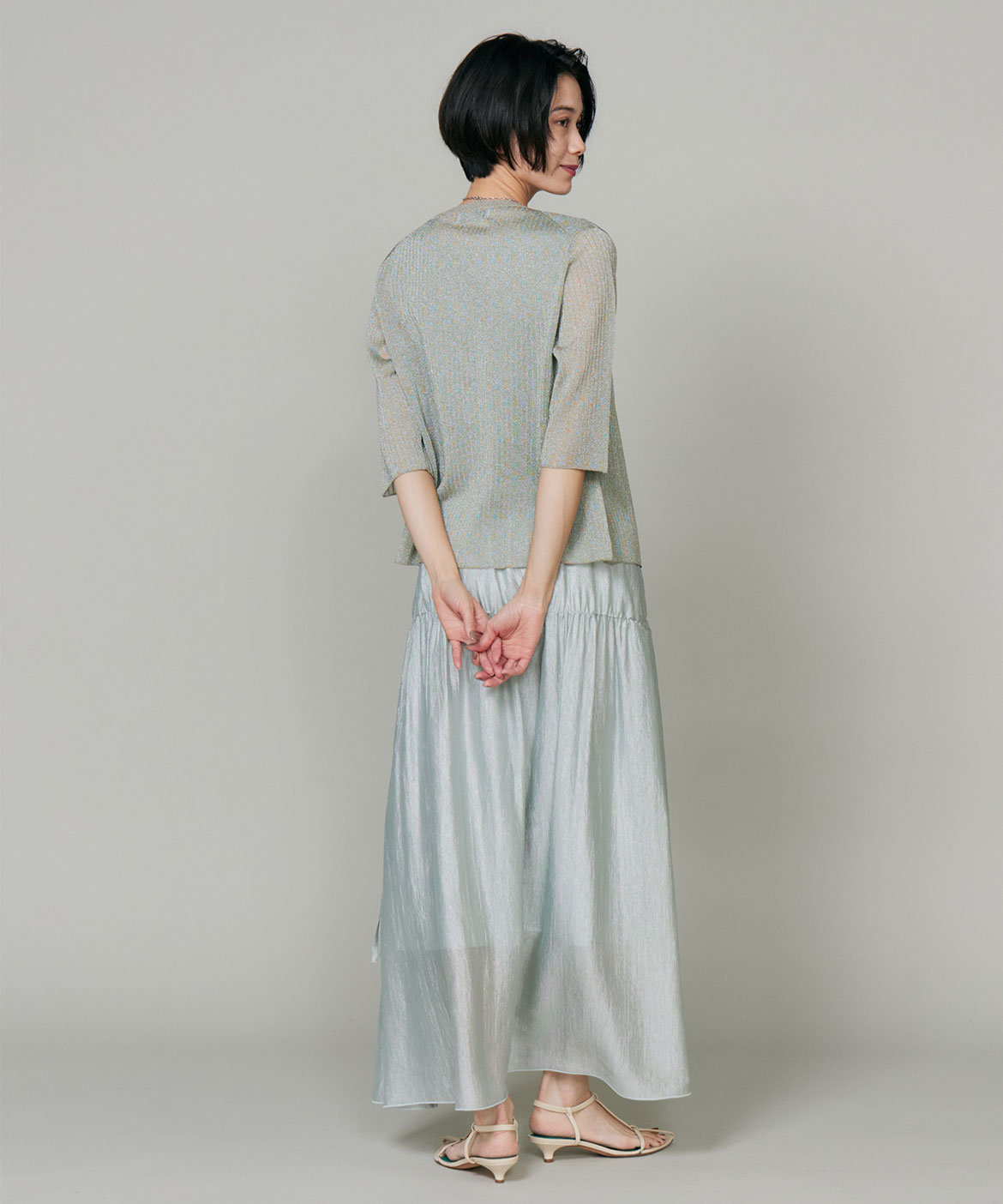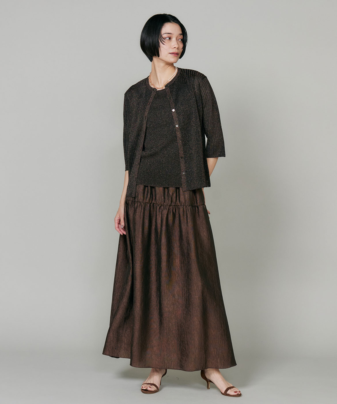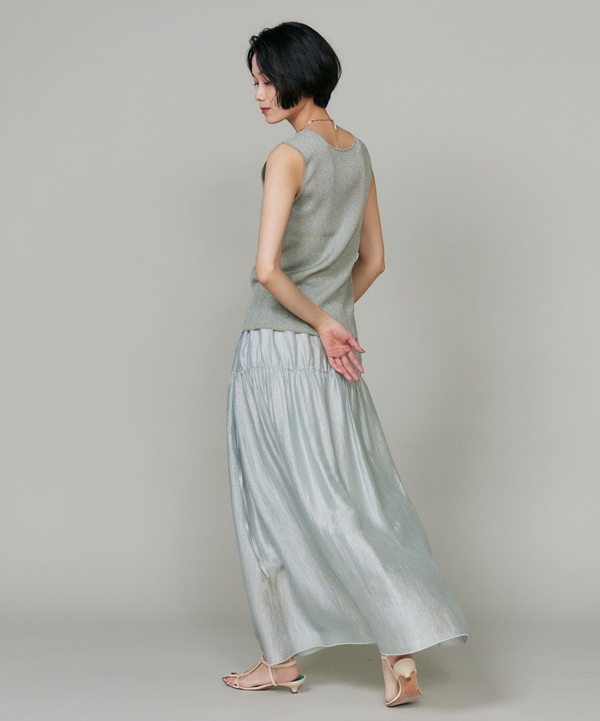 素材感を活かした表情豊かなギャザースカート。ウエストゴム仕様でイージーな着心地です。切り替え位置にゴムギャザーを施しアクセントをつけました。切り替え脇にドロスト風の共地リボンで表情をプラスしています。モード感のある長めのレングスもポイントです。
